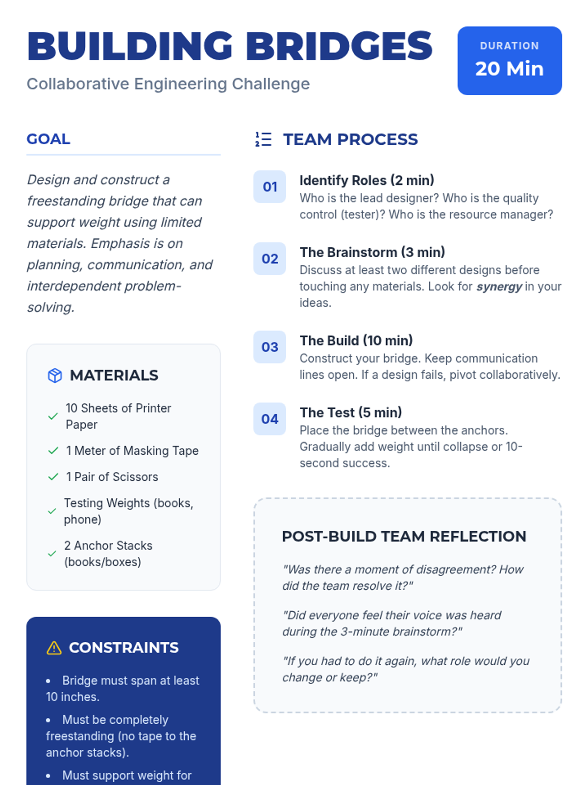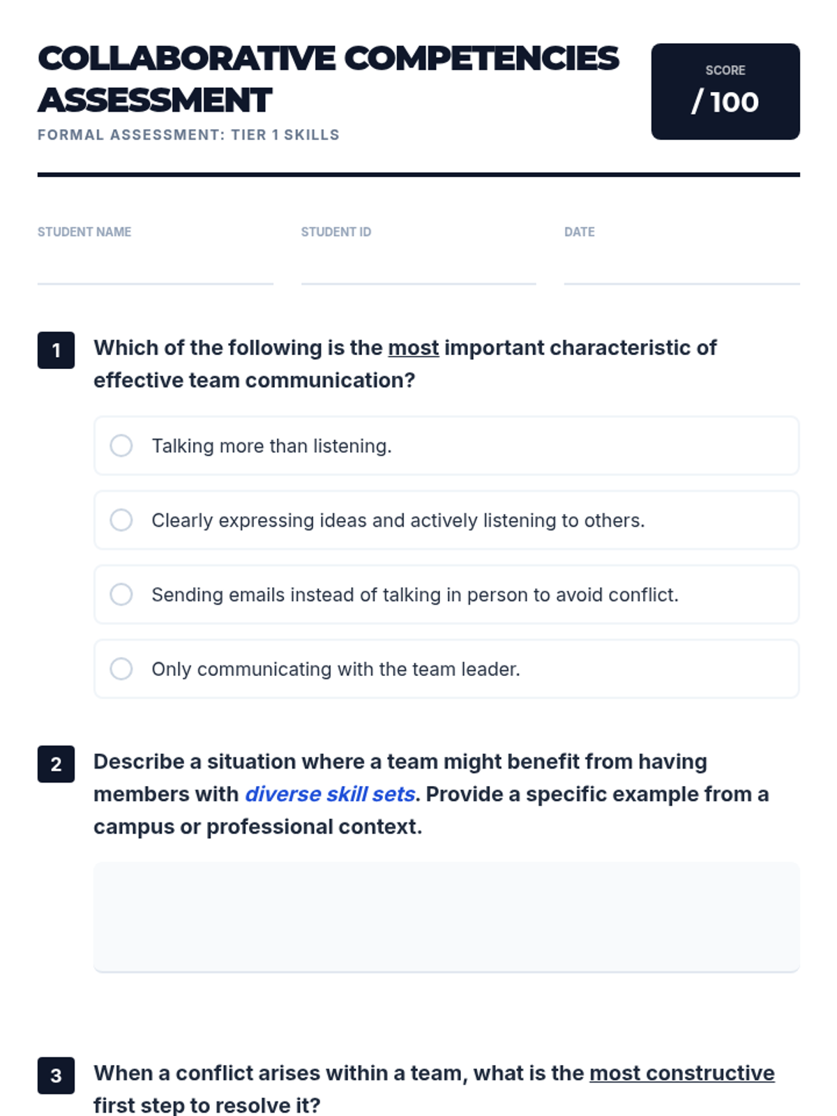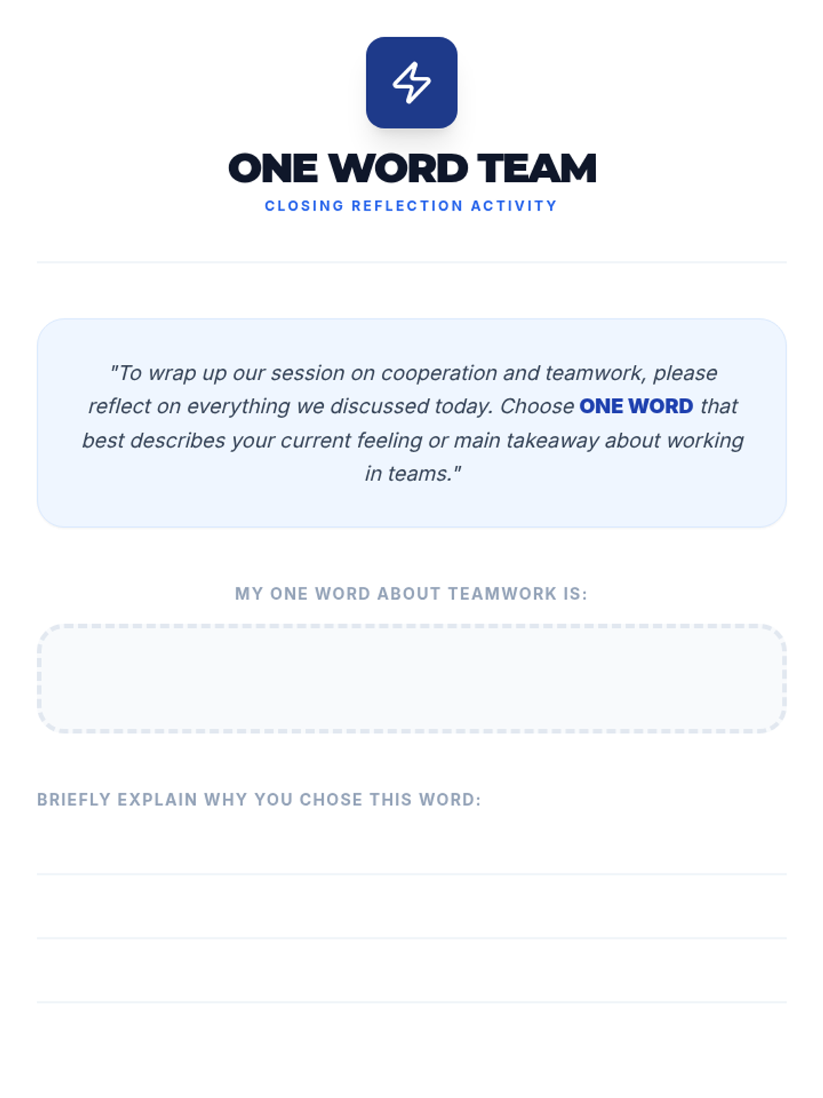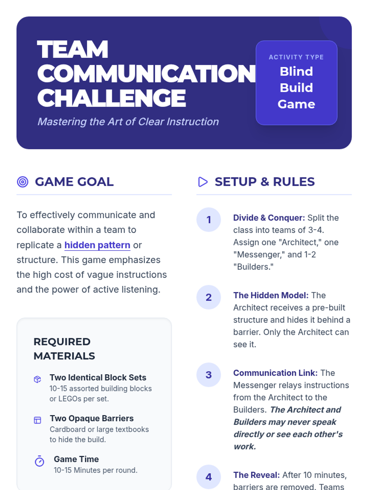 This lesson empowers university students with essential cooperation and teamwork skills through interactive discussions, hands-on activities, and reflective exercises. Over one hour, students explore definitions, the concept of synergy, and practical strategies for effective collaboration in academic and professional settings.
