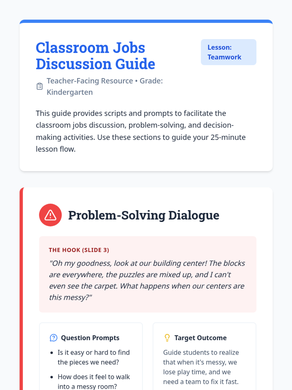 A high-energy, interactive lesson for Kindergarten students to explore the power of cooperation through classroom jobs and a collaborative game. Students learn how individual roles and group decisions create a better learning environment for everyone.