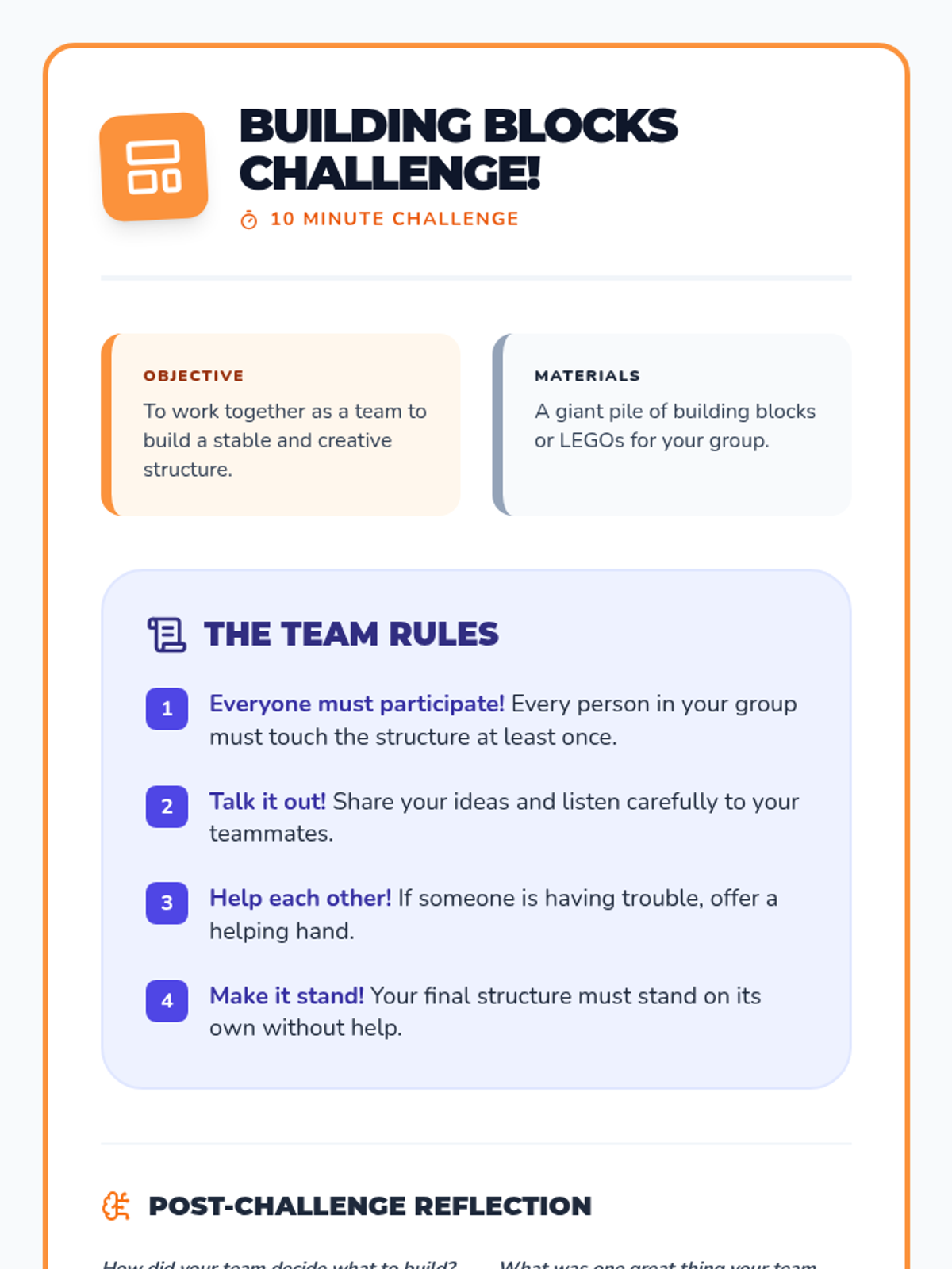 A hands-on team-building lesson focused on impulse control for K-3 students in therapeutic settings. Students practice 'the pause' through a collaborative construction game where they must stop and go based on signals.