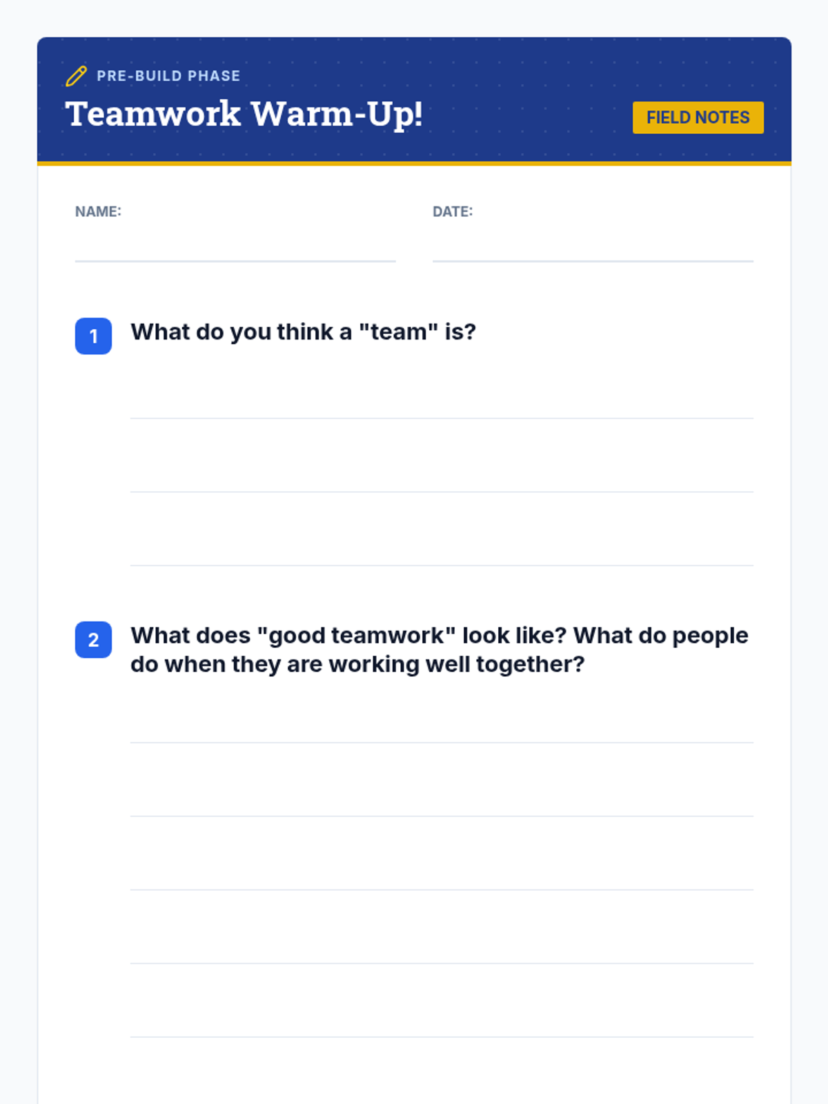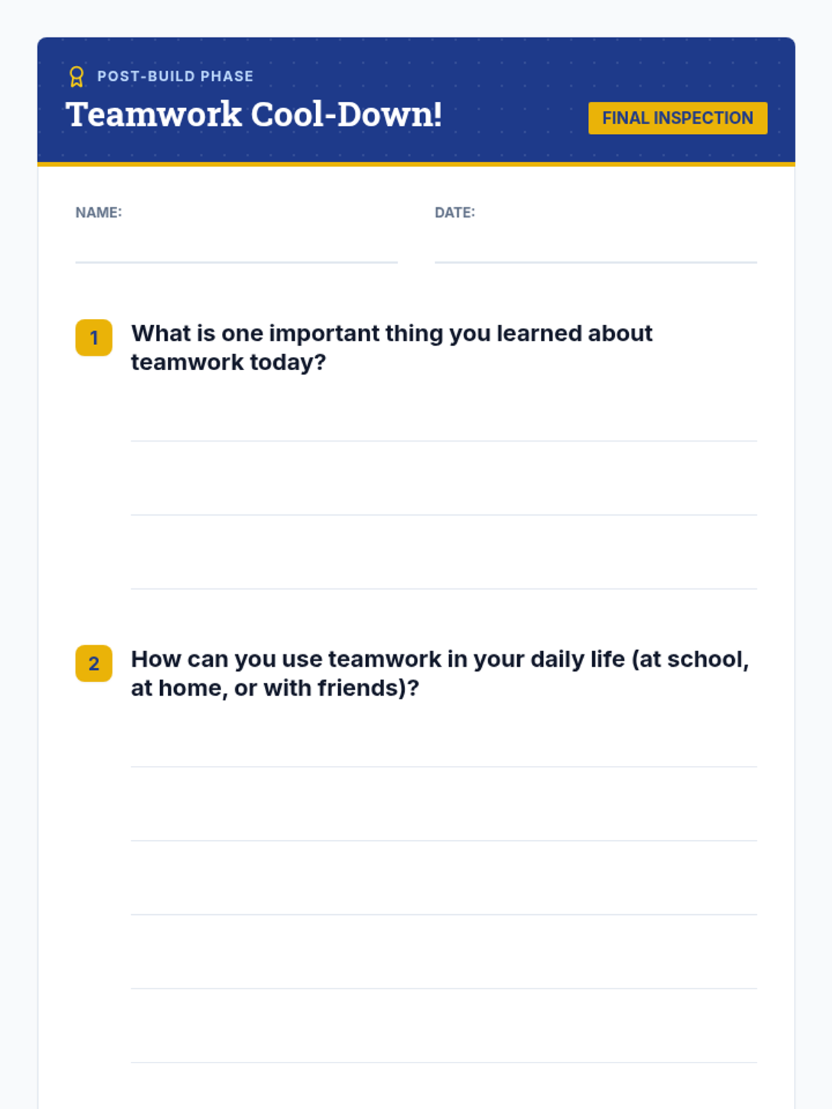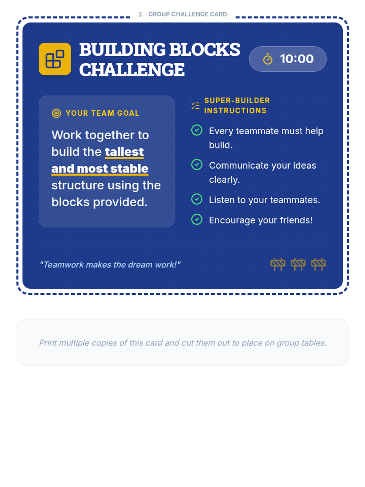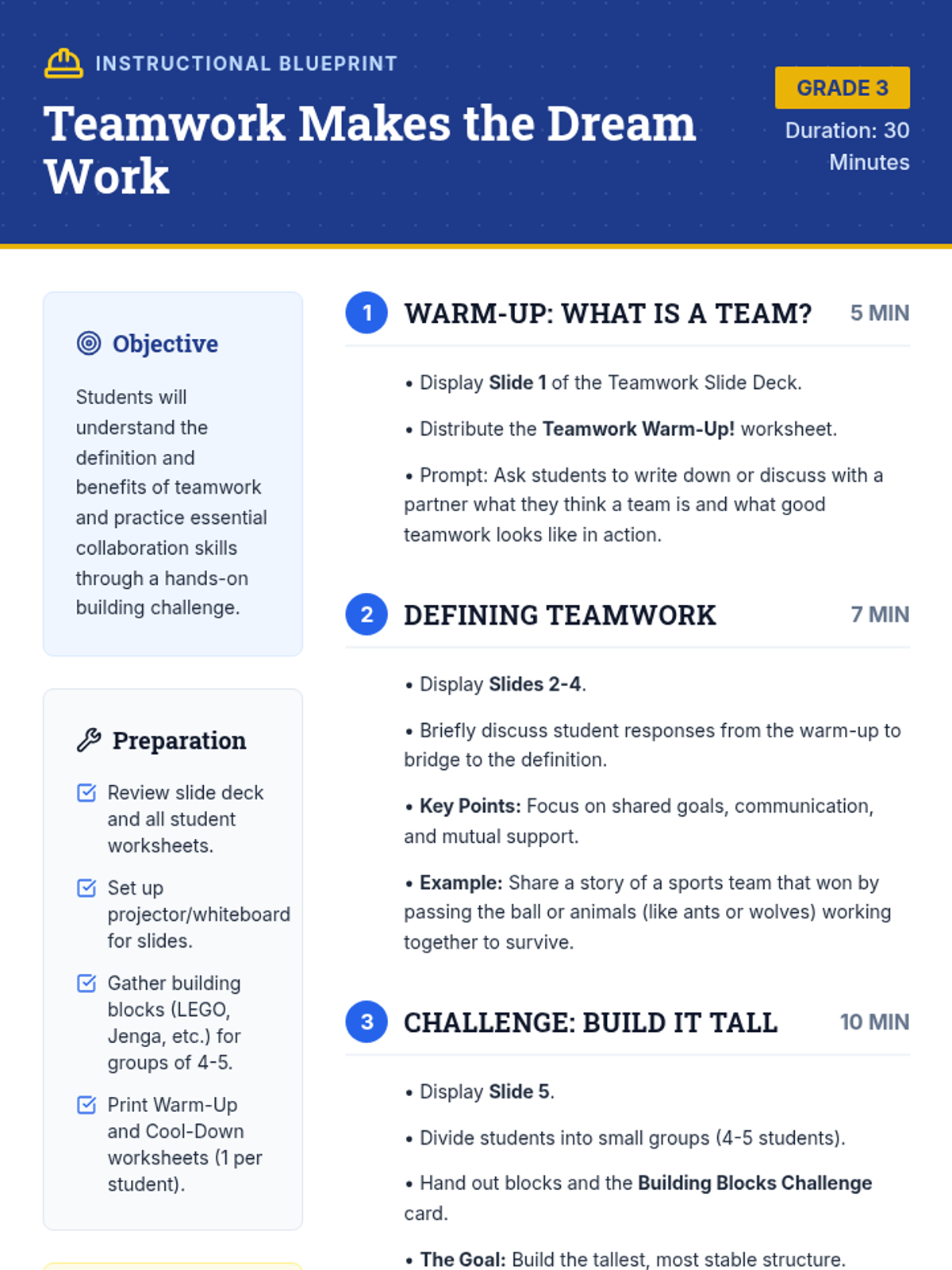 A 30-minute lesson for 3rd graders teaching the core concepts of teamwork, collaboration, and communication through a hands-on building challenge.