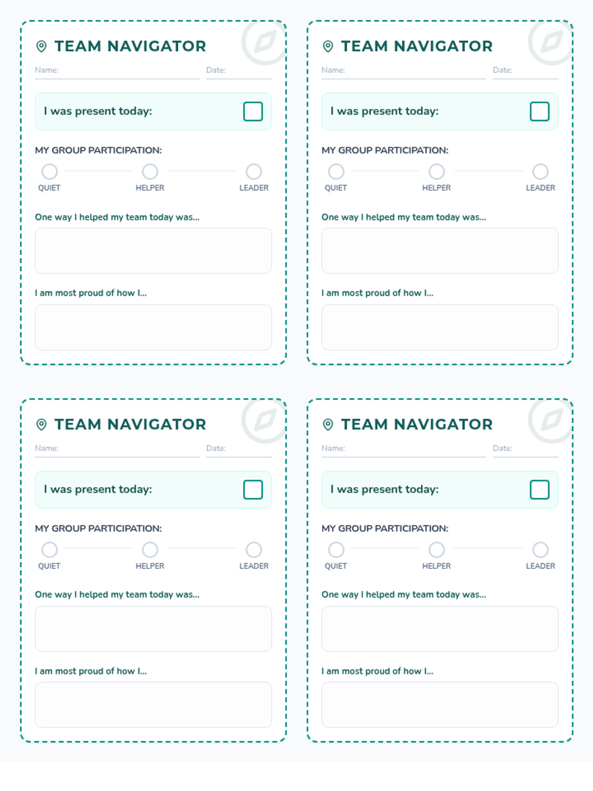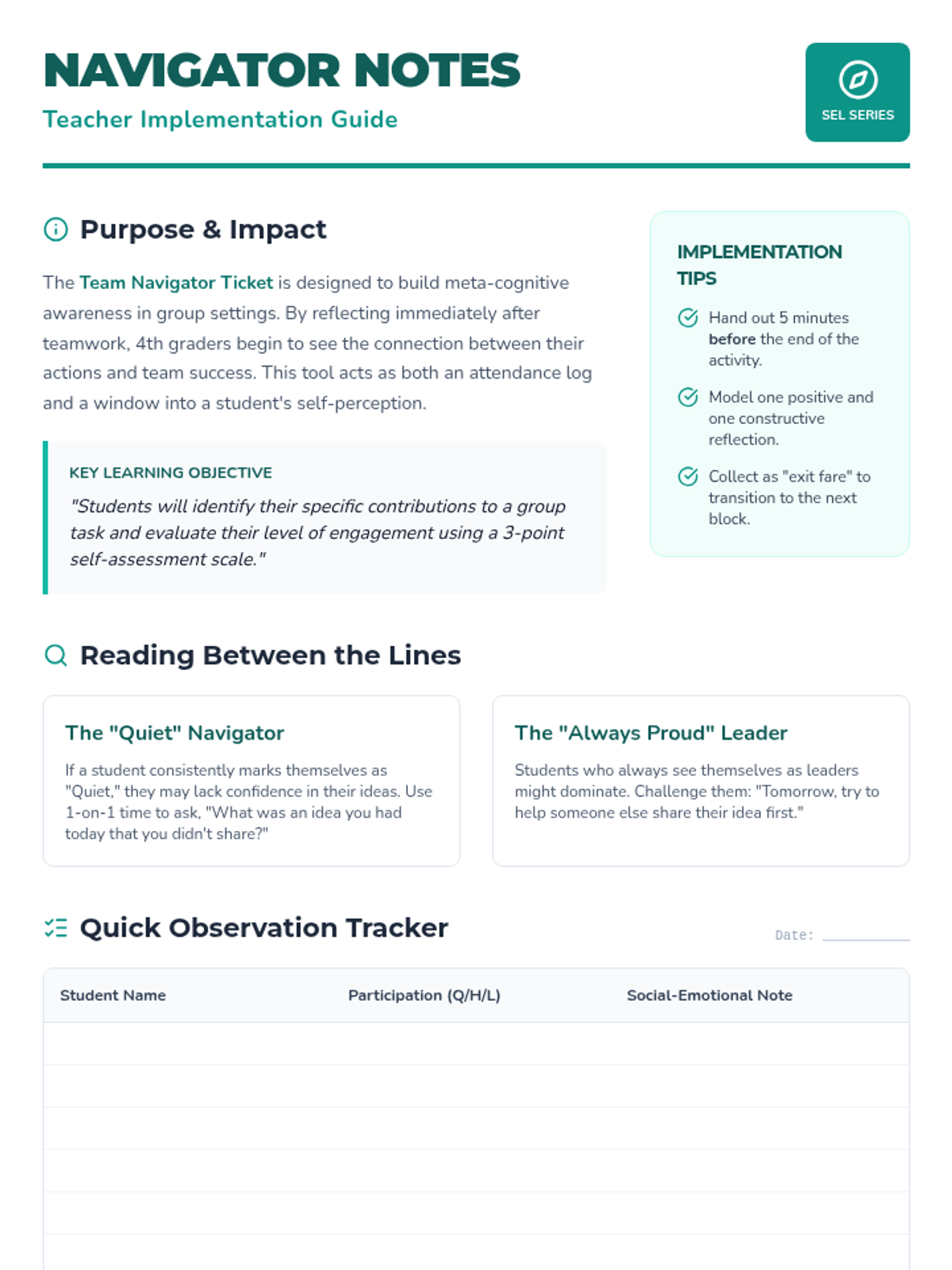 A short reflection tool designed to help 4th graders assess their self-awareness and participation during group activities. Includes an exit ticket for students and a guide for teachers to track social-emotional growth.