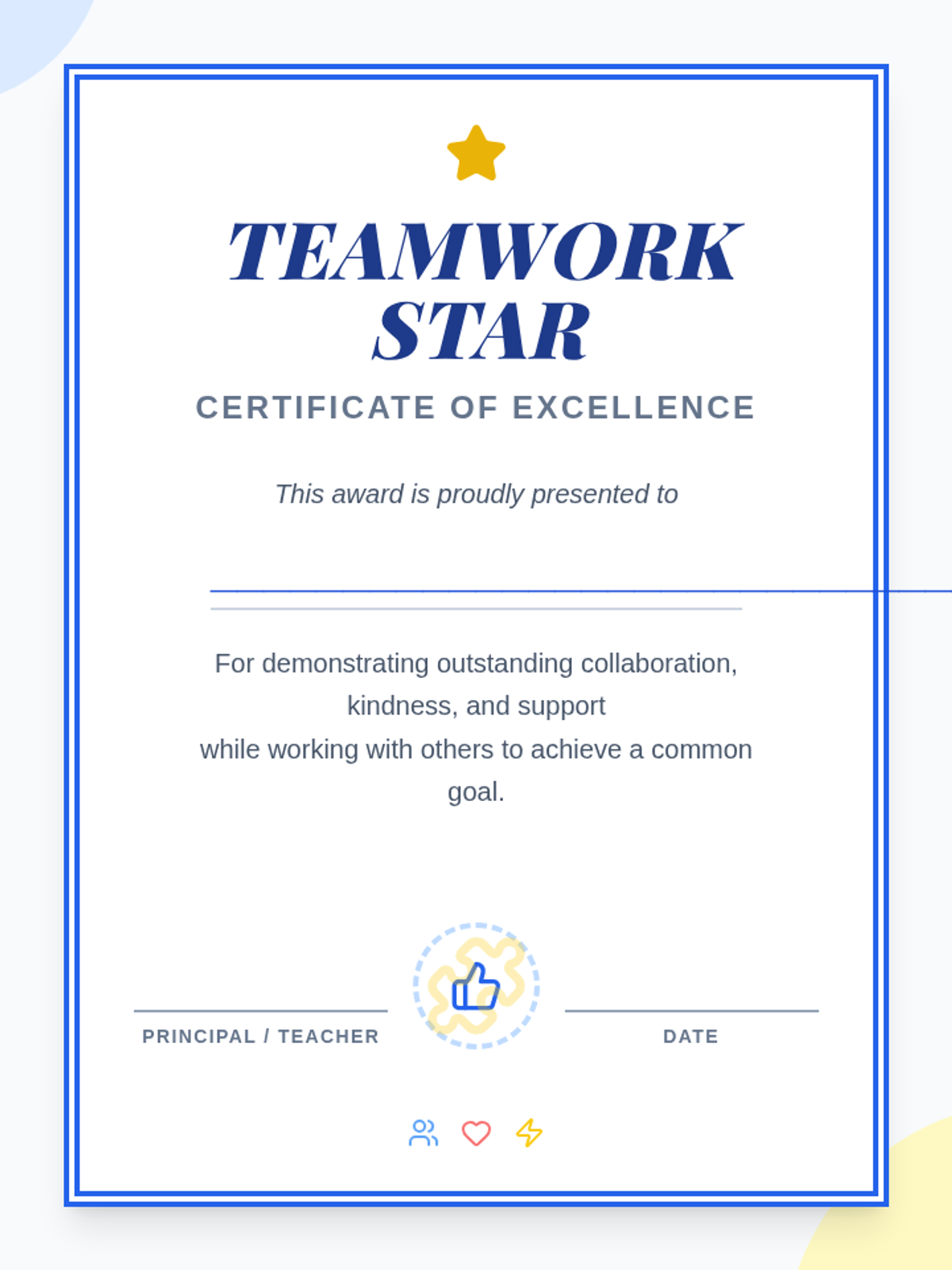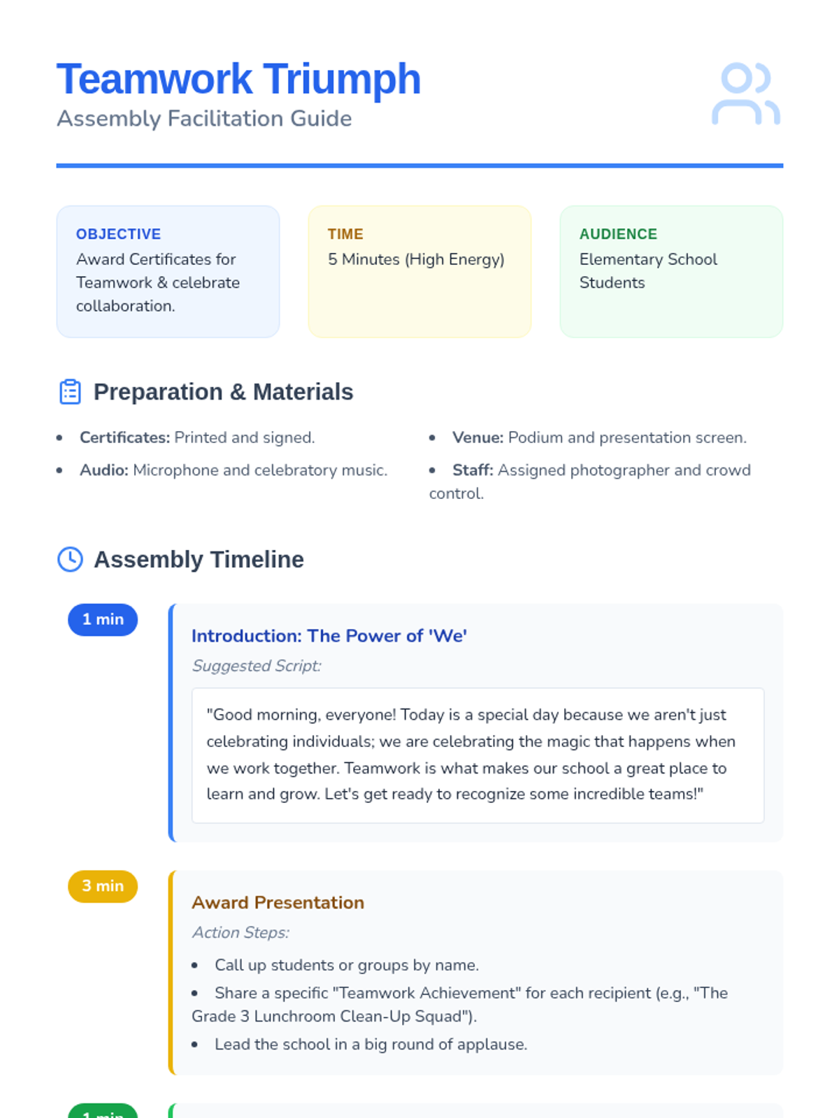 A short, high-energy assembly designed to celebrate student collaboration and award teamwork certificates, fostering a positive school culture.