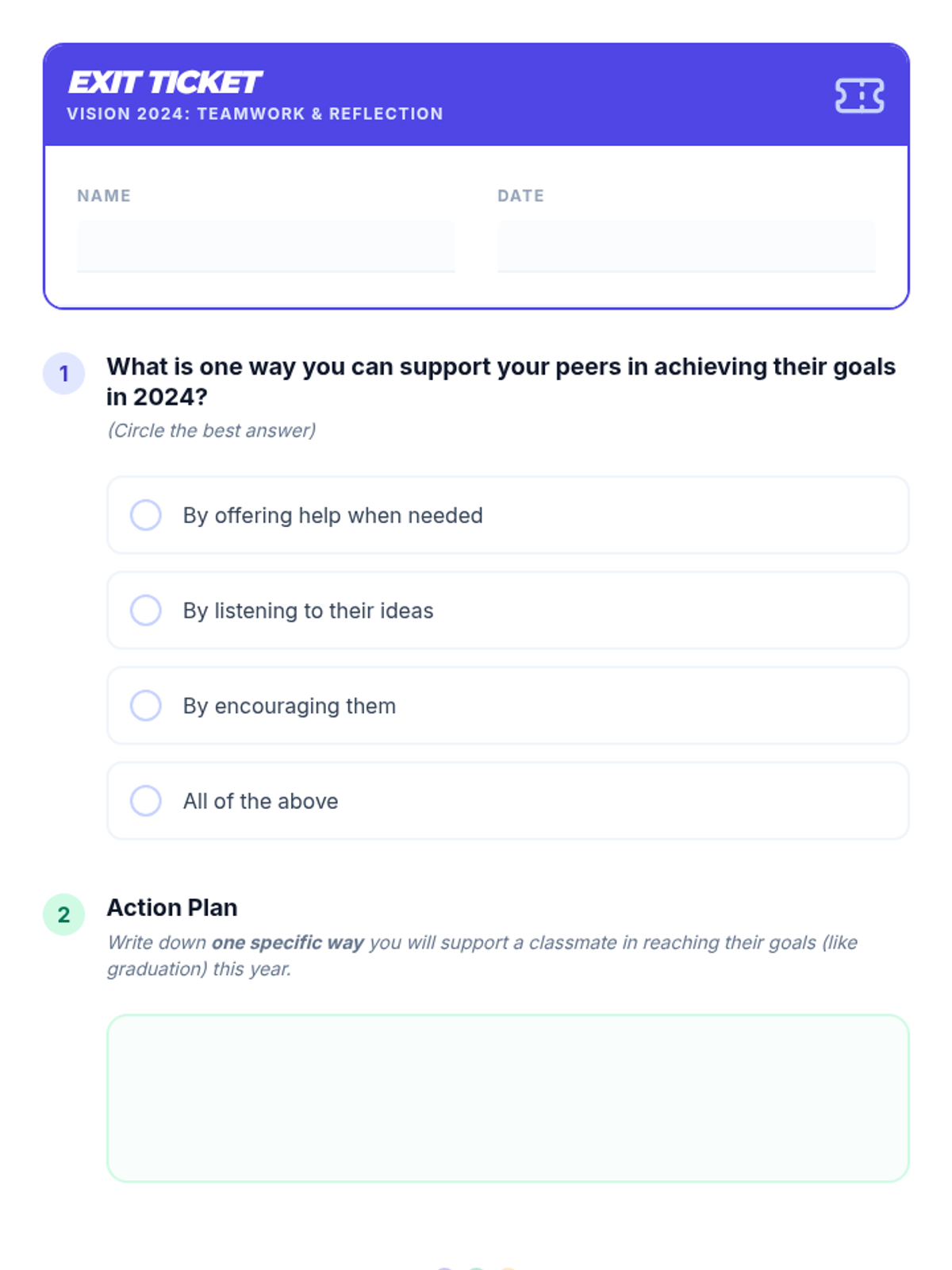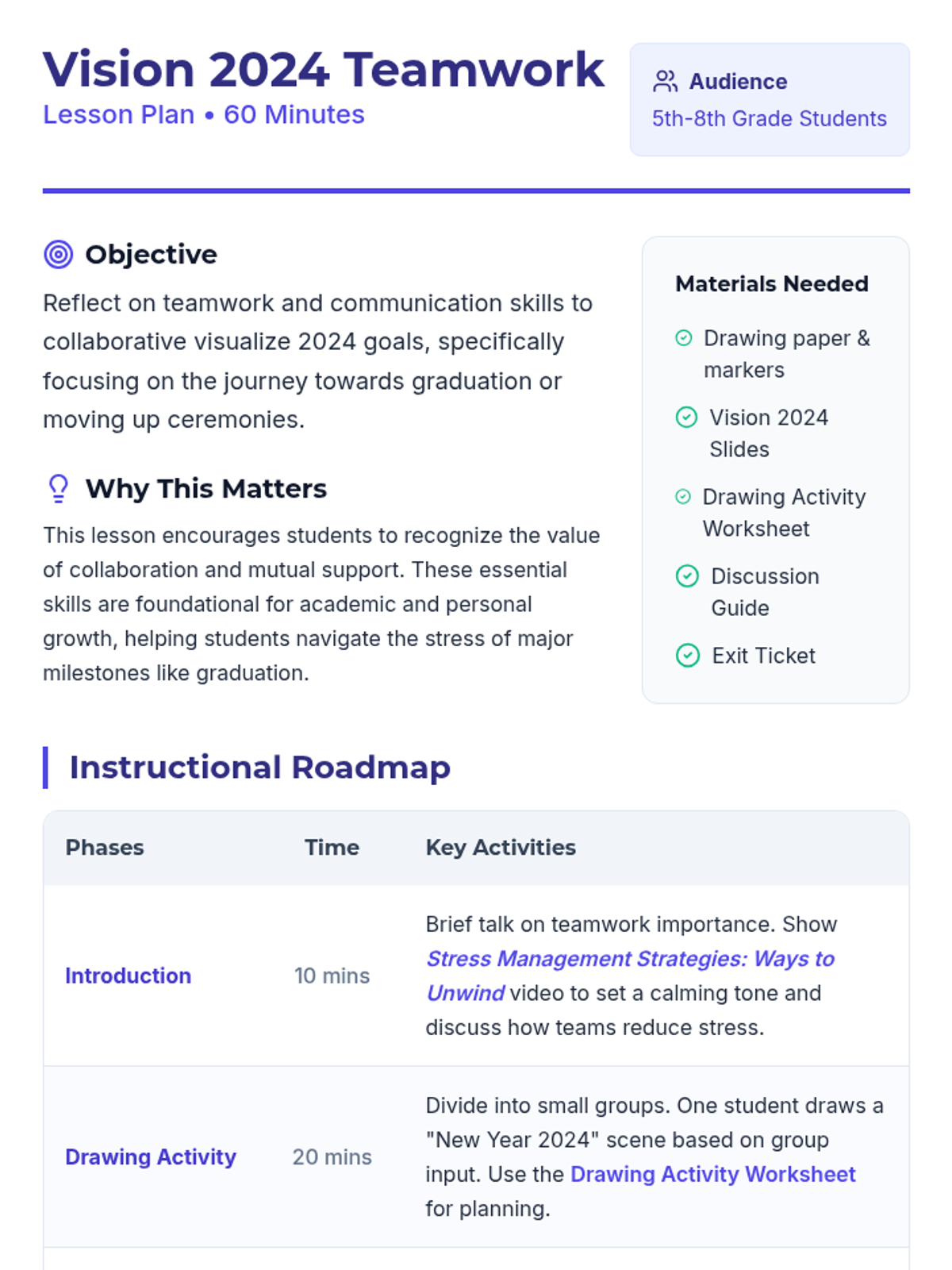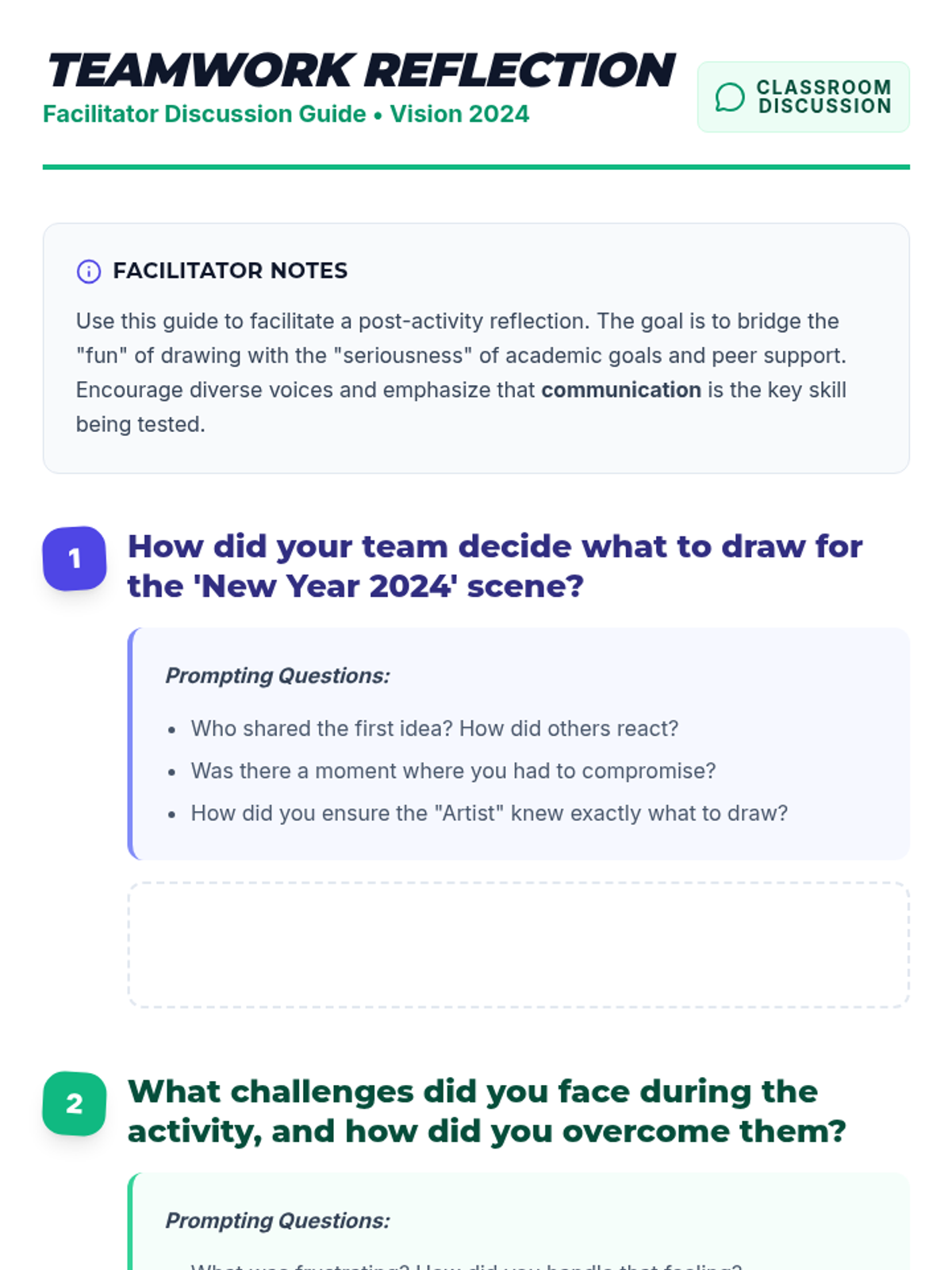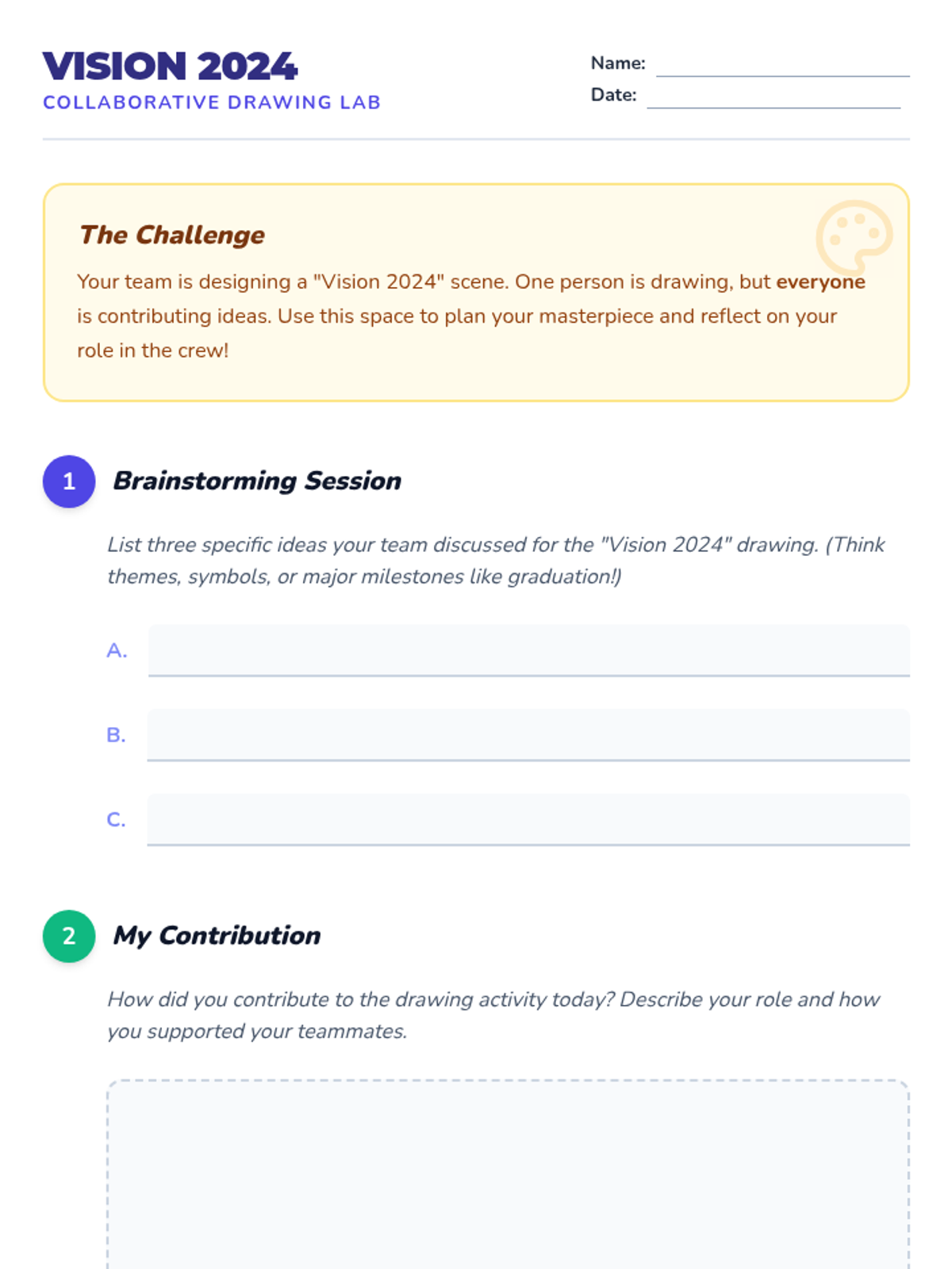 A collaborative drawing and reflection lesson focused on teamwork, communication, and goal-setting for 2024. Students work together to visualize their collective future while building interpersonal skills.