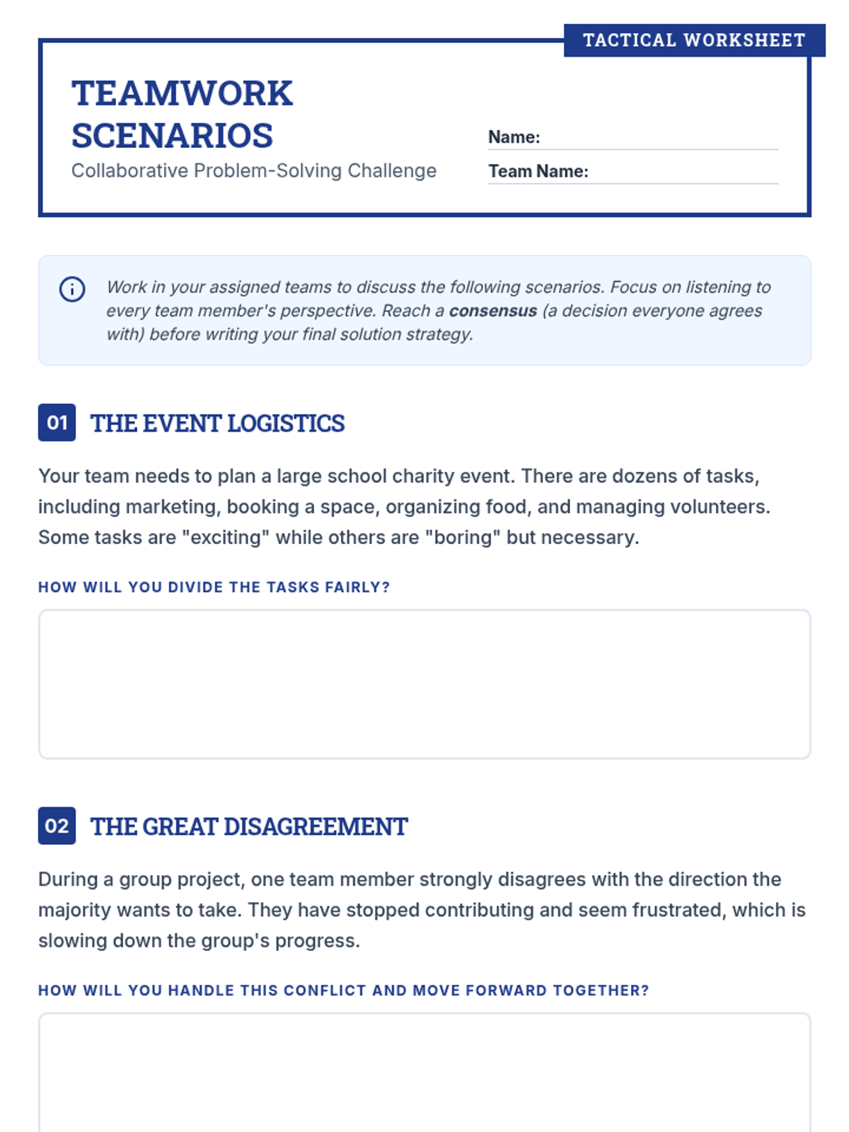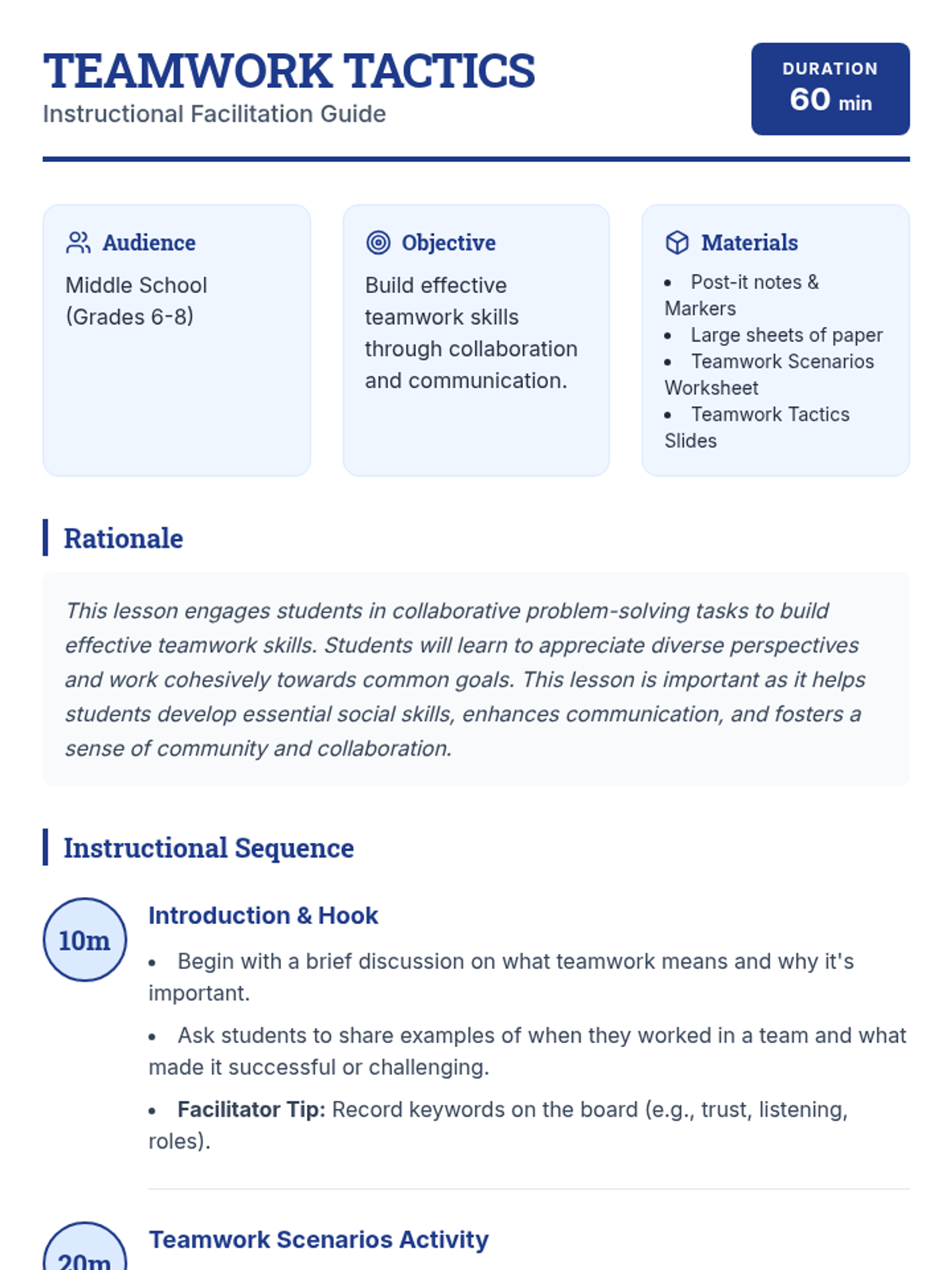 This lesson engages students in collaborative problem-solving tasks to build effective teamwork skills through scenarios and reflection. Students learn to appreciate diverse perspectives and work cohesively towards common goals in a middle school setting.