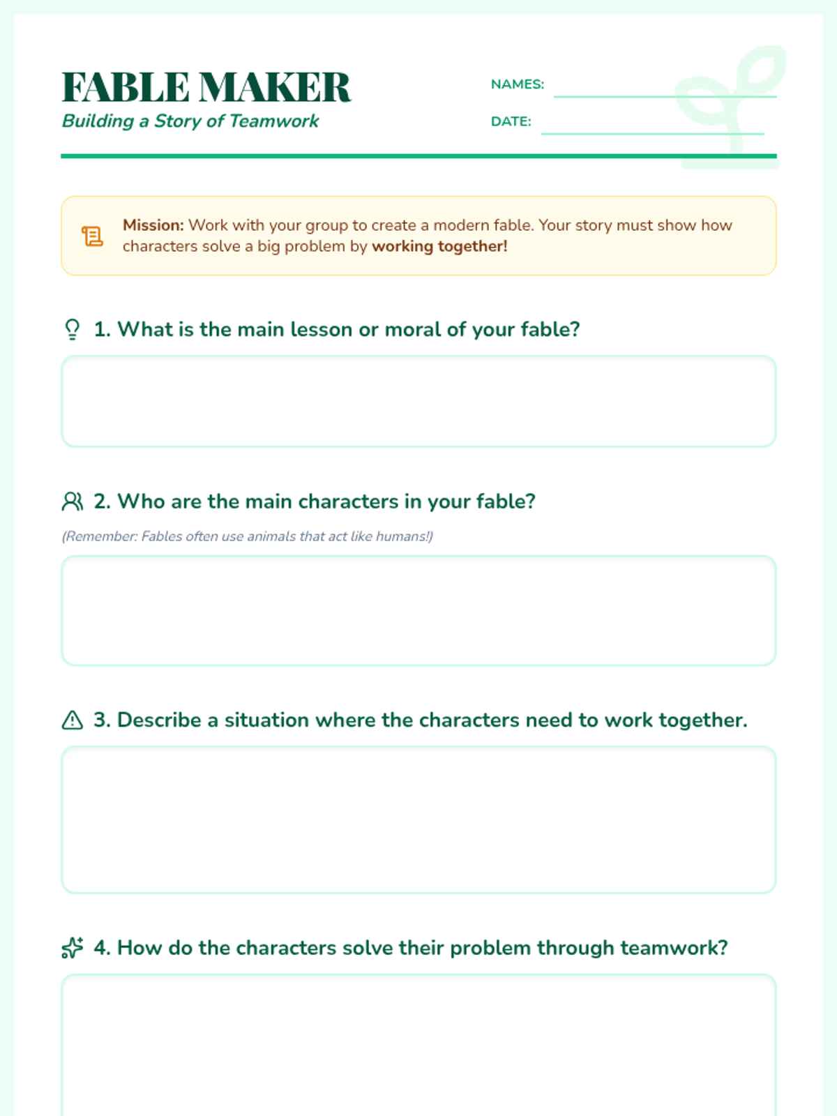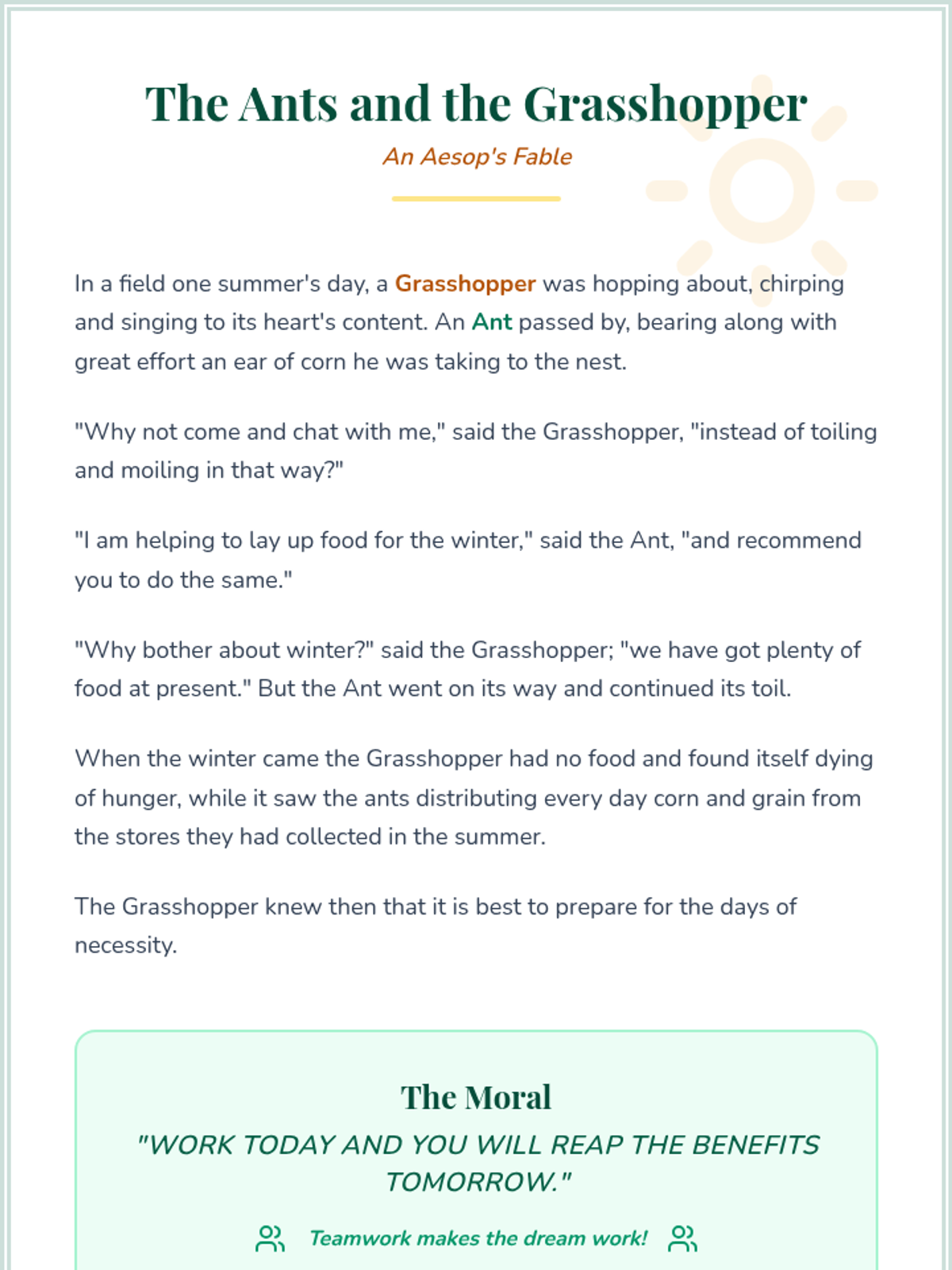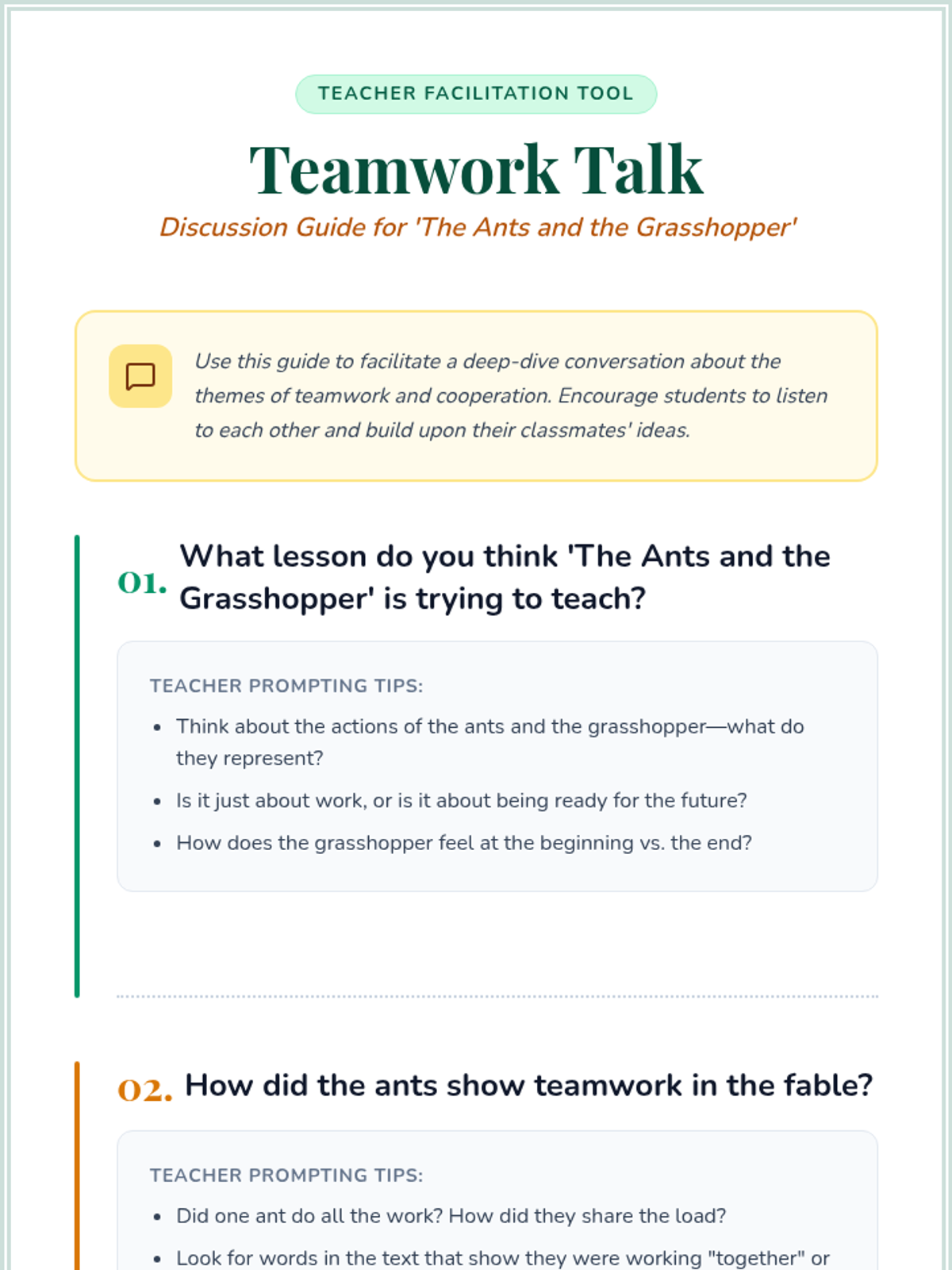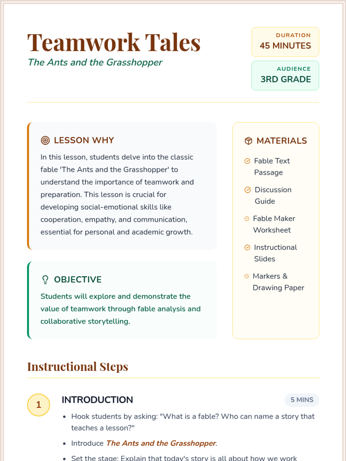 Students explore the classic fable 'The Ants and the Grasshopper' to learn about the importance of teamwork and preparation. They will analyze characters' choices and collaborate in groups to write their own modern fable about cooperation.