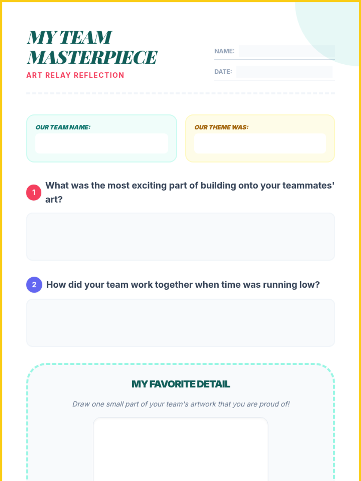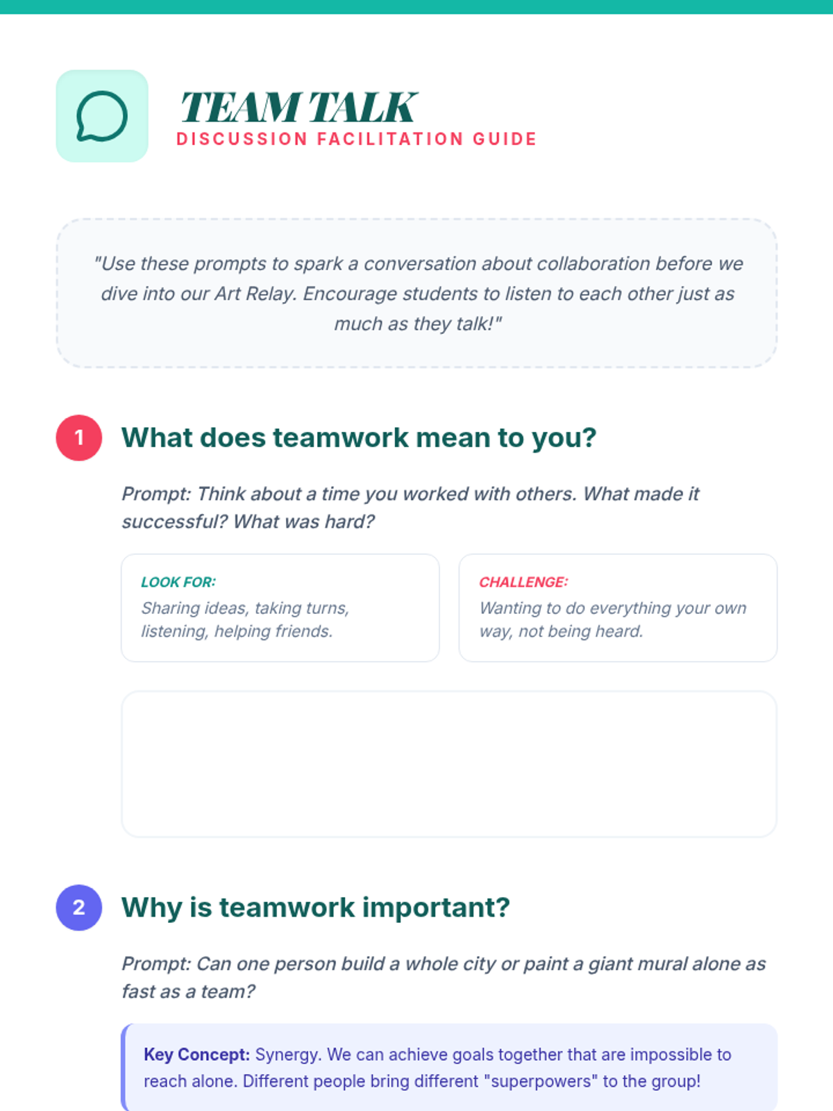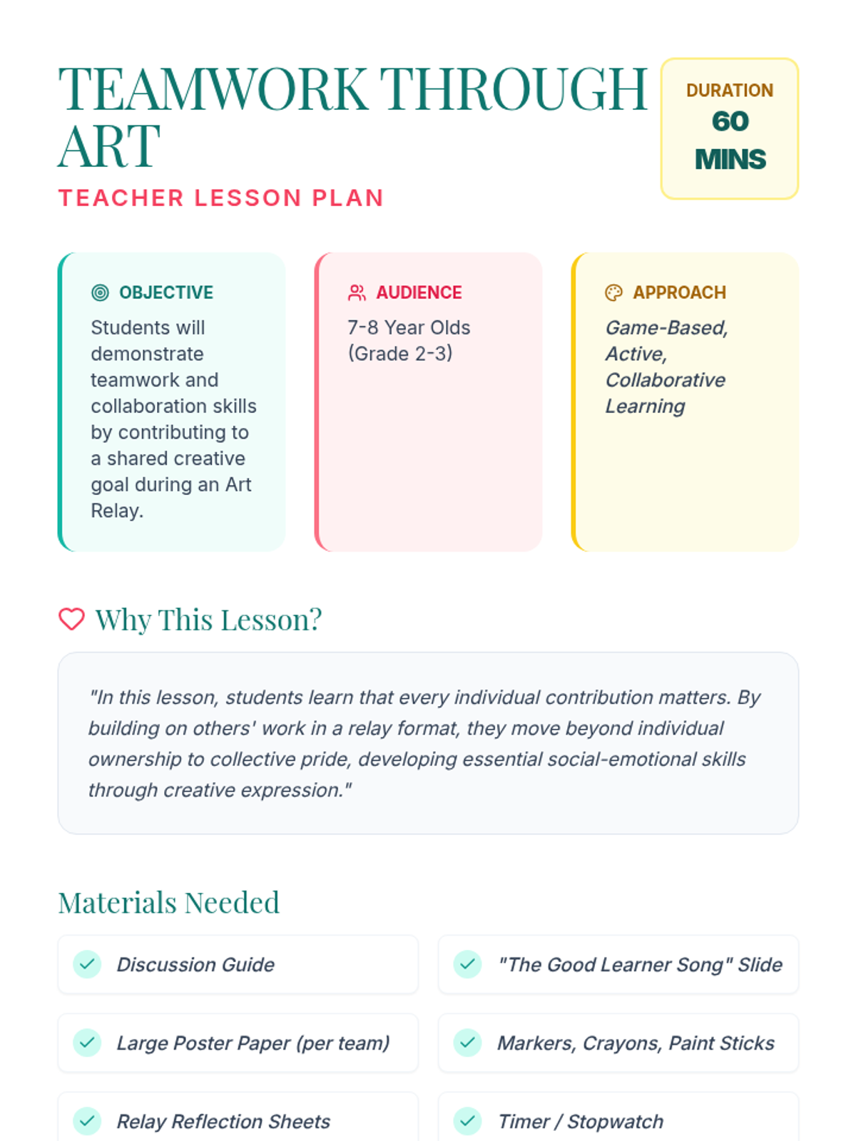 A collaborative art lesson where students practice teamwork through a high-energy Art Relay and group discussion. Students learn the value of individual contributions to a shared goal while developing social skills.