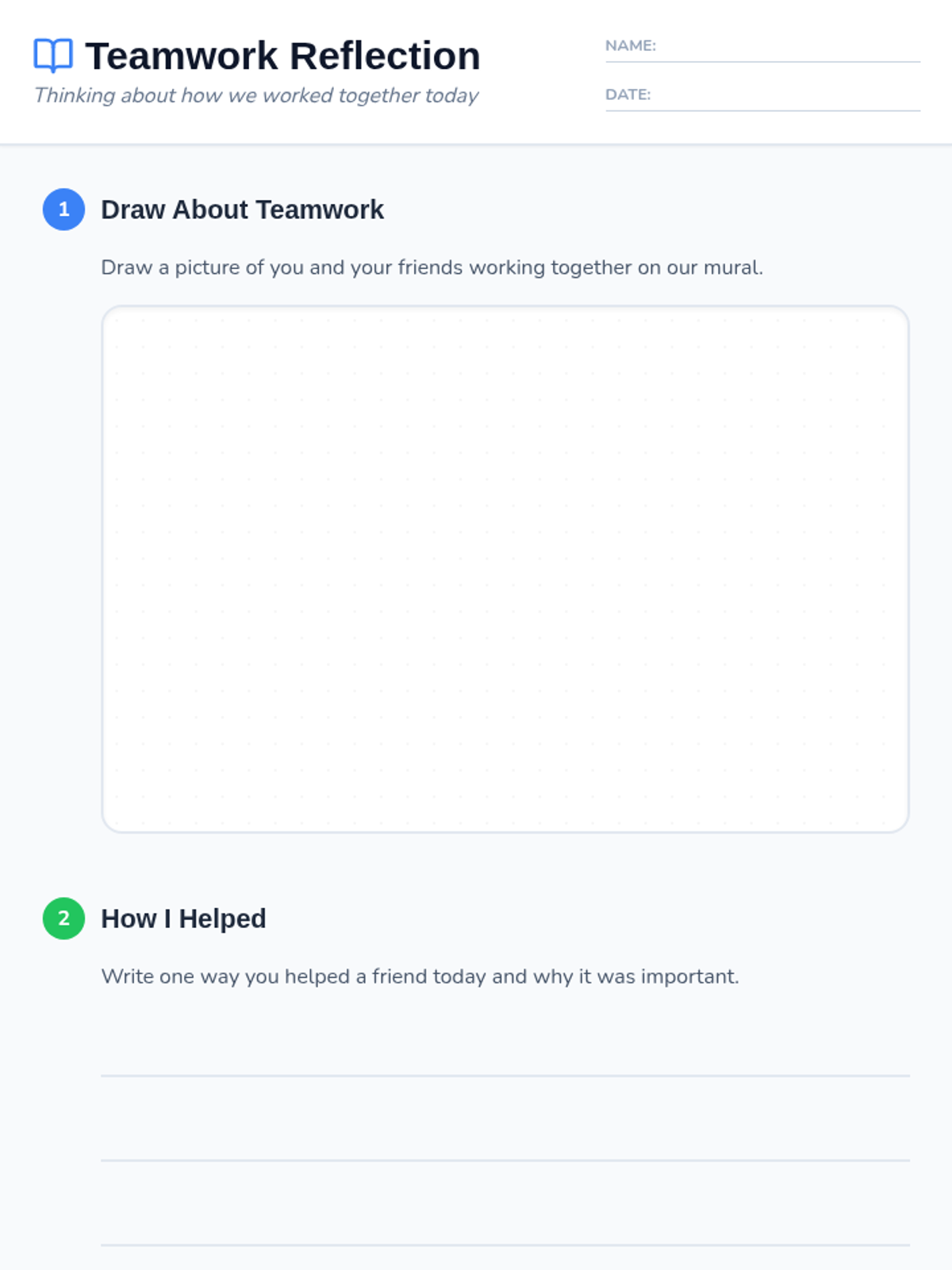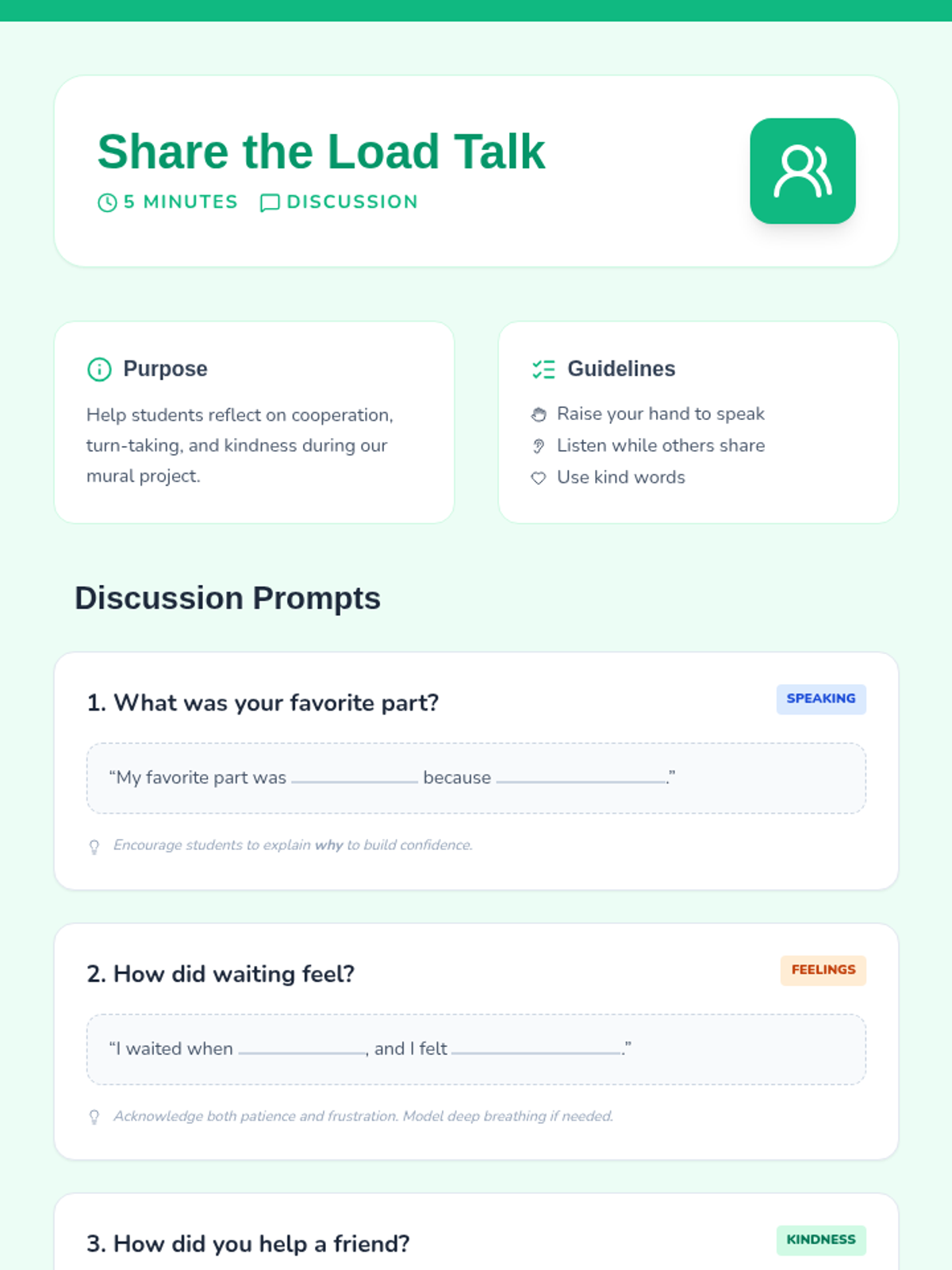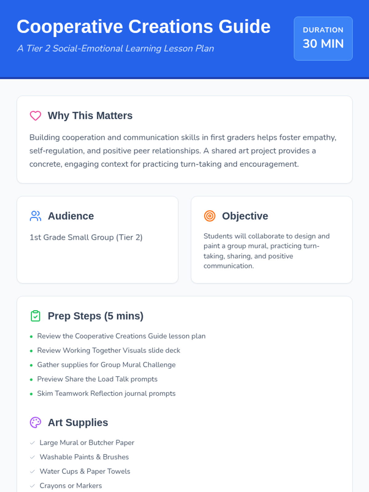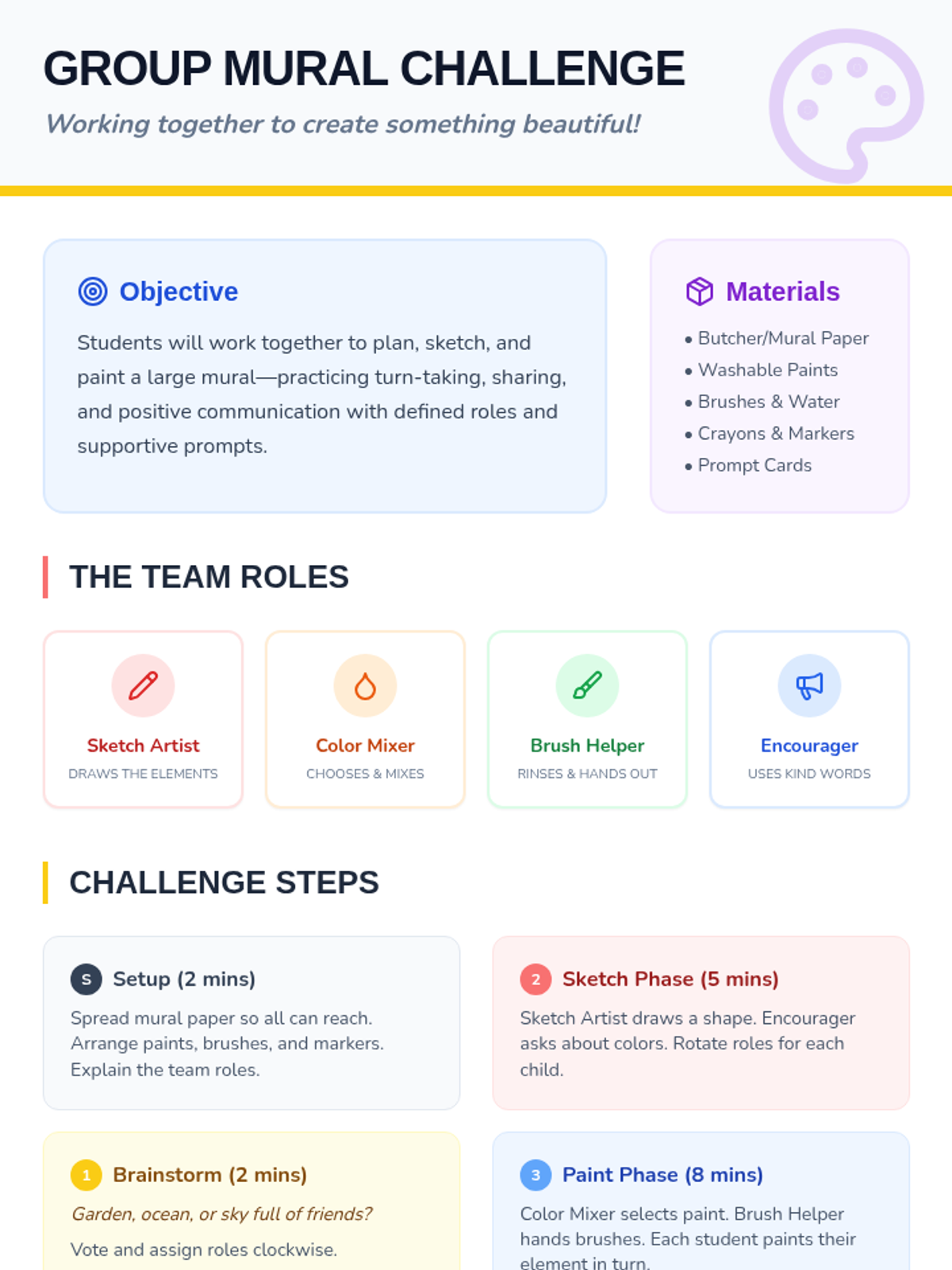 A 30-minute small-group session for 1st graders to develop cooperation, turn-taking, and communication skills through a collaborative mural project.