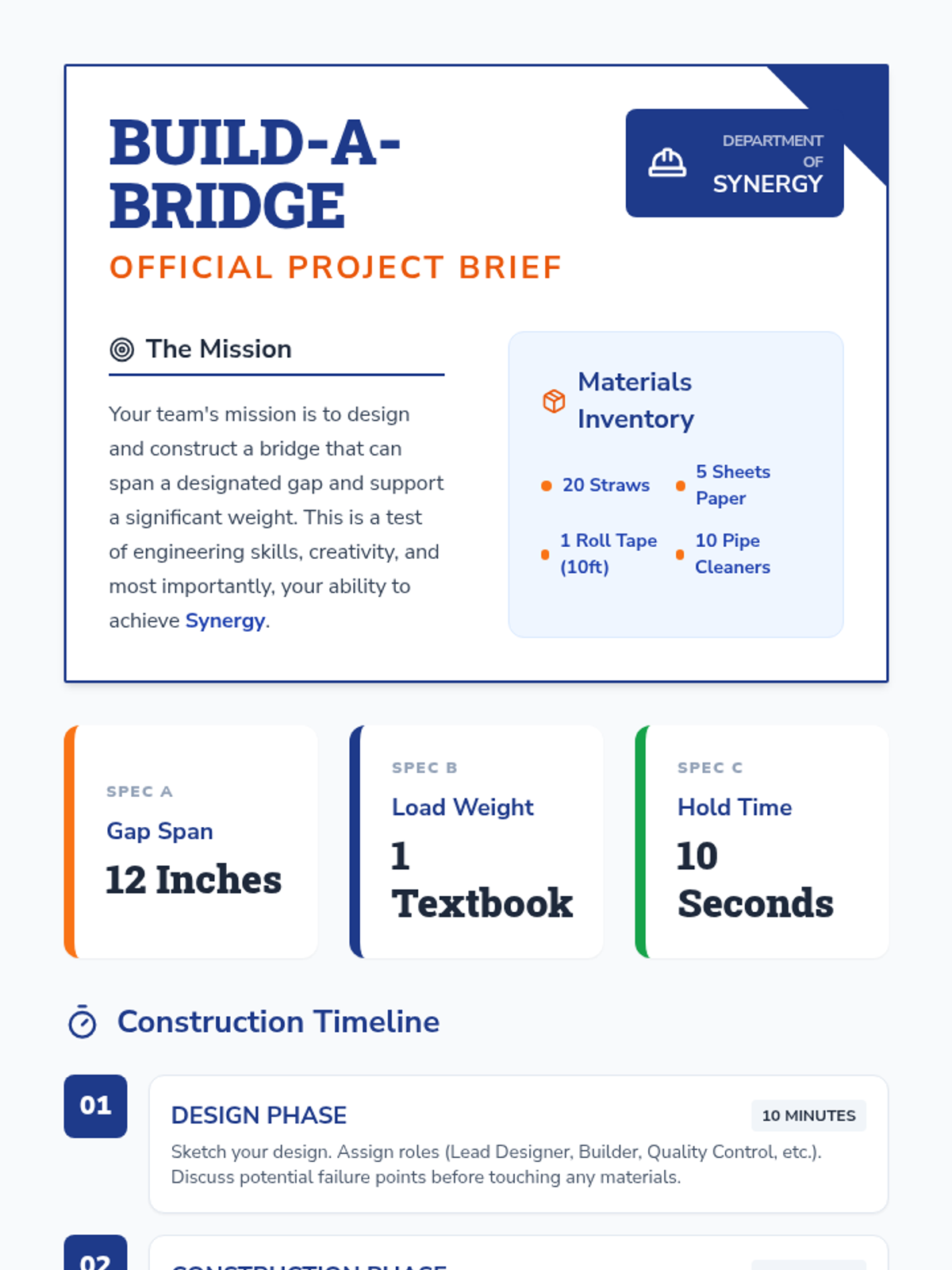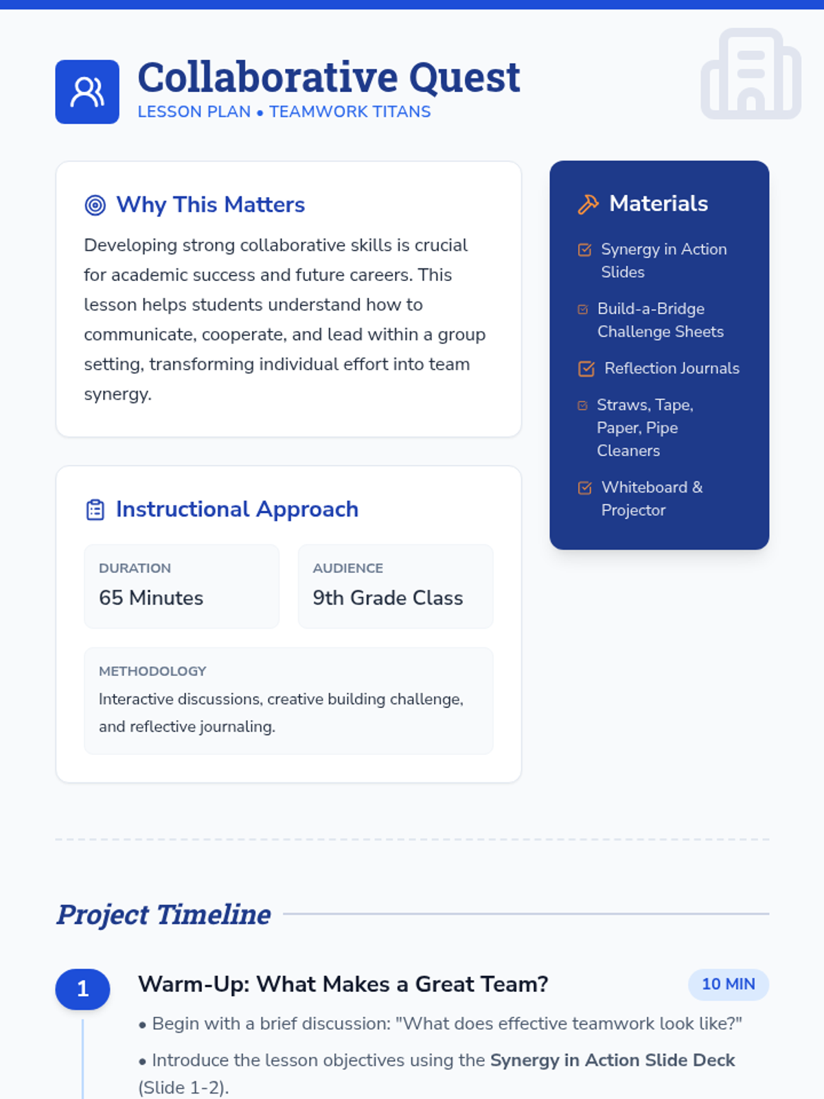 A high-energy lesson focused on building collaborative skills through an engineering challenge, helping 9th graders master communication, role-definition, and conflict resolution.
