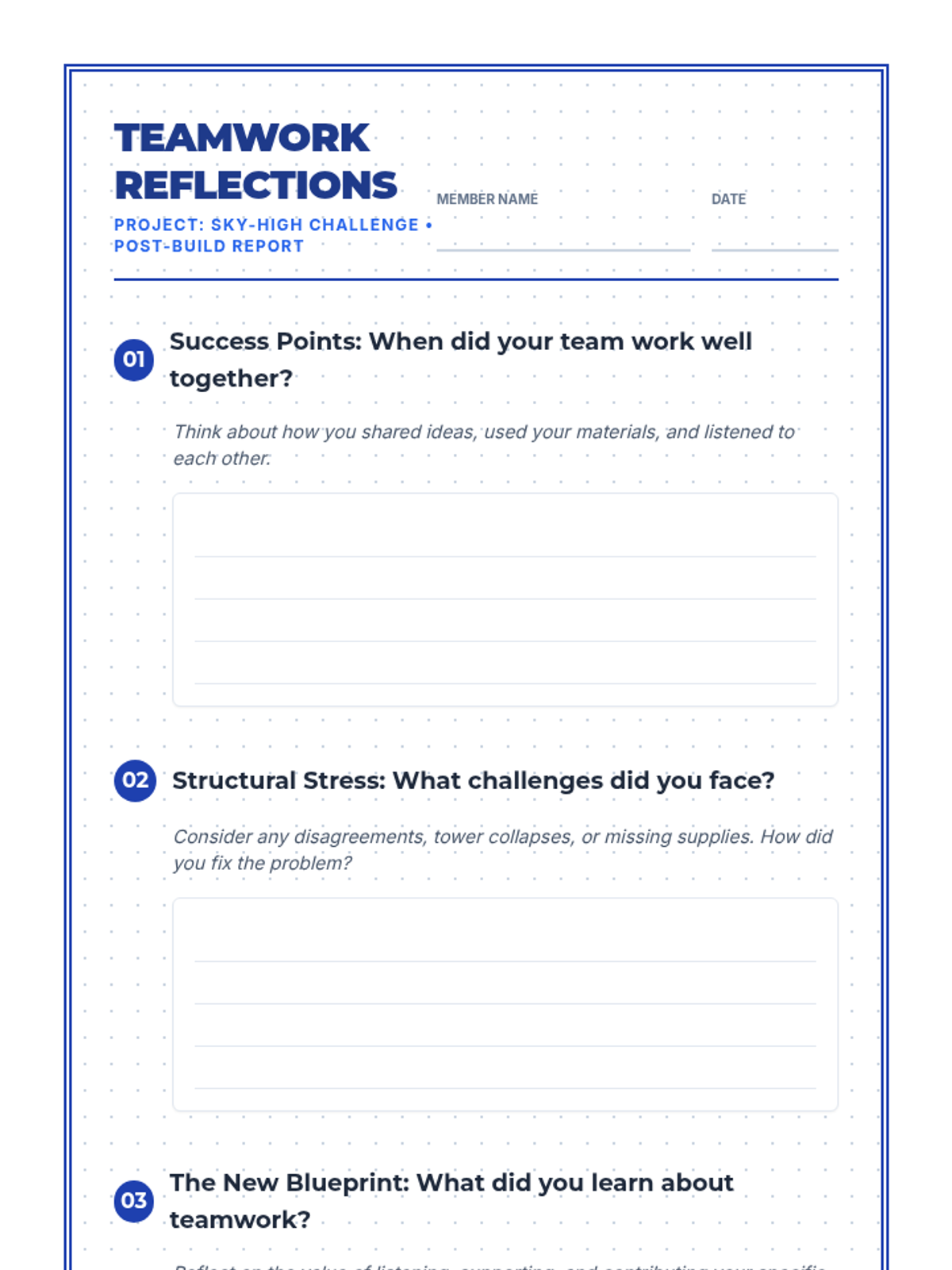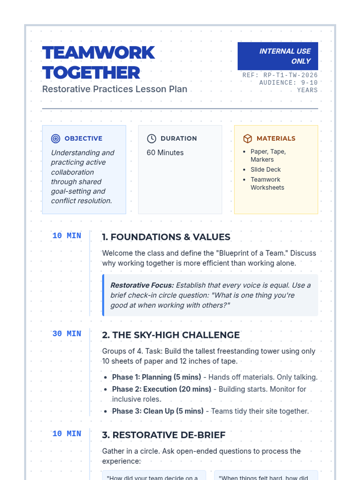 A lesson focused on developing teamwork skills through a collaborative tower-building challenge and restorative reflections. Students explore communication, conflict resolution, and the value of every team member's contribution.