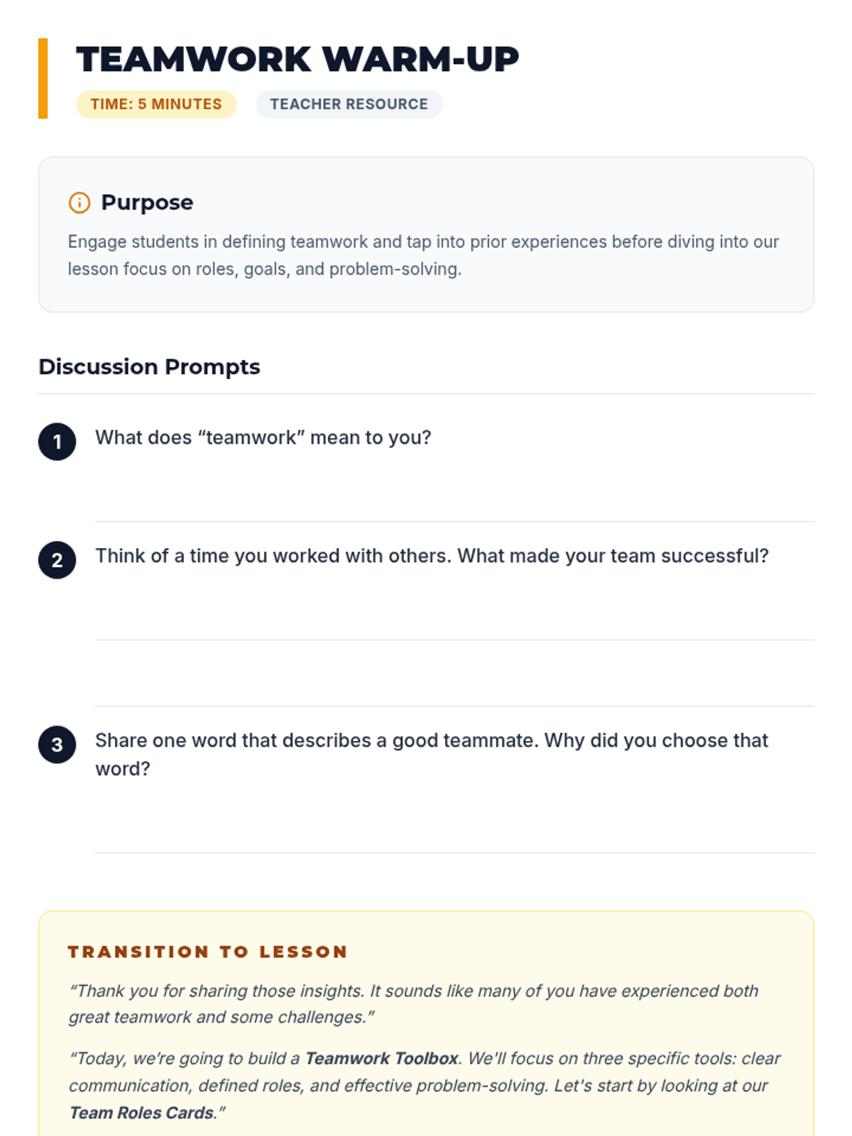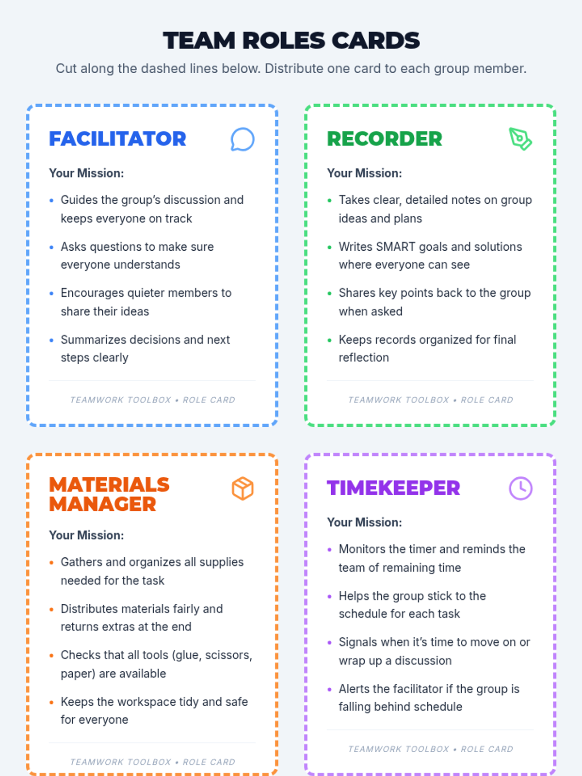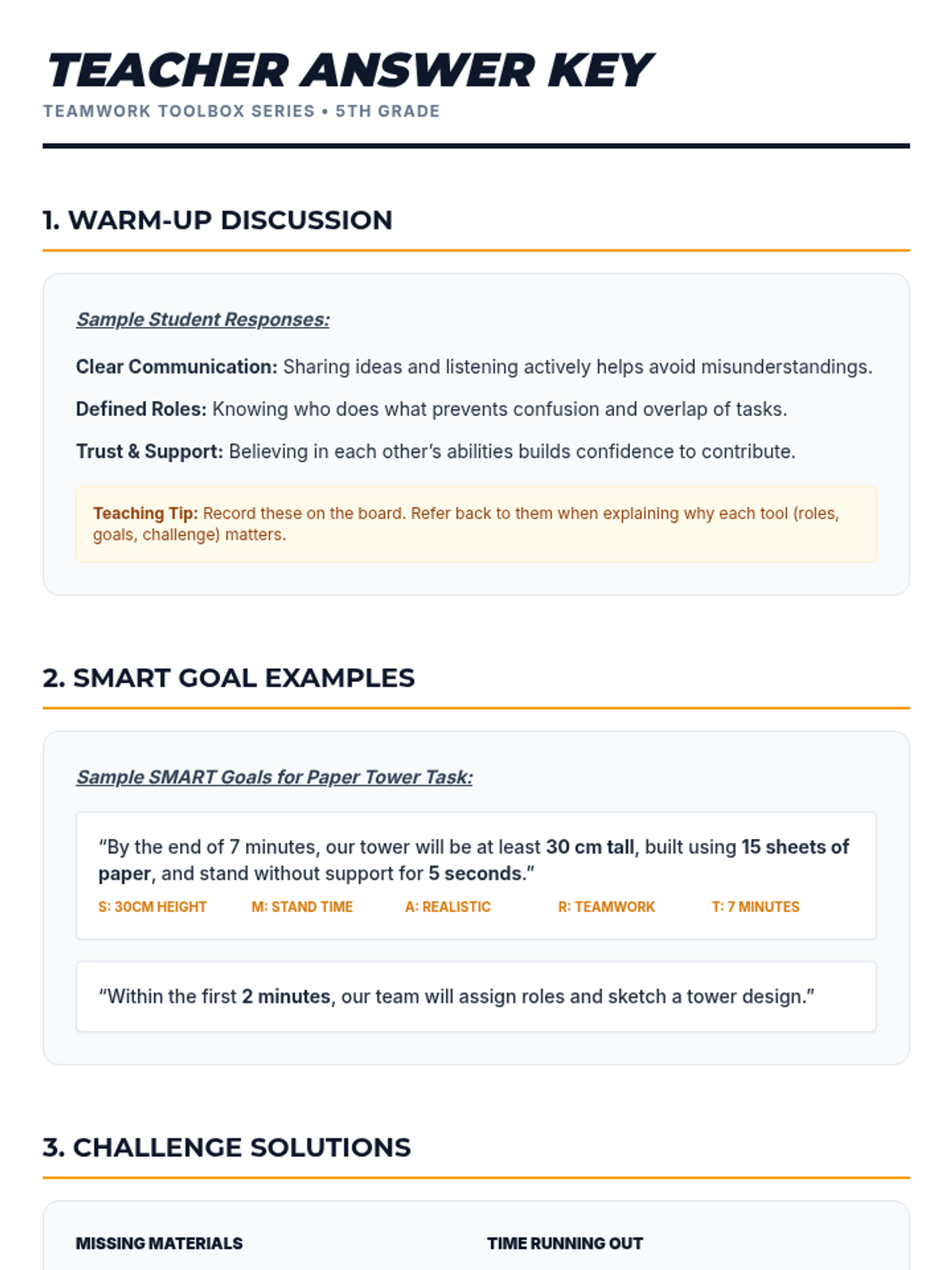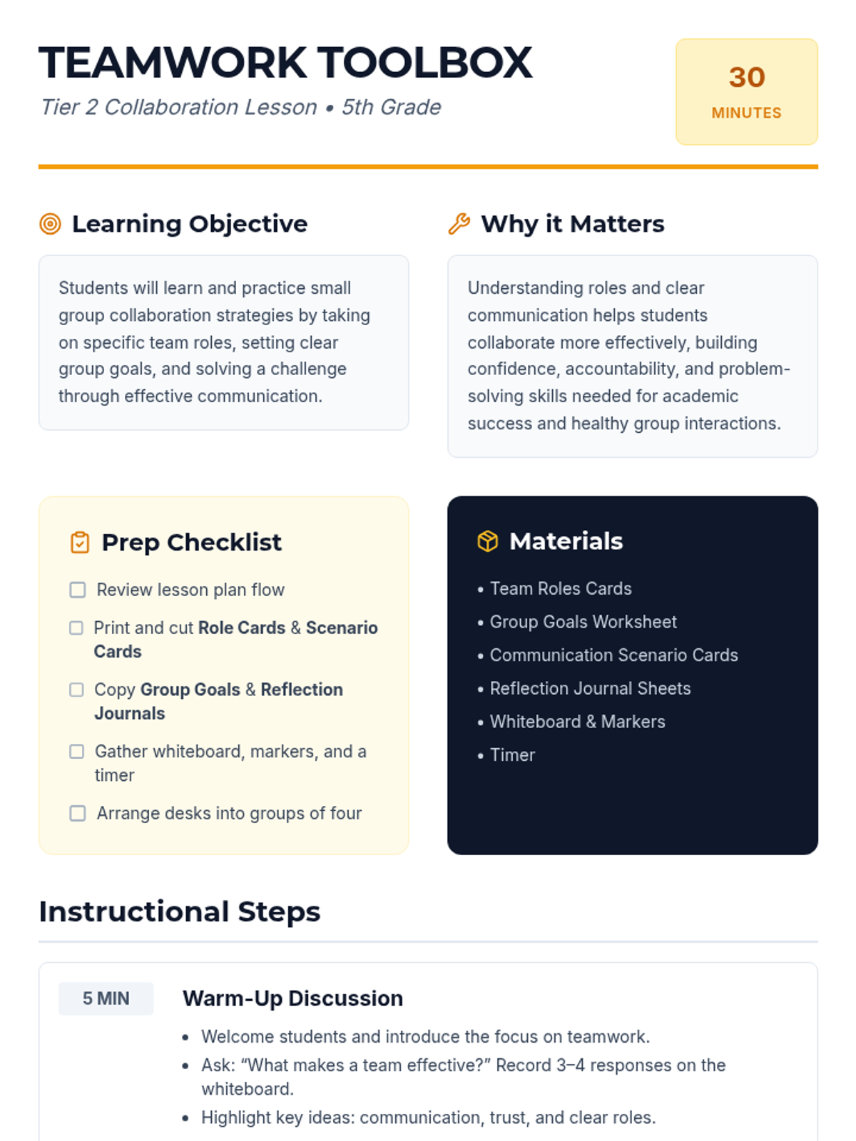 A 30-minute Tier 2 lesson for 5th graders focused on small-group collaboration strategies, including roles, communication, and SMART goal-setting.