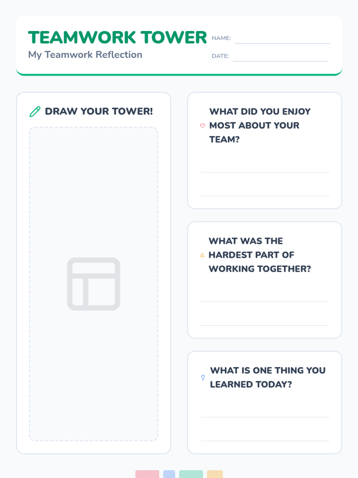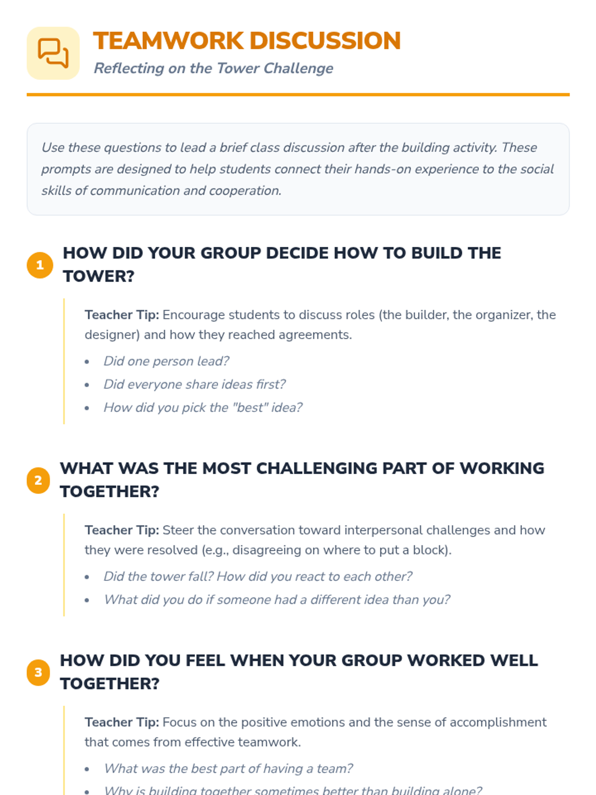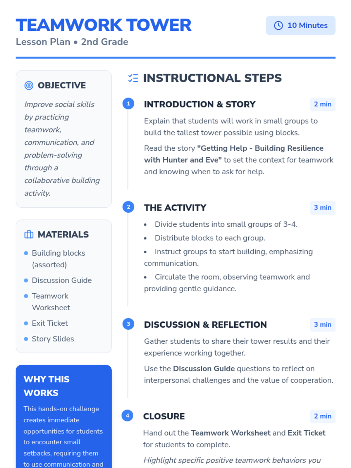 Students collaborate to build the tallest block tower possible, practicing teamwork, communication, and problem-solving skills following a story about resilience and seeking help.