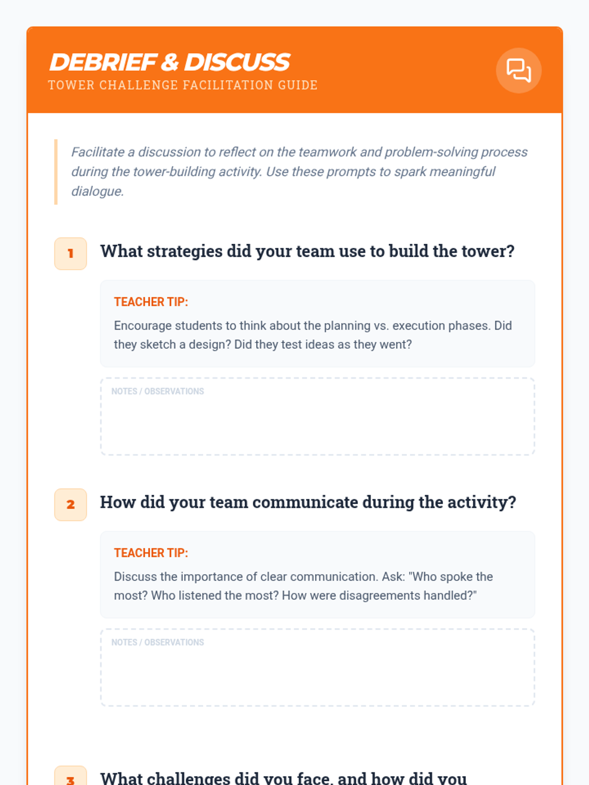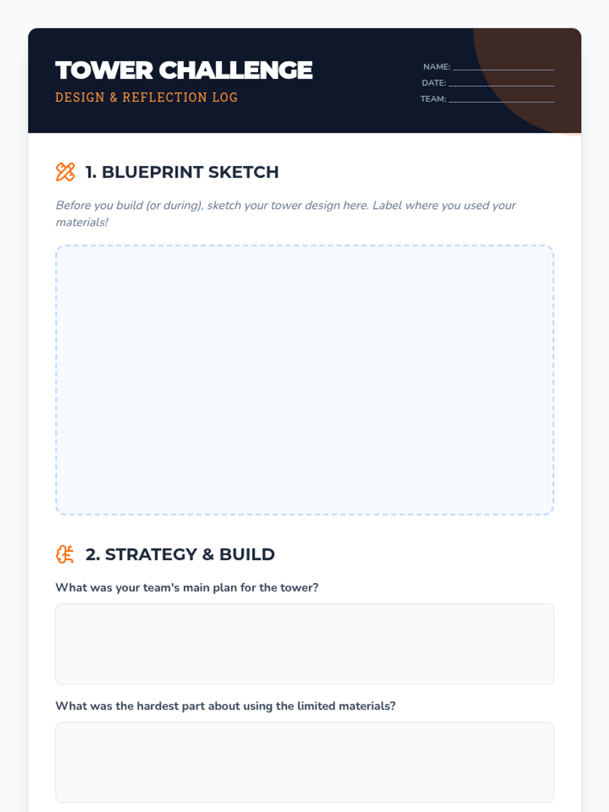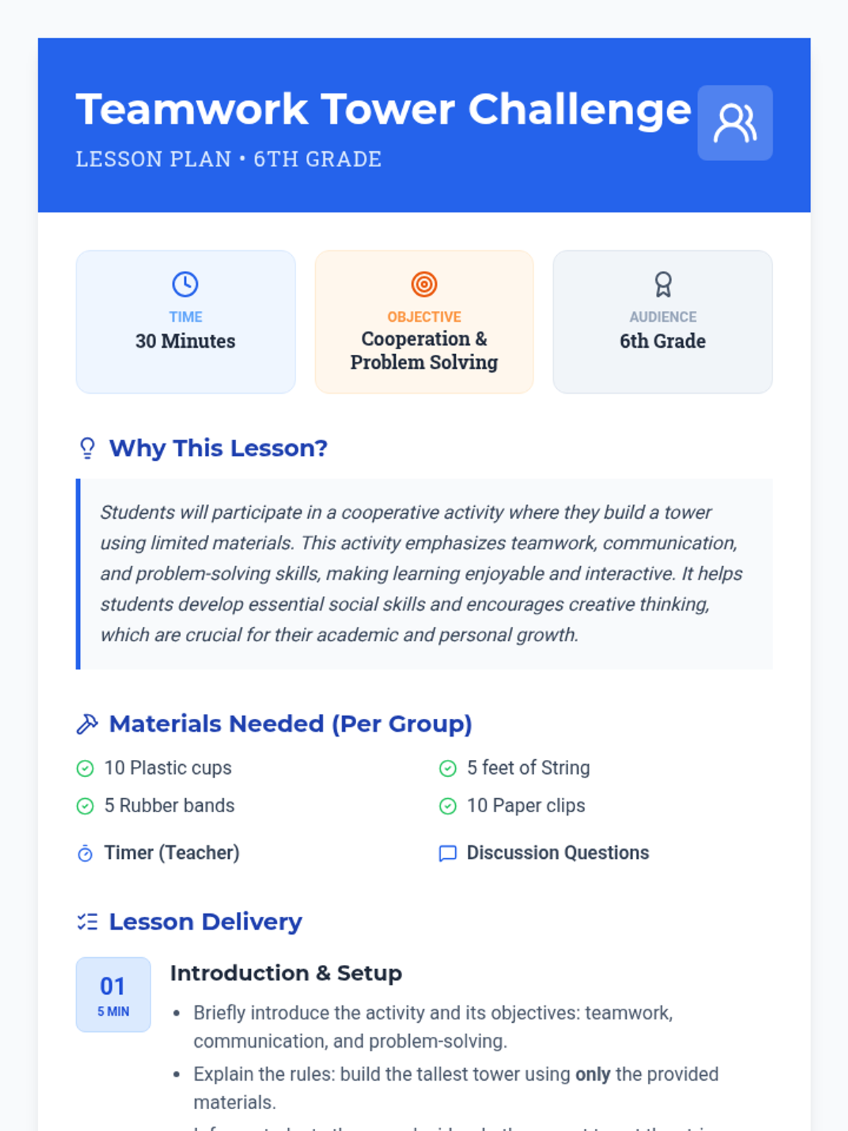 An interactive STEM-based teamwork activity where 6th grade students build towers using limited materials to develop communication and problem-solving skills.