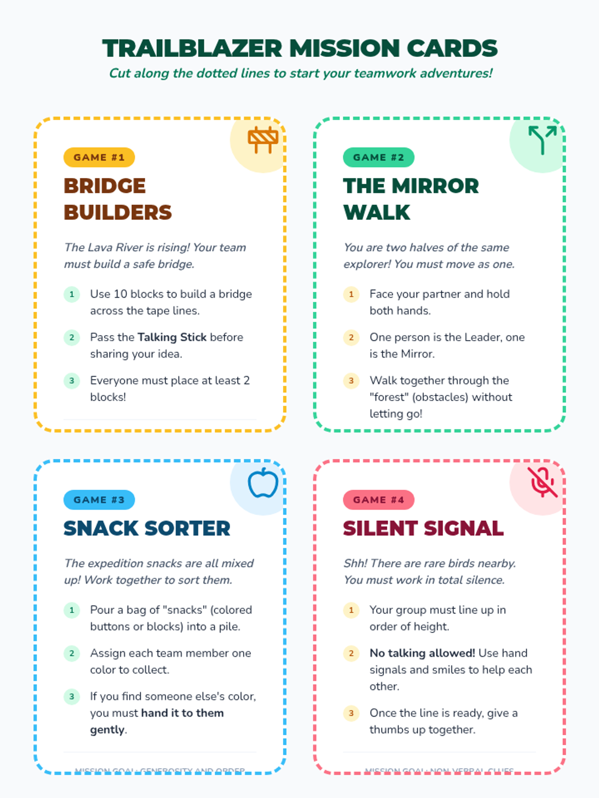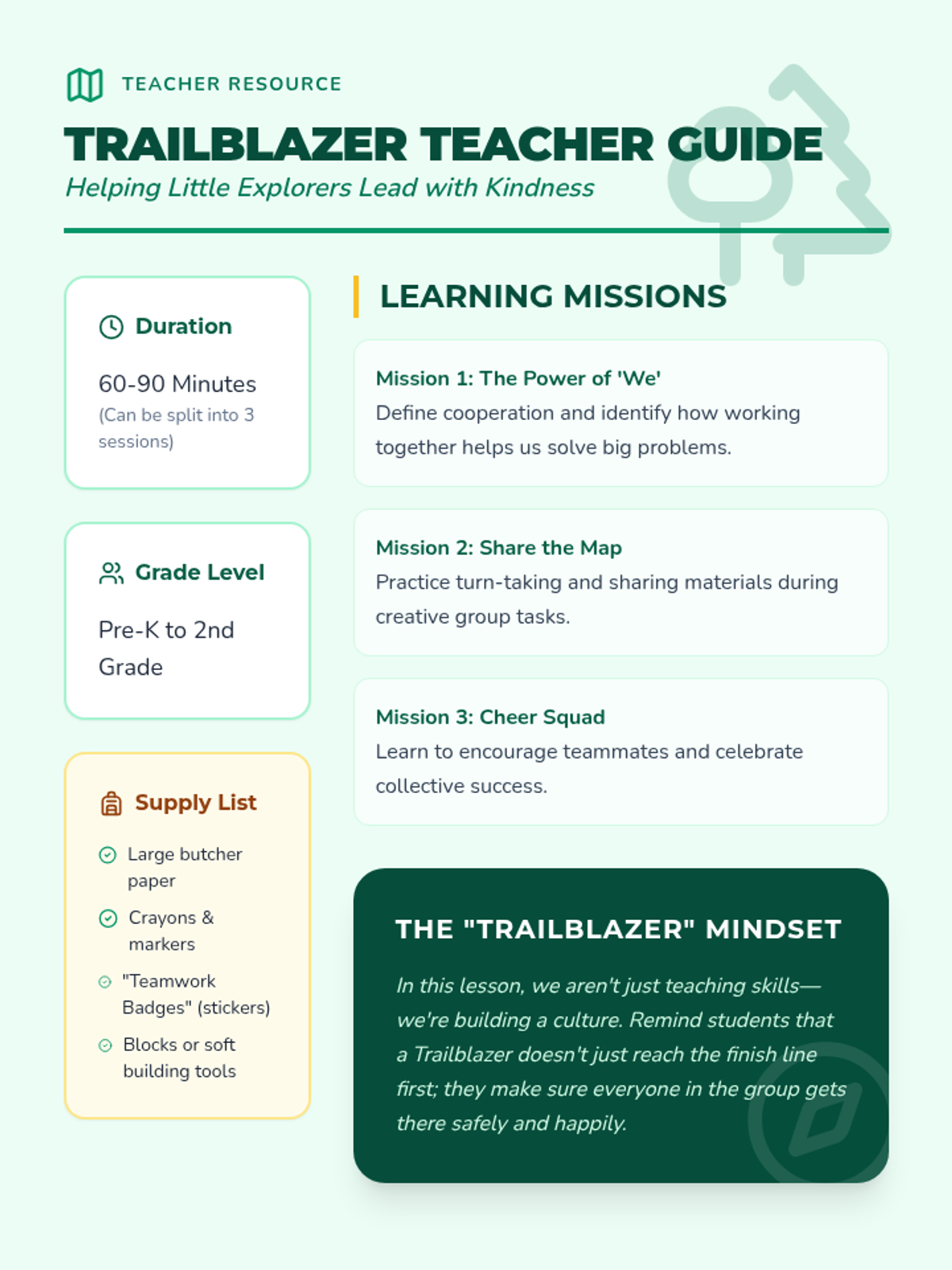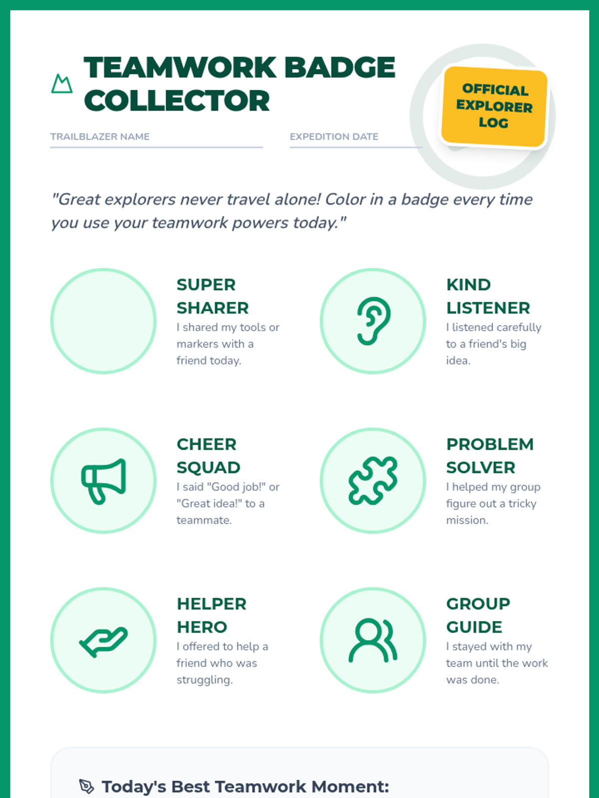 A high-energy lesson for young learners to discover the power of cooperation and sharing through explorer-themed activities and games. Students earn 'Teamwork Badges' as they learn to work together and value every friend's contribution.