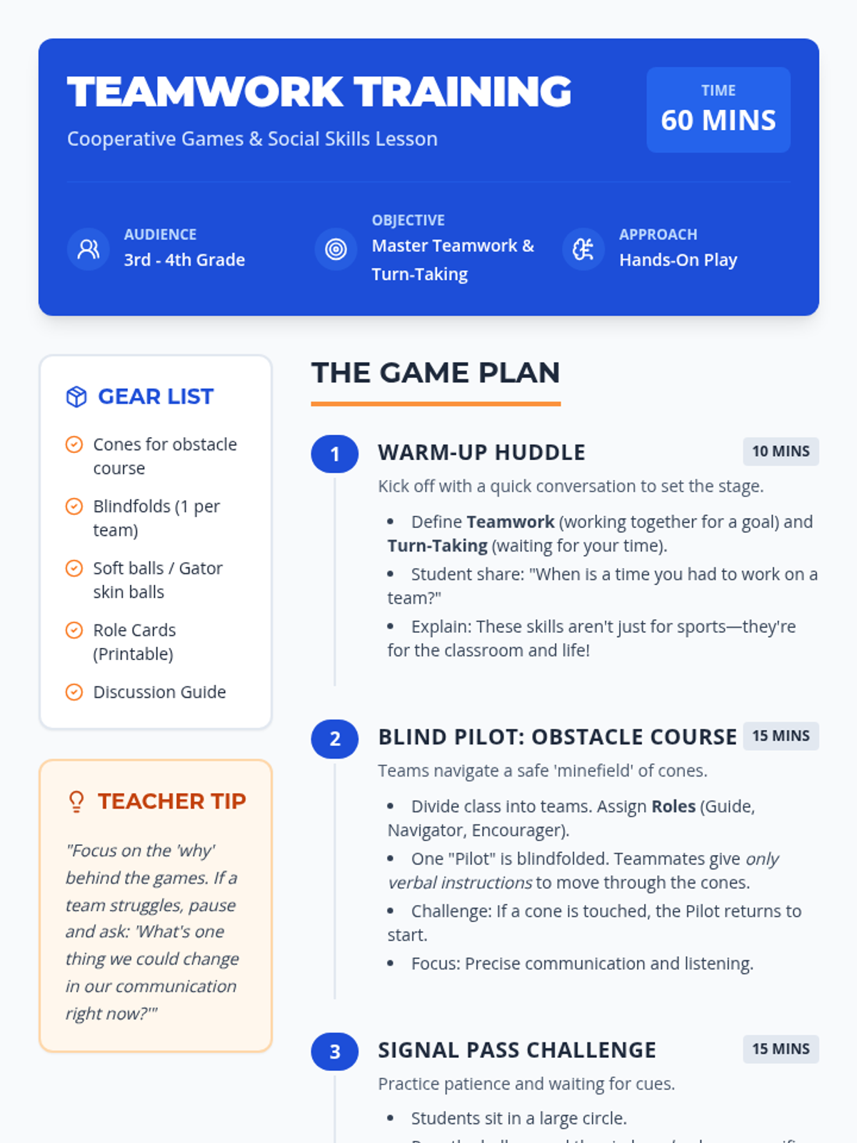 A high-energy, game-based lesson where 3rd and 4th graders practice essential social-emotional skills through cooperative obstacle courses and turn-taking challenges.