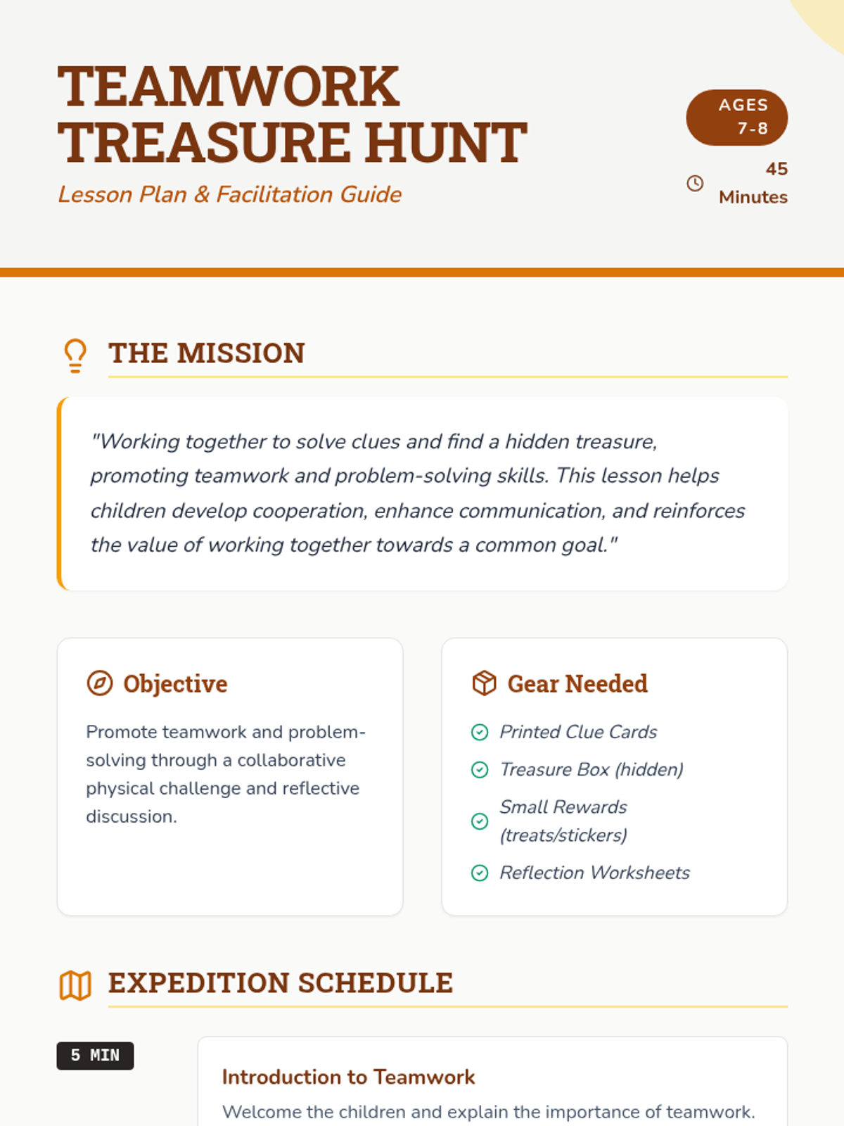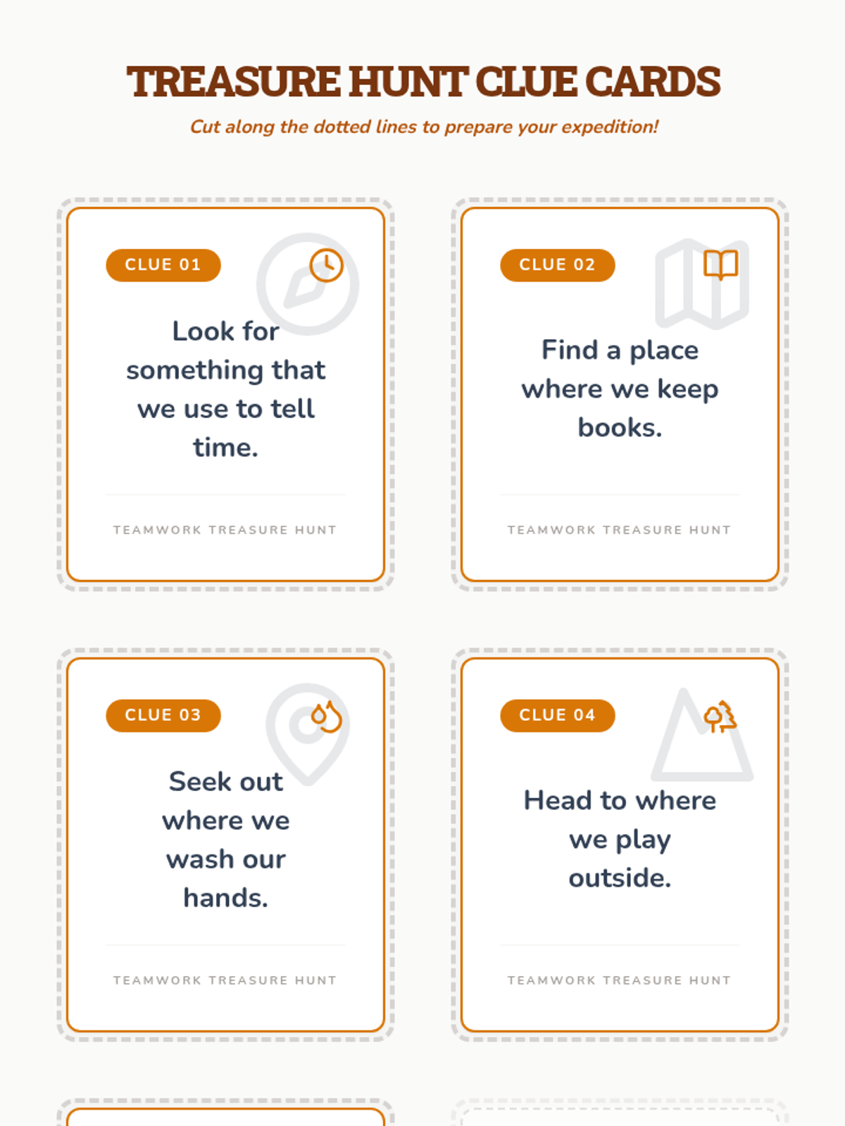 An engaging activity where kids work together to solve clues and find a hidden treasure, promoting teamwork and problem-solving skills. Students develop cooperation and communication skills while working towards a common goal.