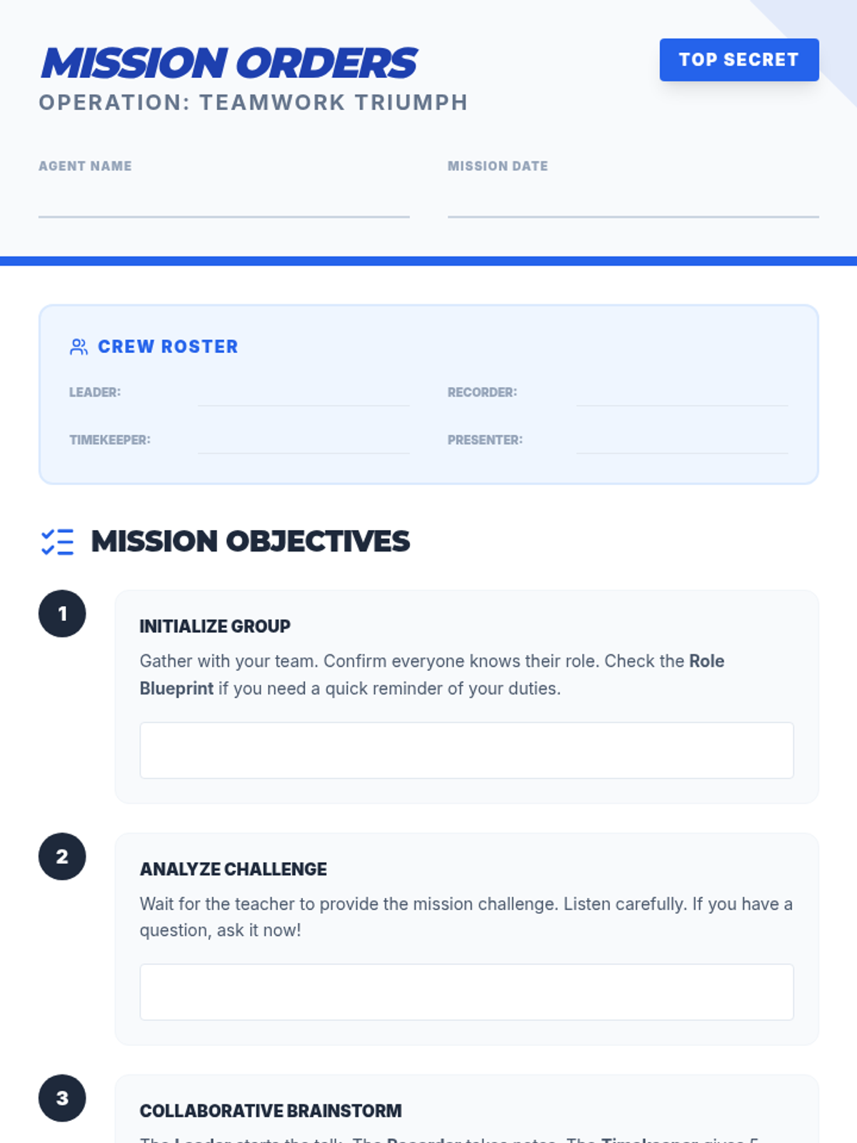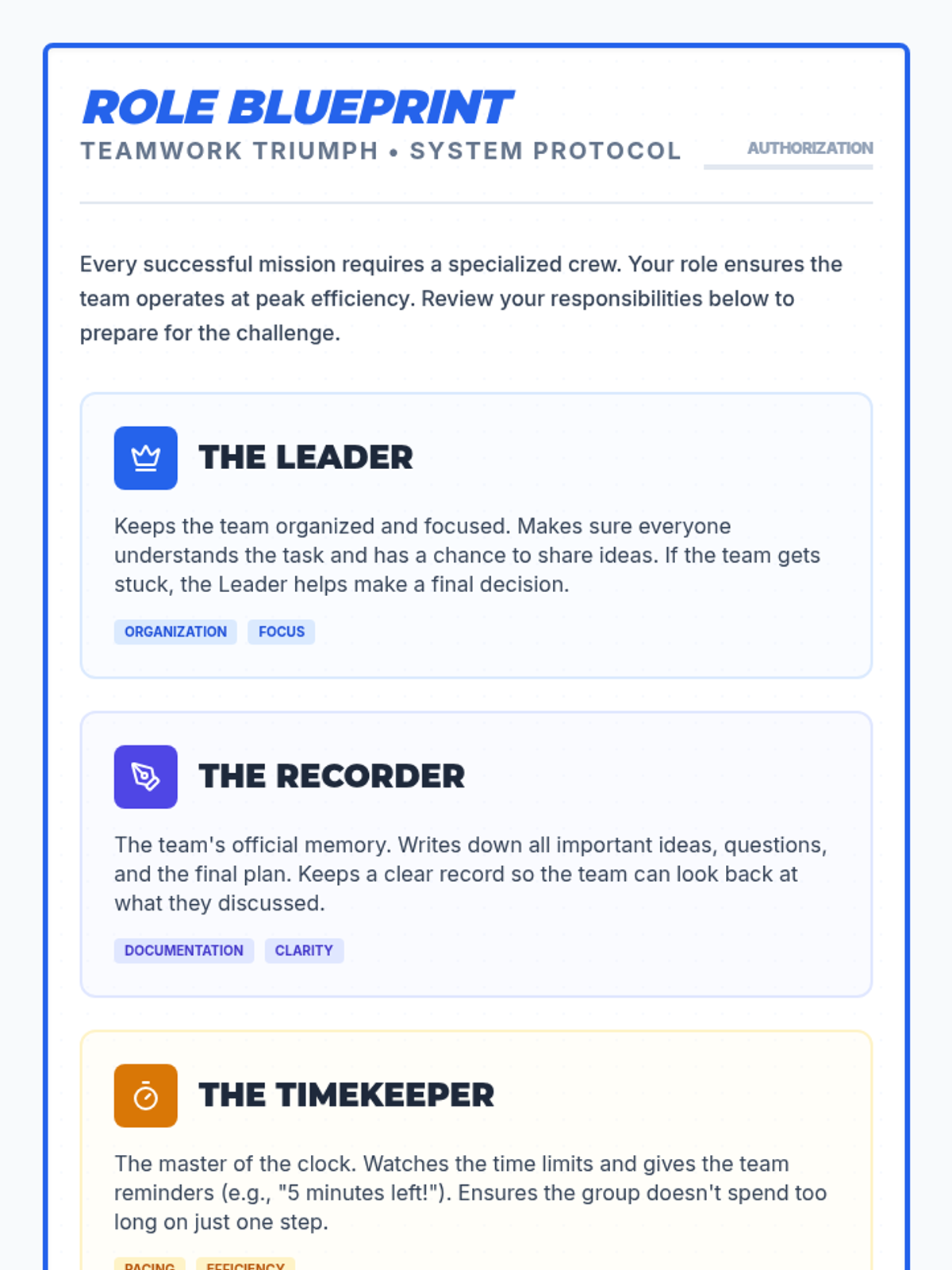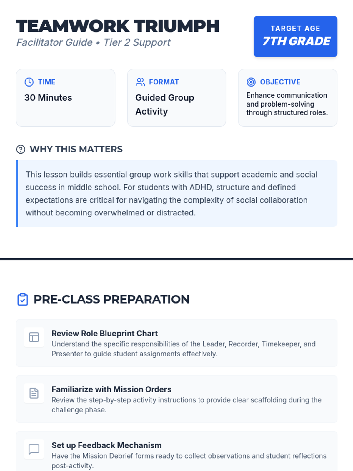 A structured social skills lesson designed for 7th-grade students with ADHD, focusing on collaboration through defined group roles and clear activity steps.