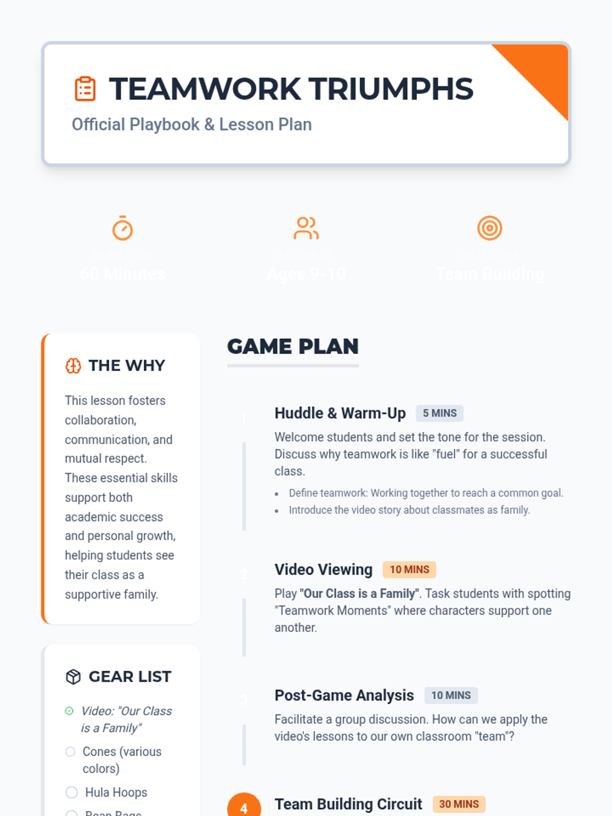A high-energy lesson designed for 9-10 year olds to build collaboration, communication, and mutual respect through video reflection and physical team challenges.