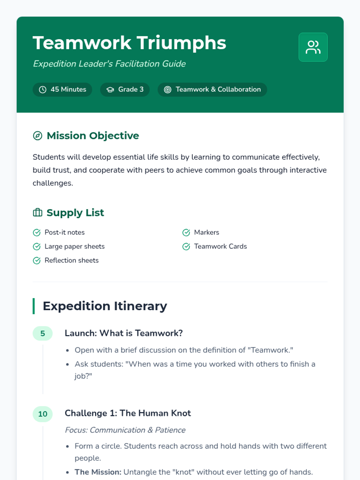 This lesson focuses on the importance of teamwork and collaboration among Grade 3 students. Through engaging activities like the Human Knot and Tower Building, students will learn to communicate effectively, build trust, and cooperate to achieve common goals.