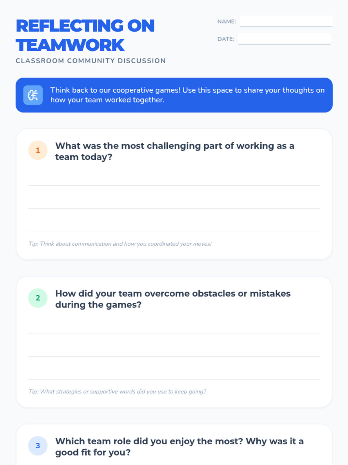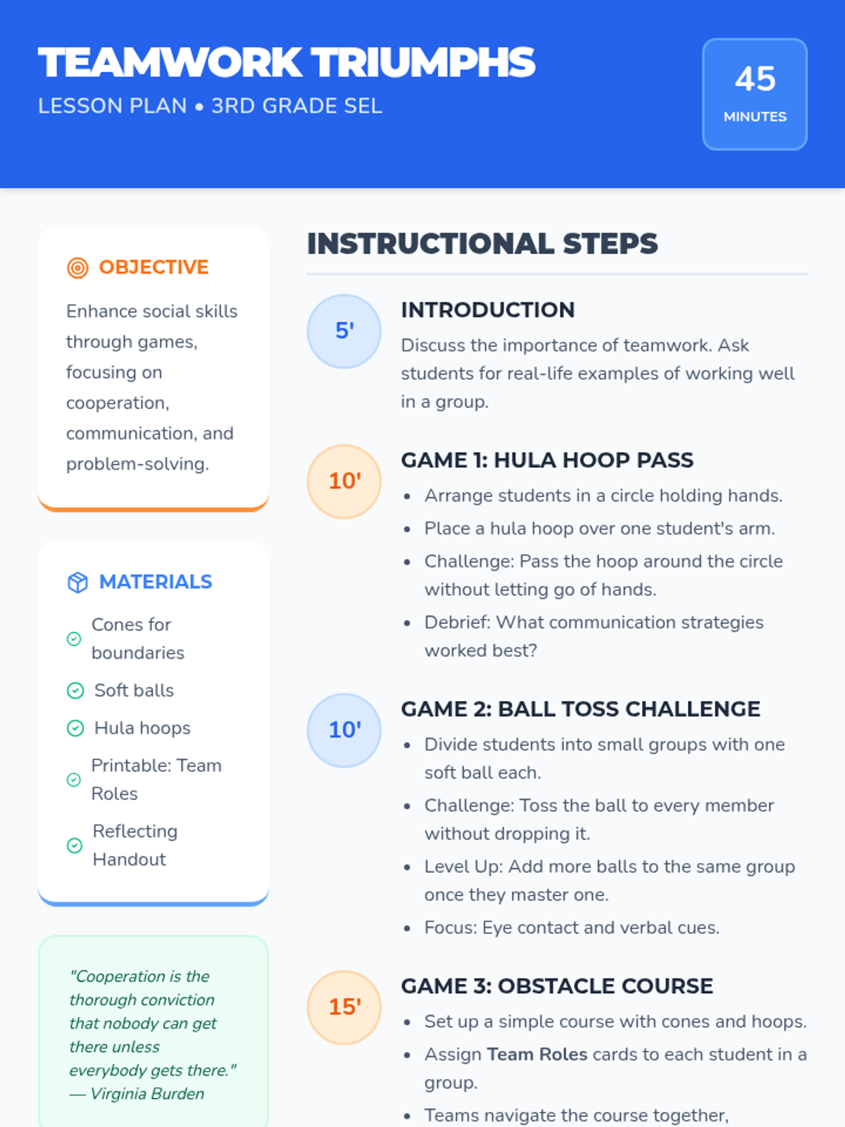 A 45-minute social-emotional learning lesson for 3rd grade focusing on cooperation, communication, and problem-solving through physical games. Students practice specific team roles while navigating challenges like the Hula Hoop Pass and Ball Toss.