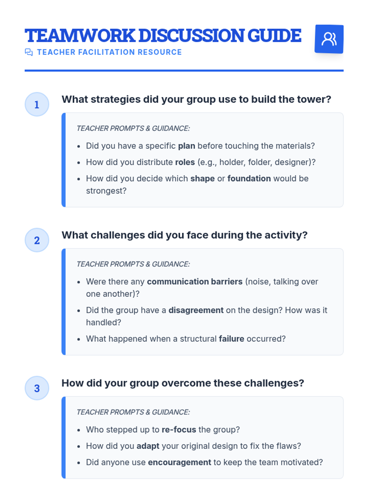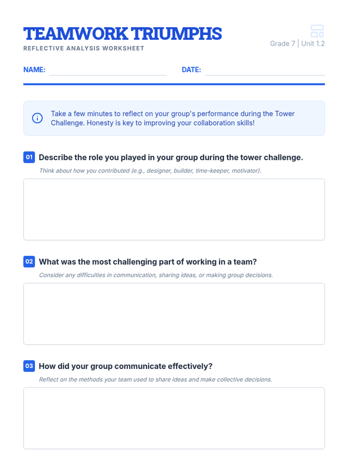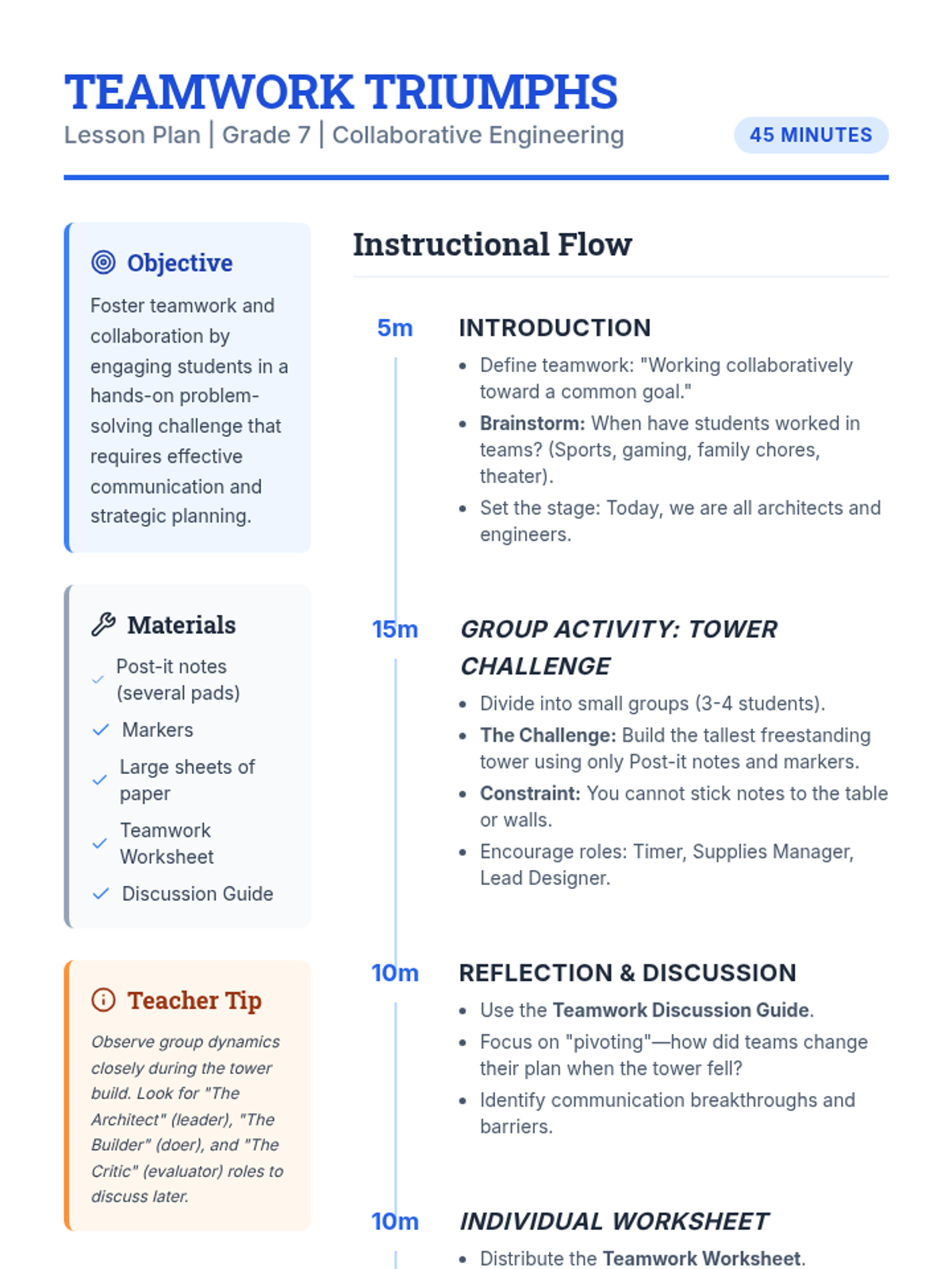 A 45-minute interactive lesson for 7th graders focusing on teamwork, communication, and problem-solving through a hands-on tower-building challenge. Students reflect on group dynamics and individual contributions to achieve a collective goal.
