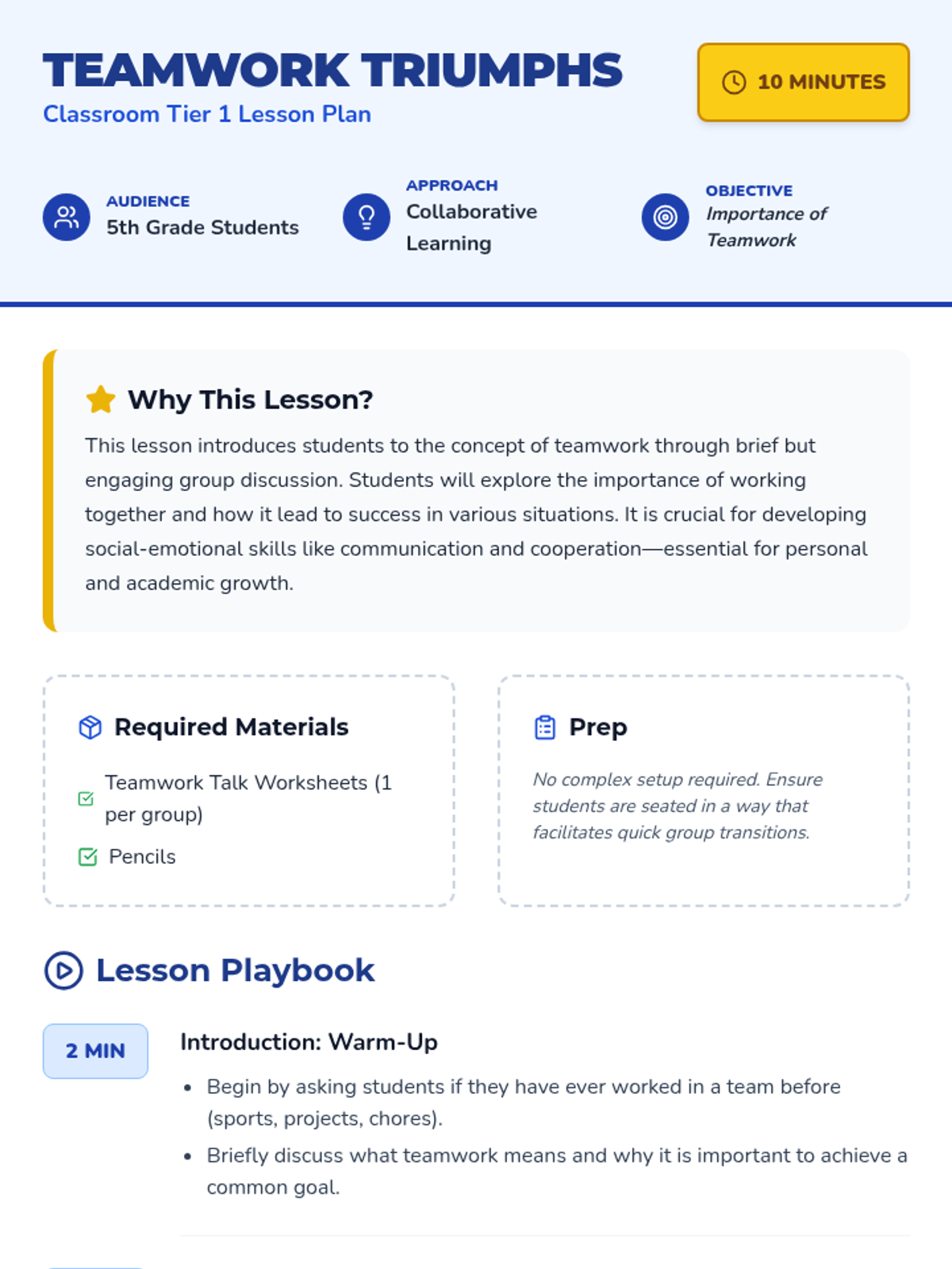 A quick and impactful 10-minute lesson for 5th graders to explore the essentials of teamwork, communication, and collective success.