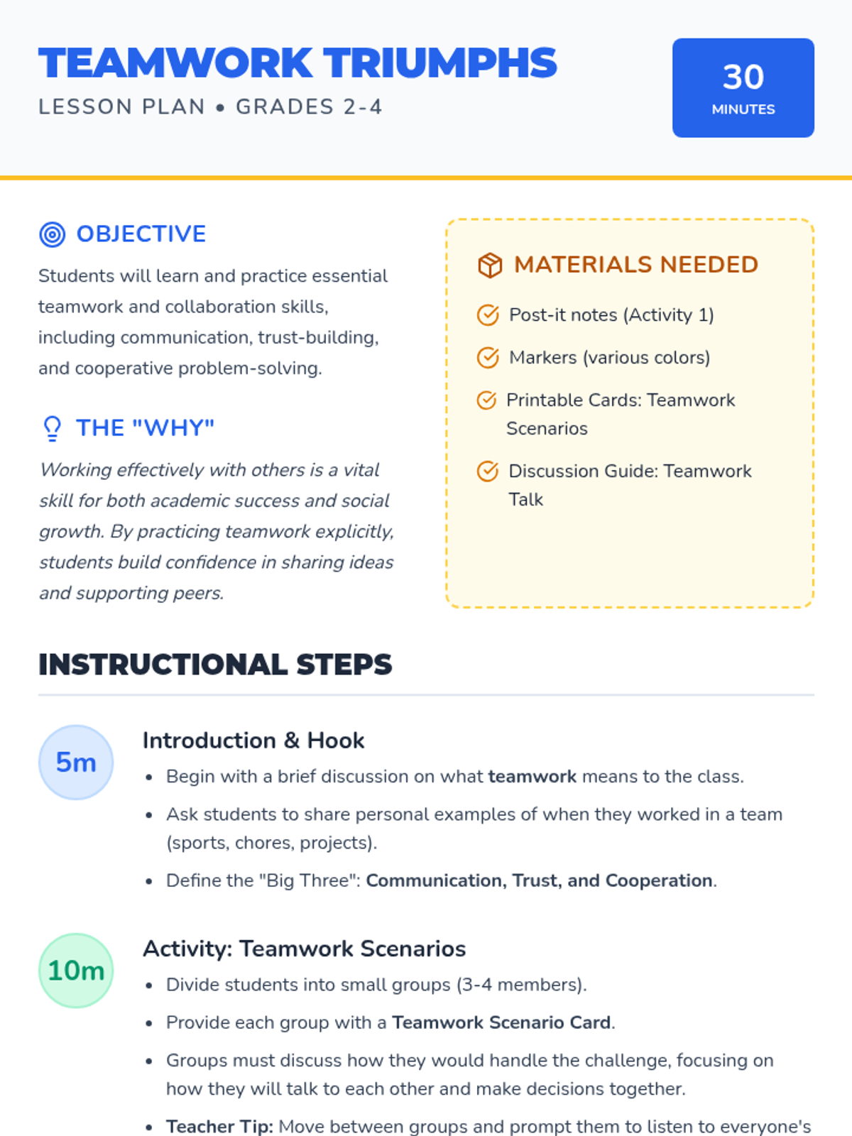 A fast-paced, 10-minute social-emotional learning lesson focused on building self-confidence through self-acceptance and kindness toward others. Students define self-esteem and set immediate goals for personal growth and peer acceptance.