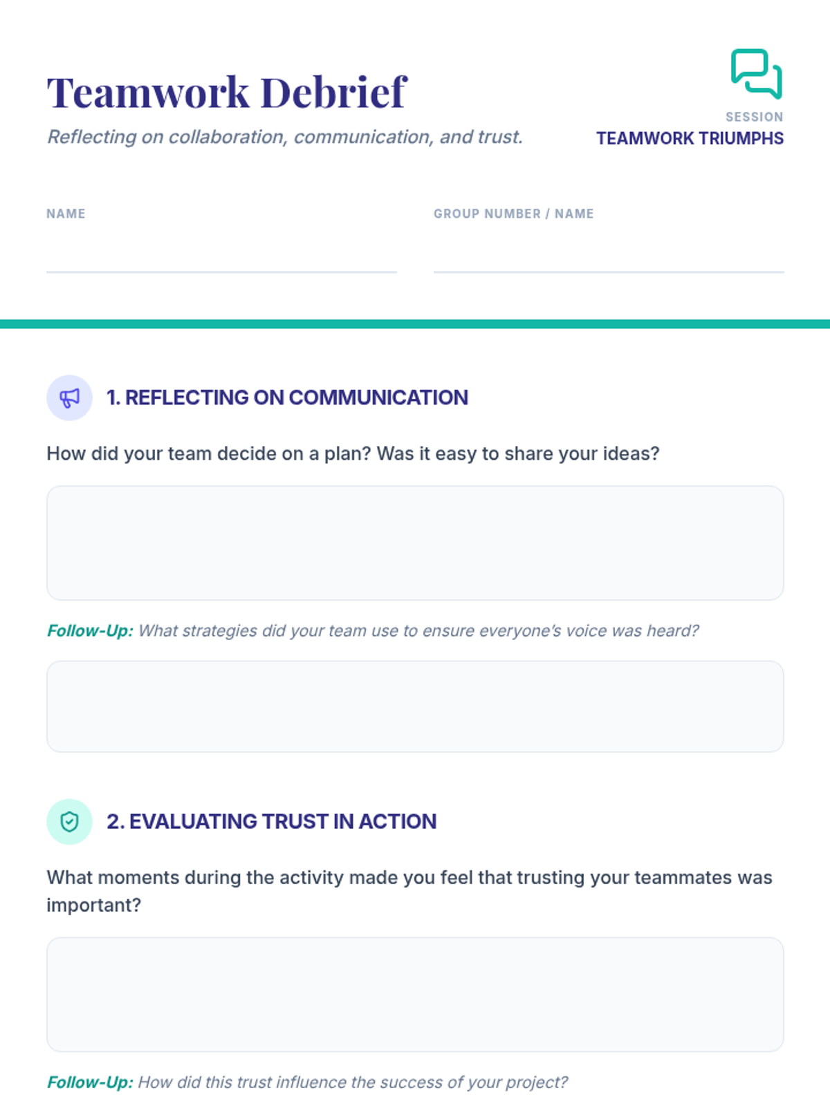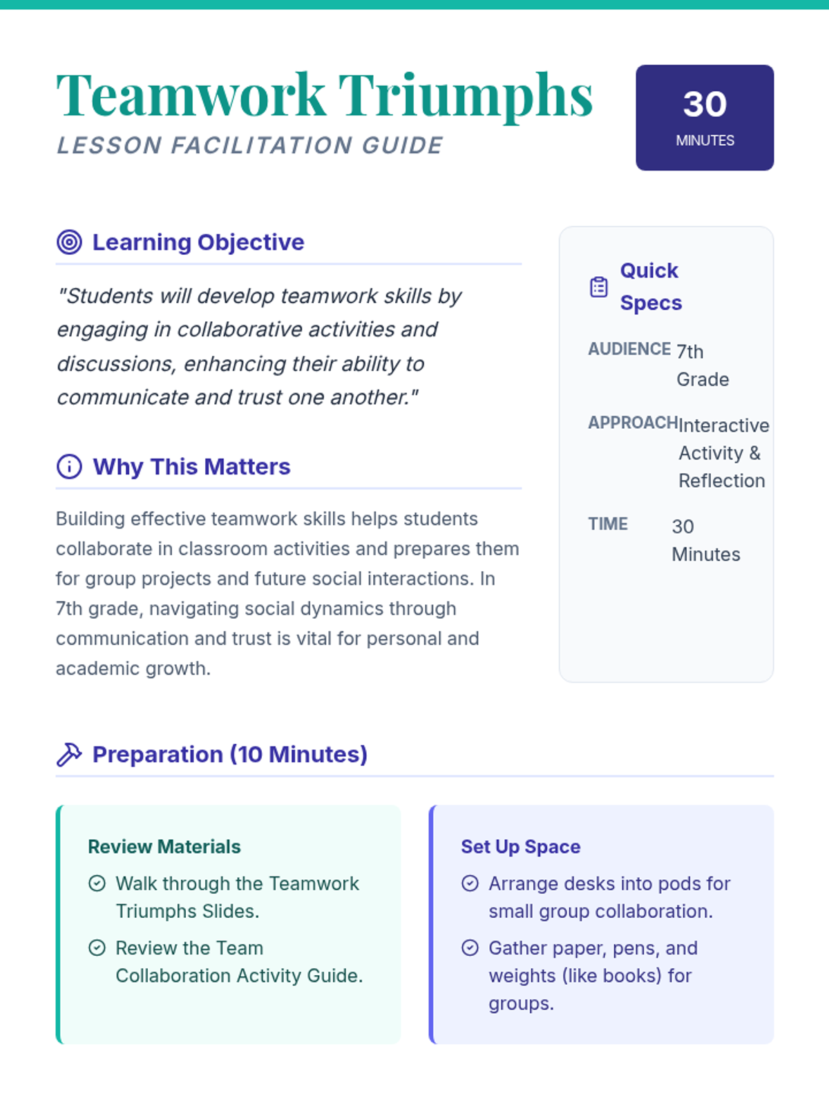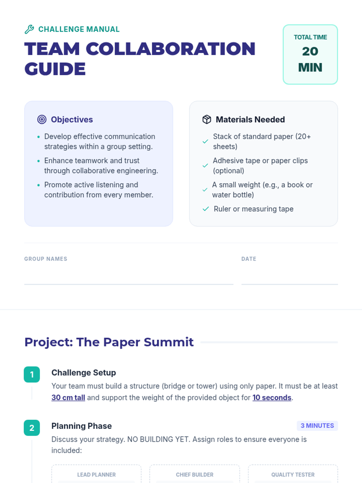 A lesson for 7th-grade students focused on building teamwork through collaboration, communication, and trust exercises. Students participate in a paper-based engineering challenge and reflect on their group dynamics.