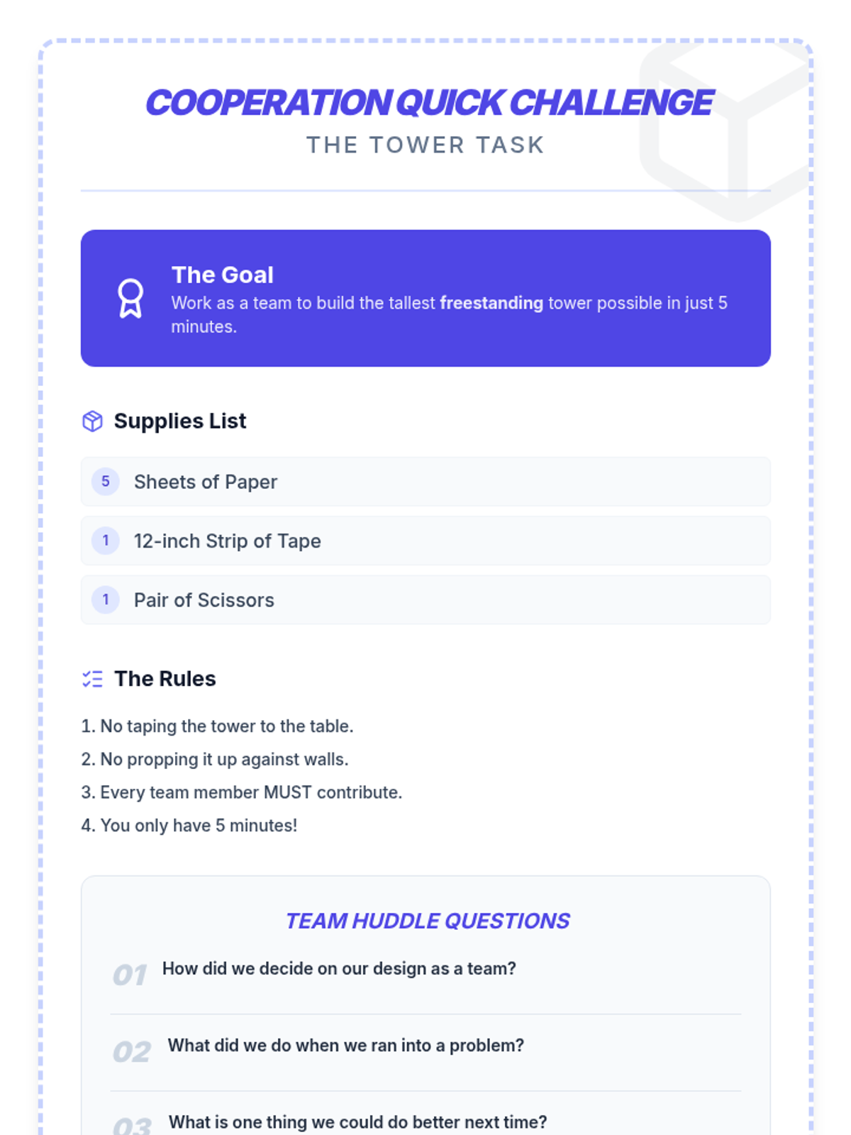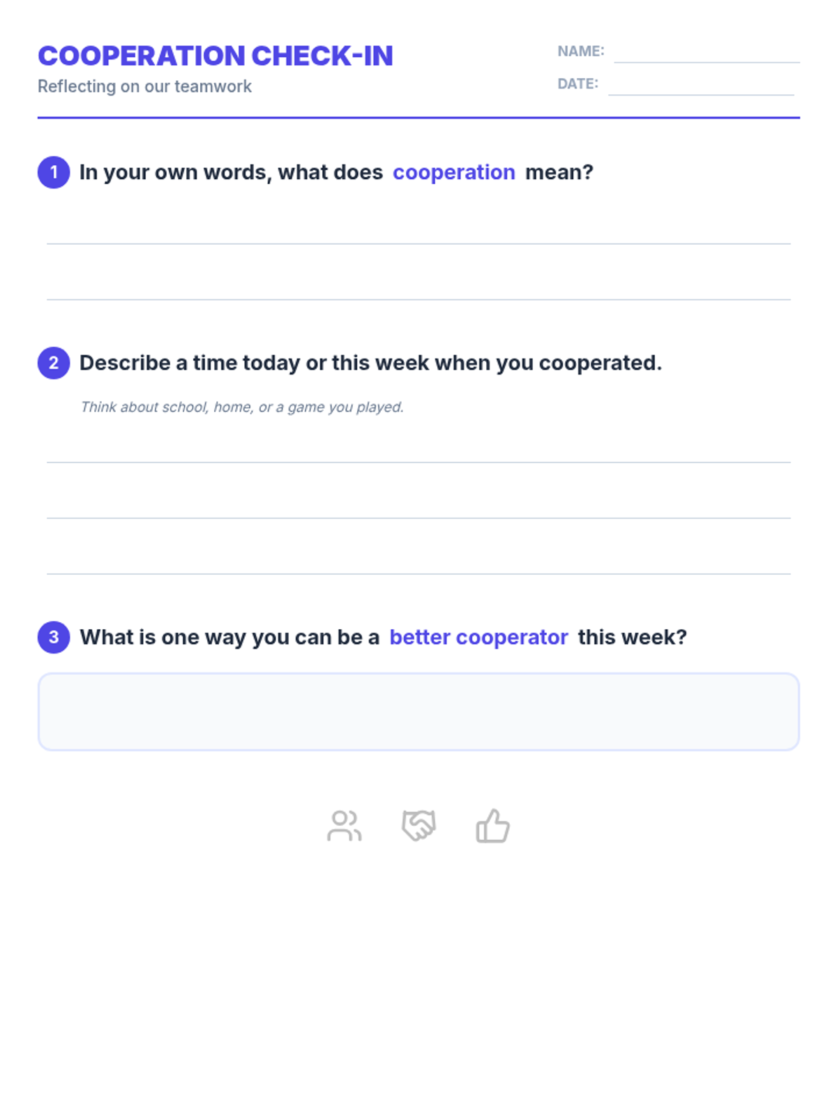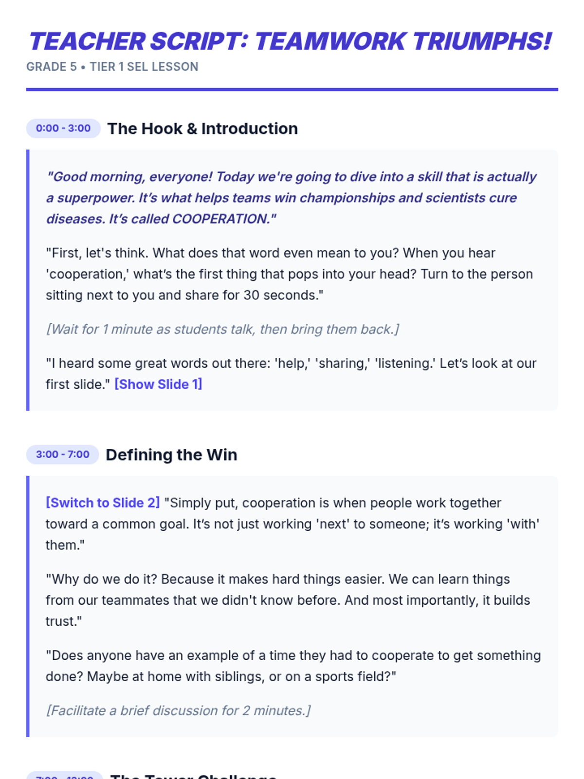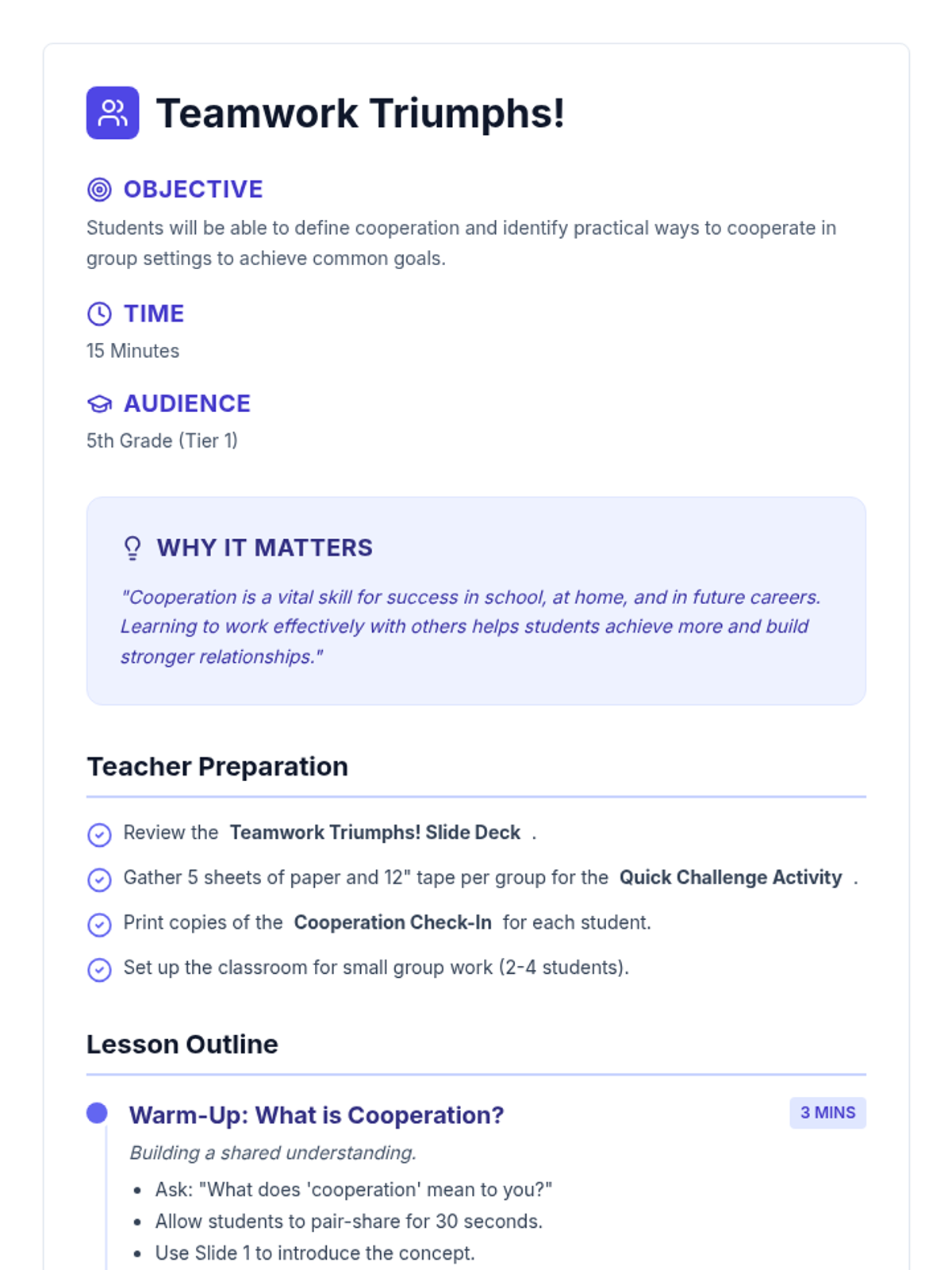 A 15-minute Tier 1 lesson for 5th graders focused on defining cooperation, identifying its benefits, and practicing it through a quick collaborative challenge.