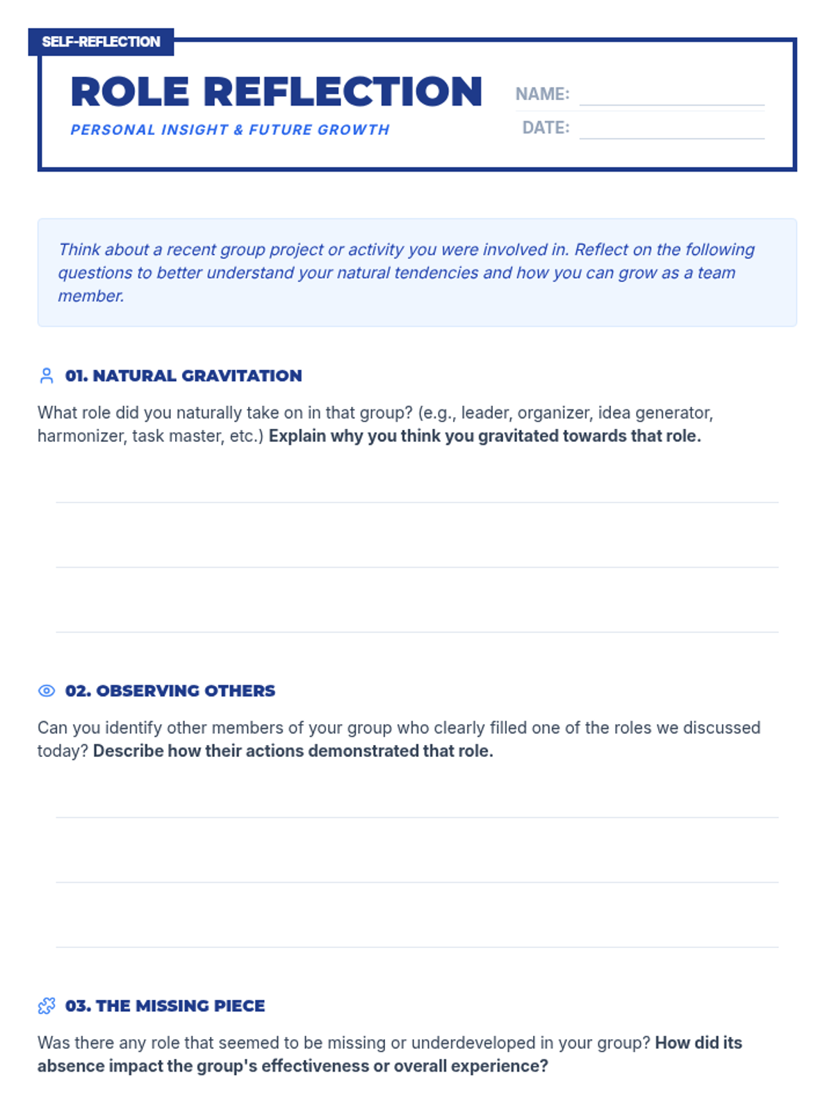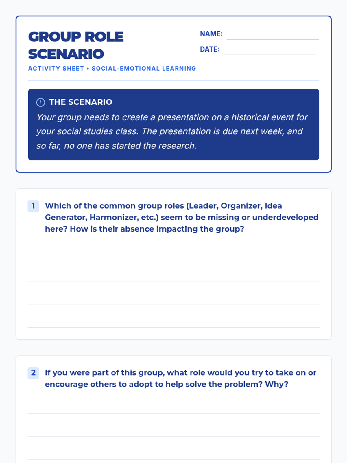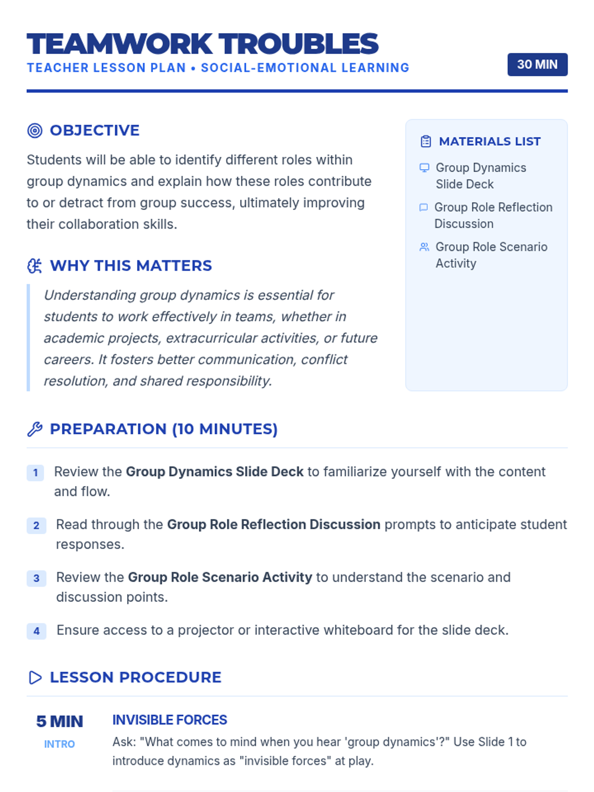 This 30-minute lesson helps 8th-grade students understand different group roles, their impact on collaboration, and strategies for effective teamwork. It uses interactive discussion and reflective activities to develop social-emotional skills.