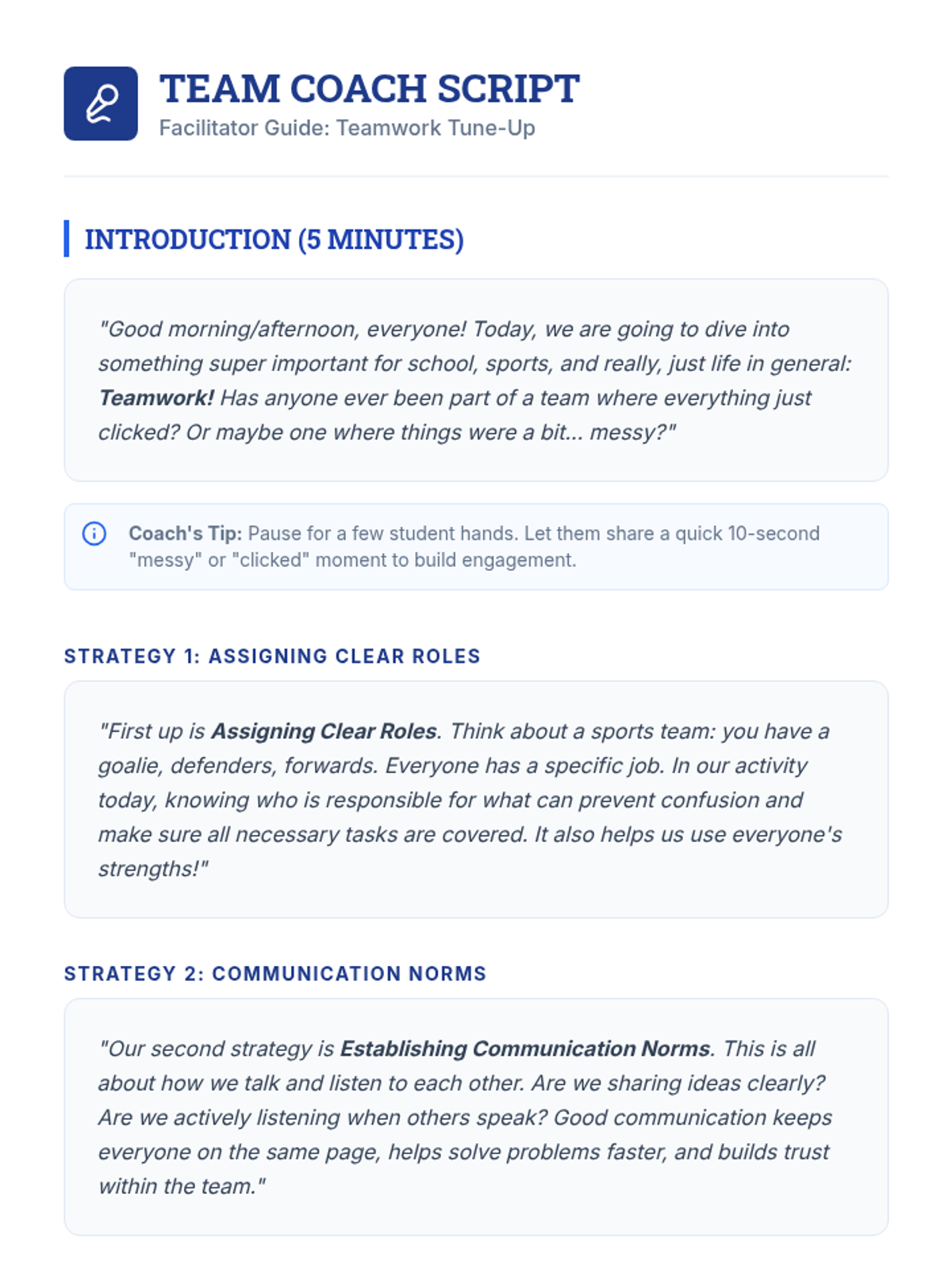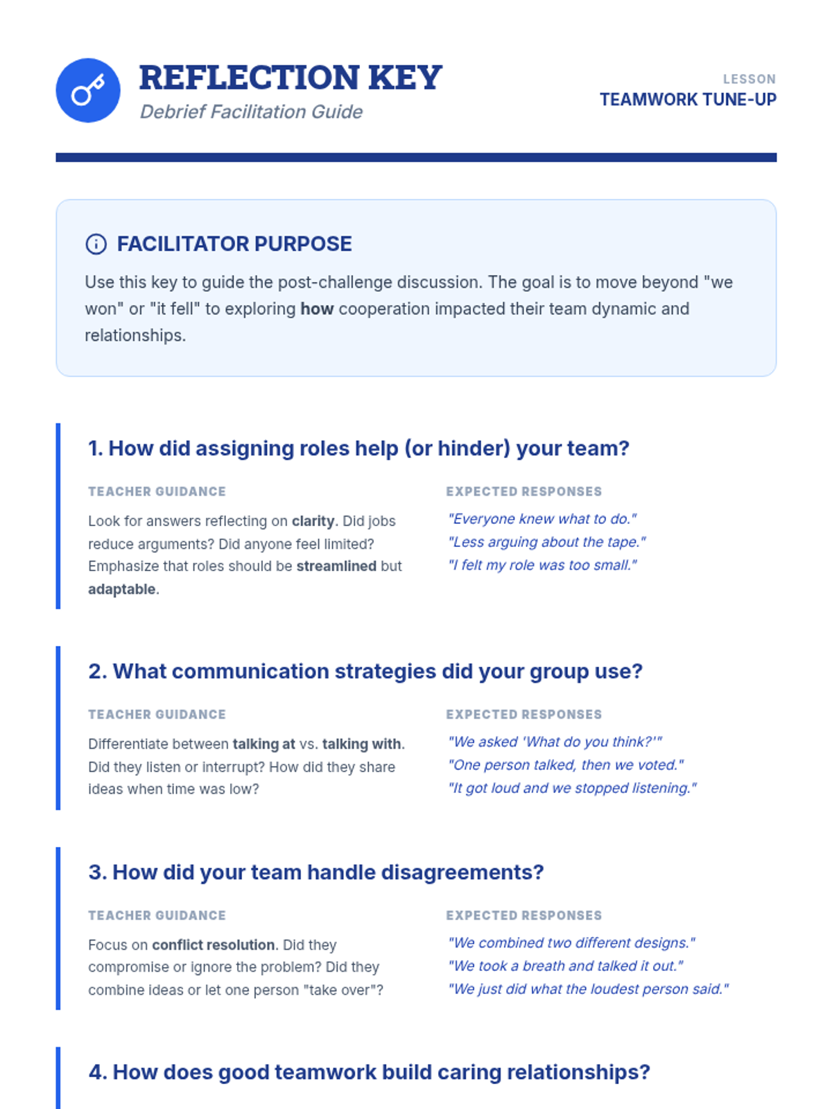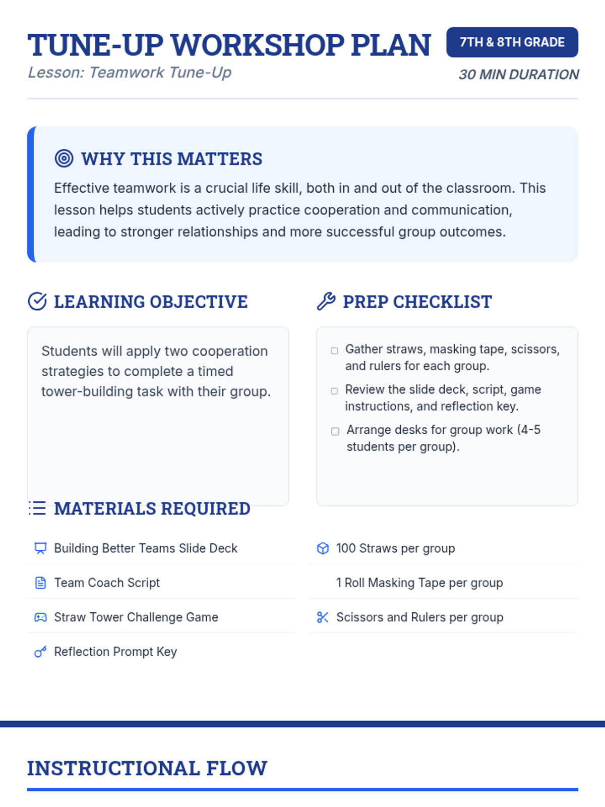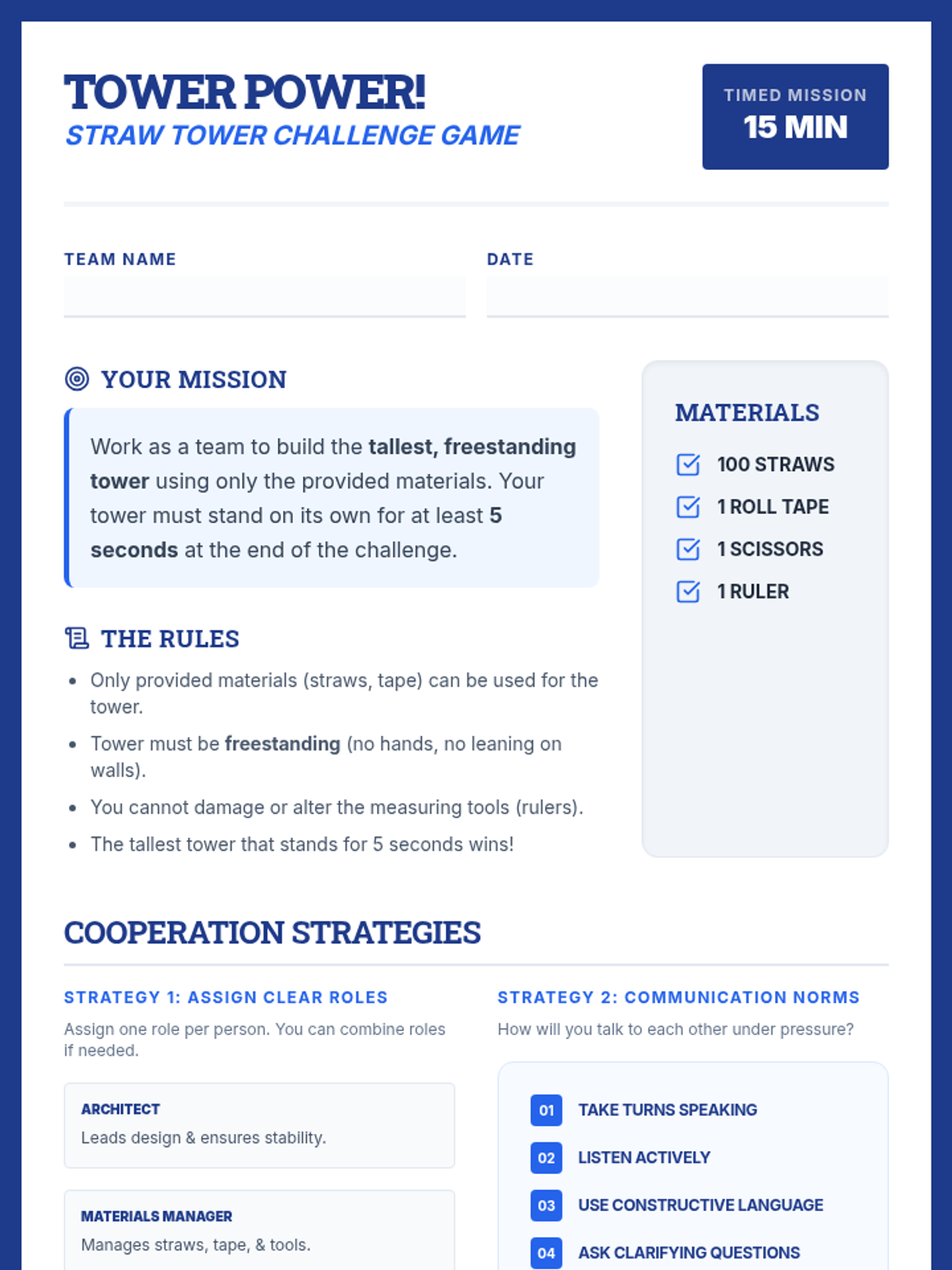 A 30-minute hands-on lesson for 7th and 8th graders to practice cooperation and communication through a timed tower-building challenge. Students learn to assign clear roles and establish communication norms to build stronger teams and relationships.