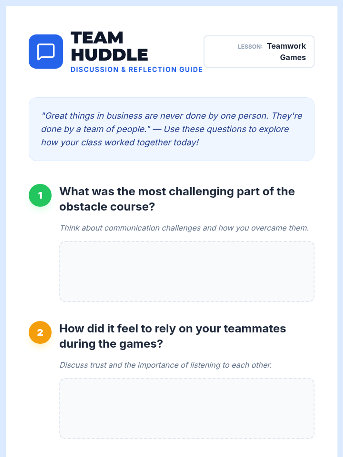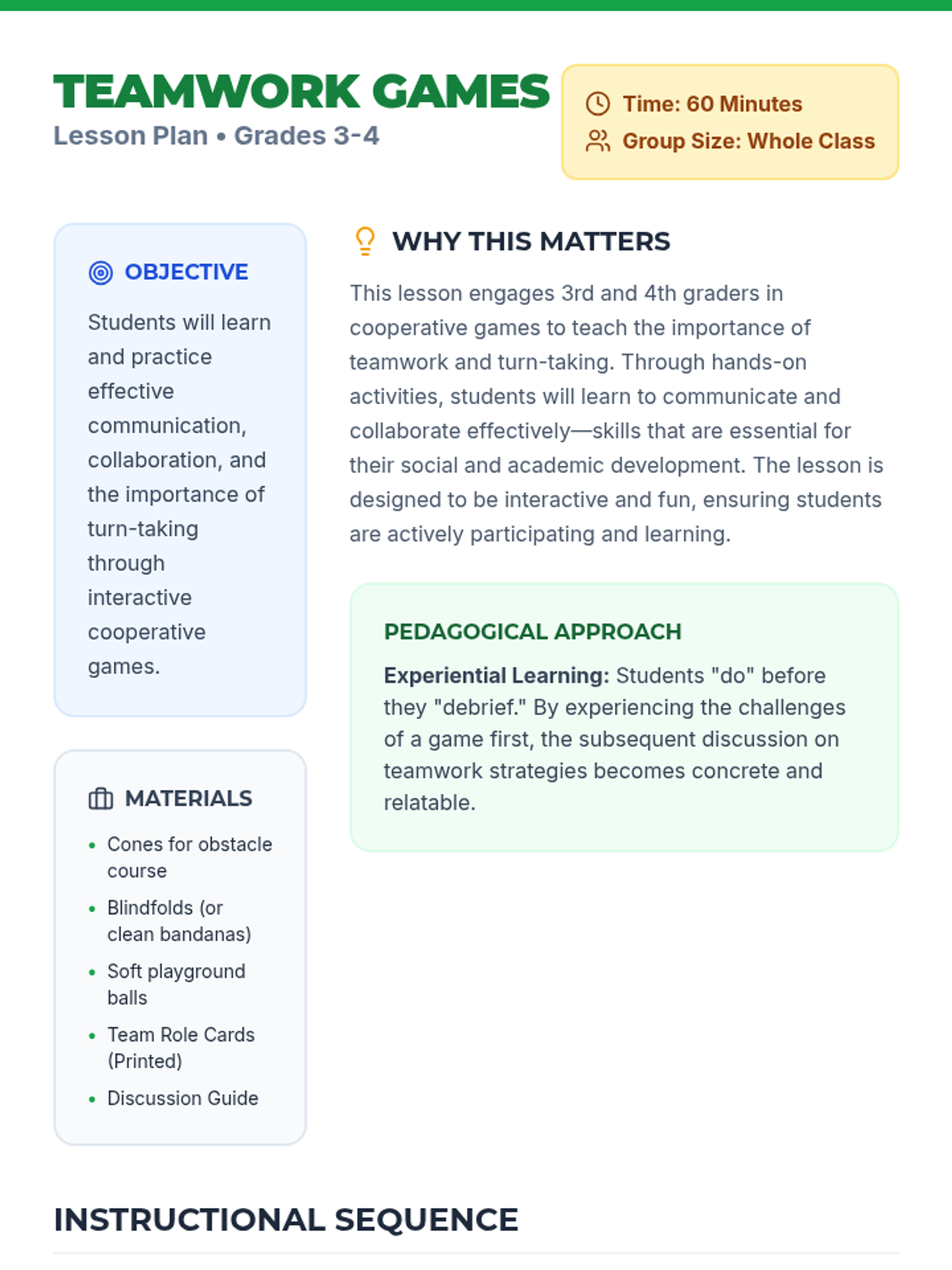 An interactive lesson for 3rd and 4th graders focused on cooperative games to teach teamwork and turn-taking through movement and discussion.