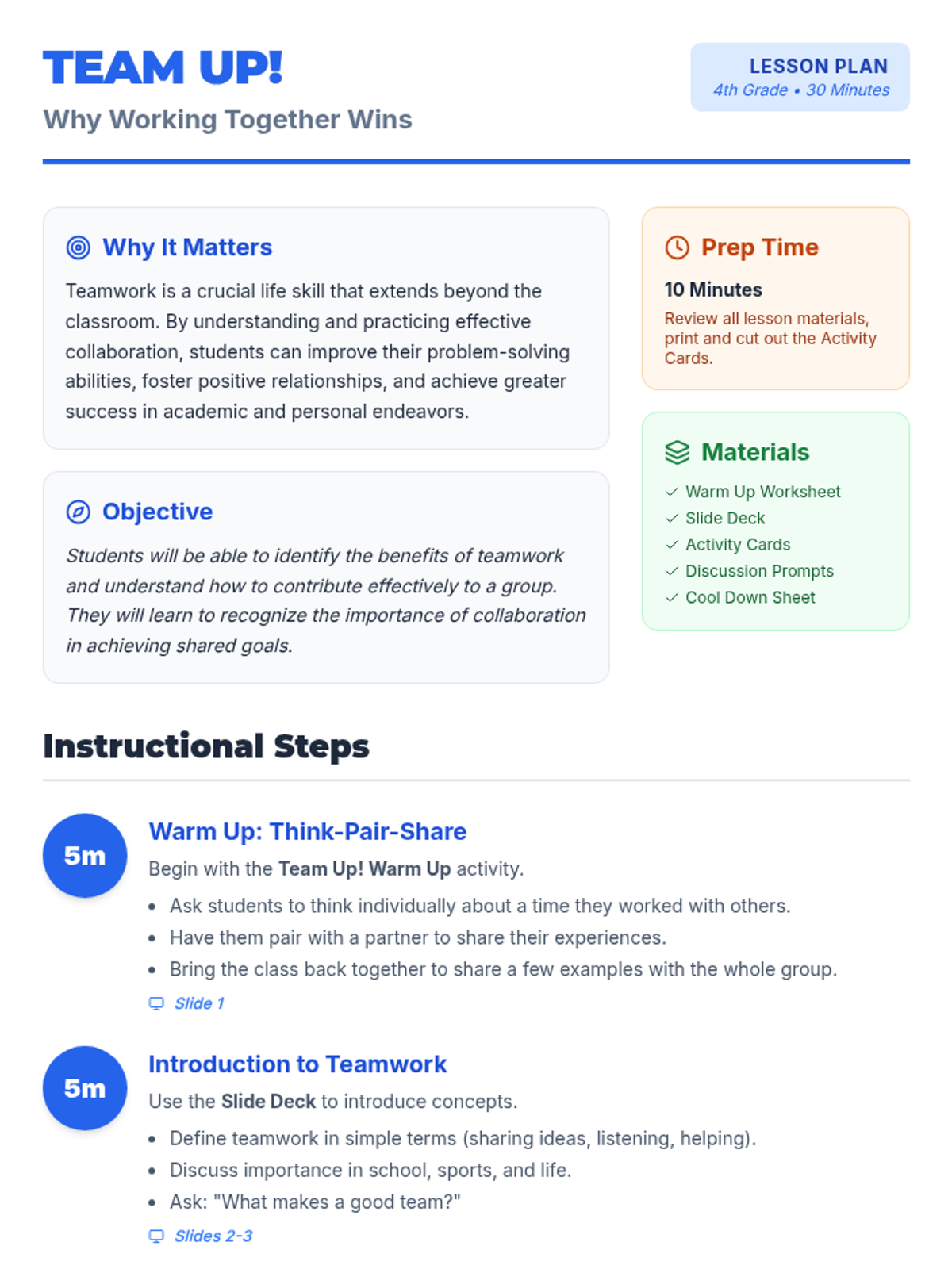 This lesson helps 4th-grade students understand the value and benefits of teamwork in various contexts, teaching them how collaboration leads to better outcomes and a more positive experience for everyone.