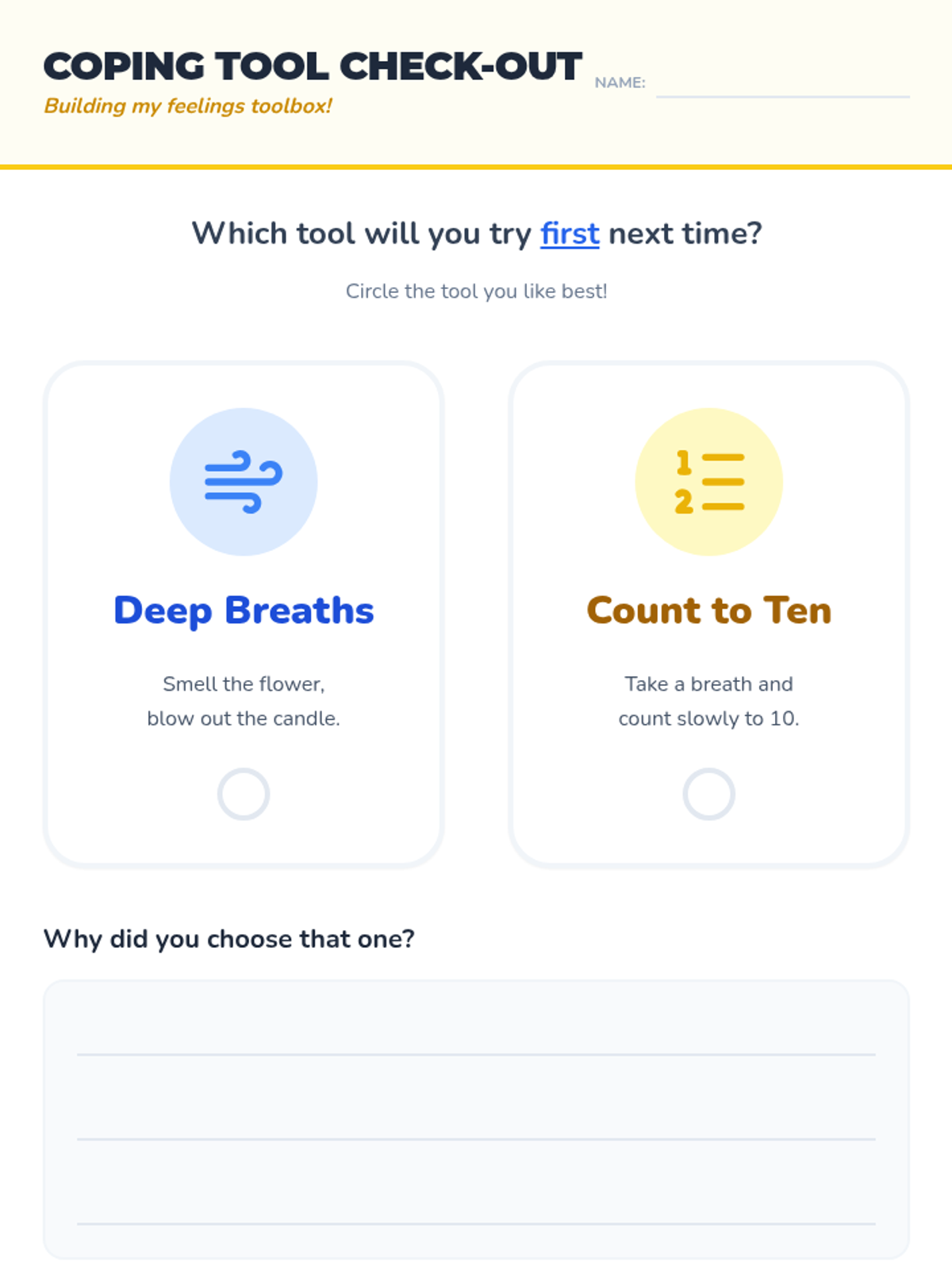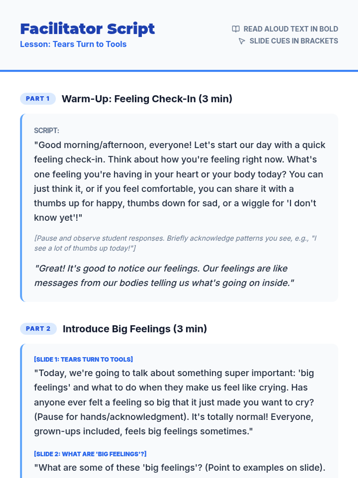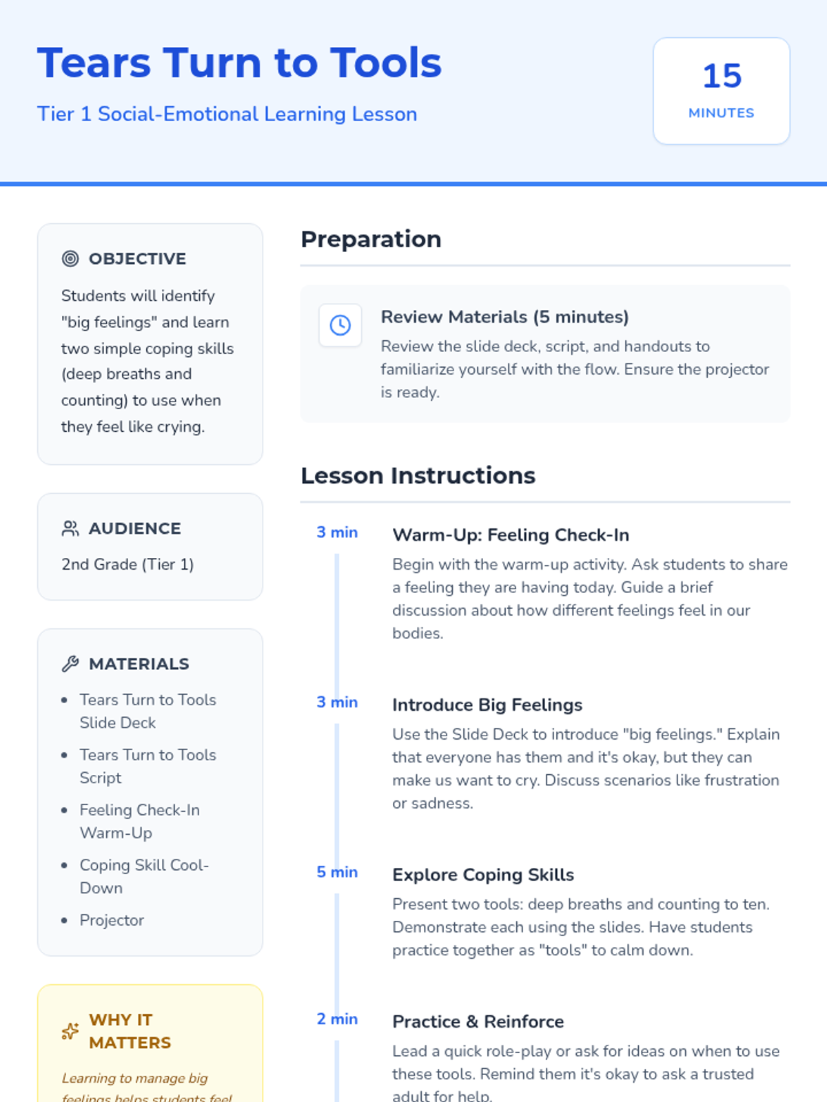 A 15-minute Tier 1 lesson for 2nd grade students focused on identifying 'big feelings' and practicing simple coping skills like deep breathing and counting to manage emotions.