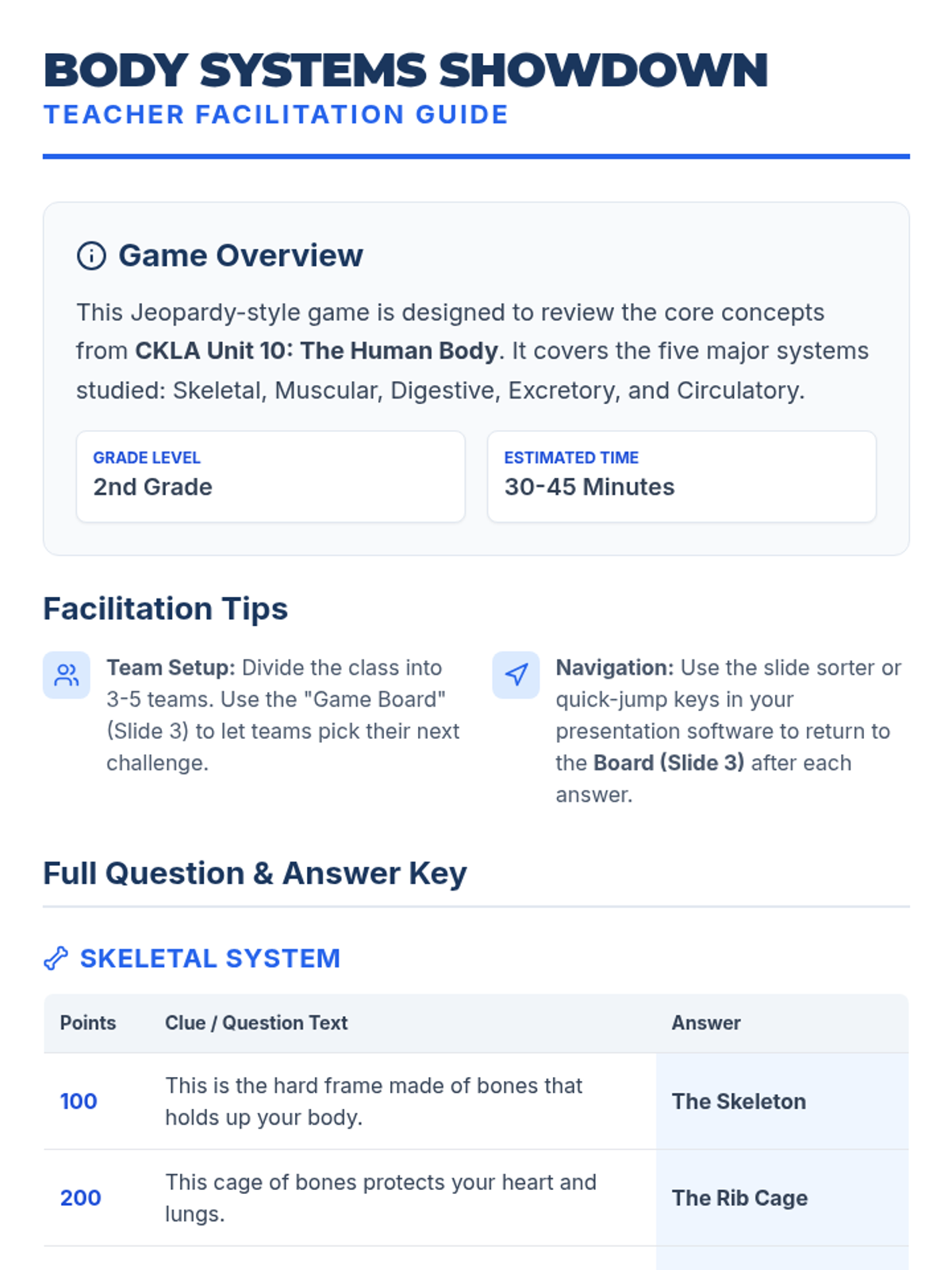 A fun, interactive Jeopardy-style review game for the 2nd Grade CKLA Unit 10 on Human Body Systems, covering the skeletal, muscular, digestive, excretory, and circulatory systems.