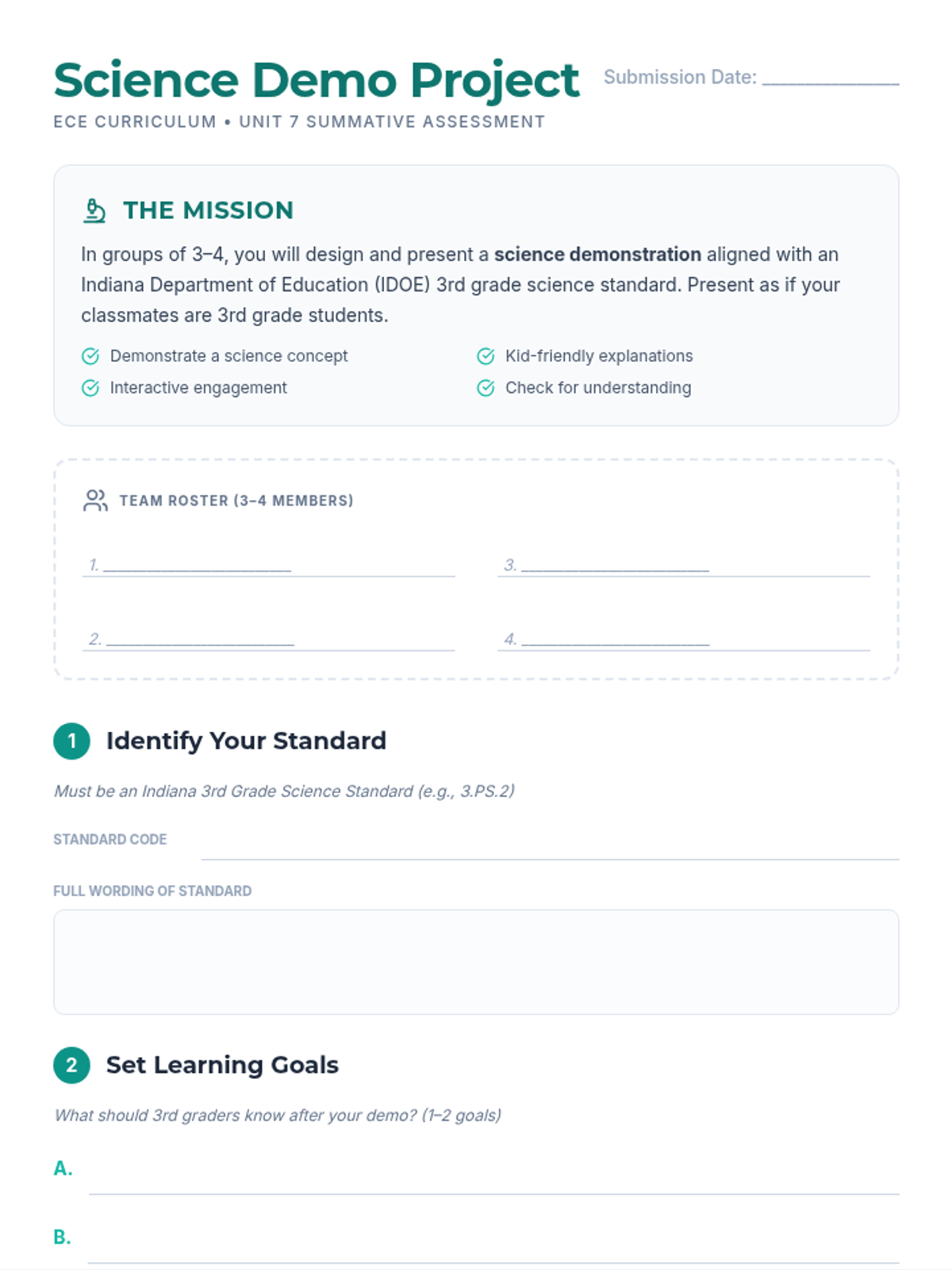 A comprehensive project guide and planning packet for ECE students to design and deliver a 3rd-grade science demonstration. Includes project requirements, a step-by-step planning workspace, and a grading rubric.