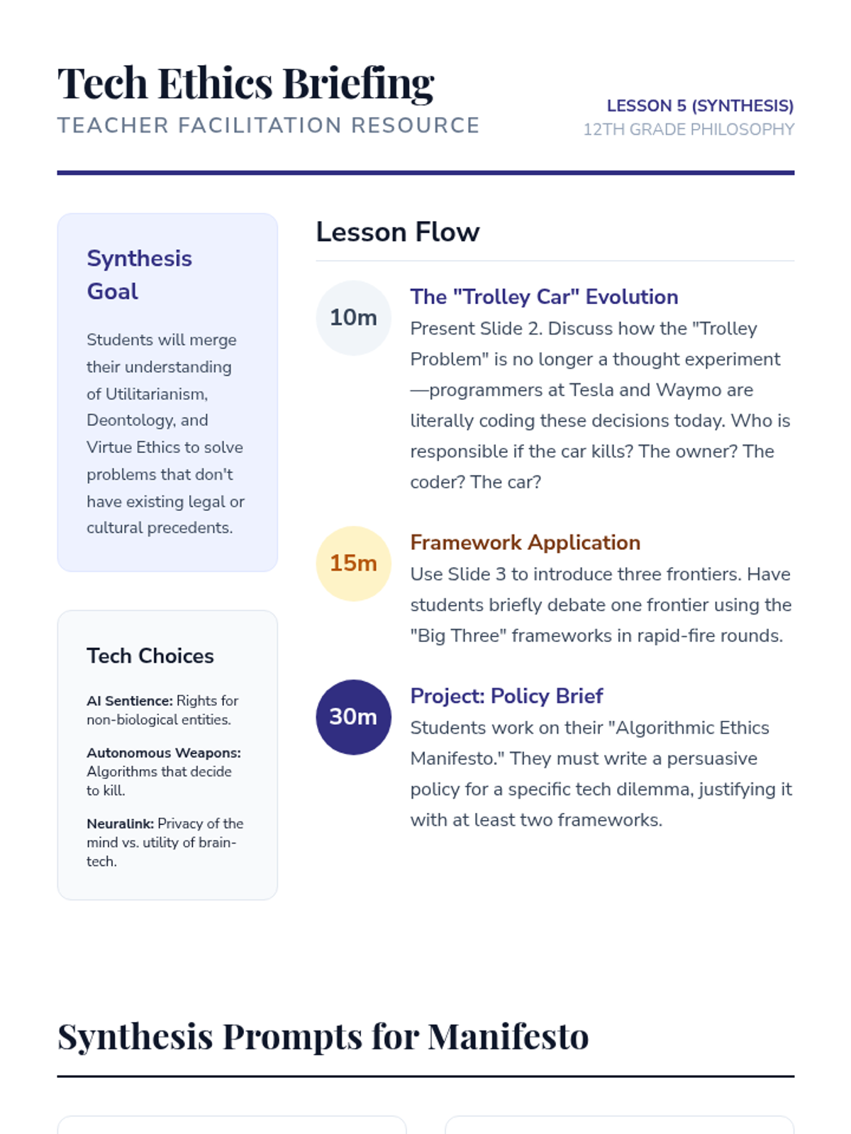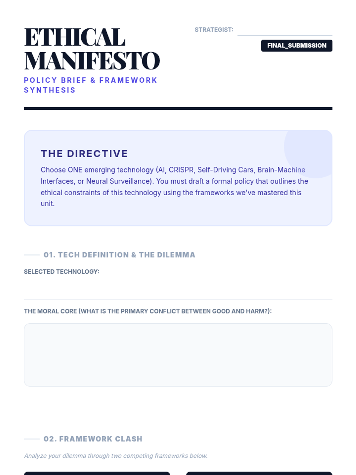 Application of ethical frameworks to AI, genetic engineering, and surveillance, culminating in a policy brief.