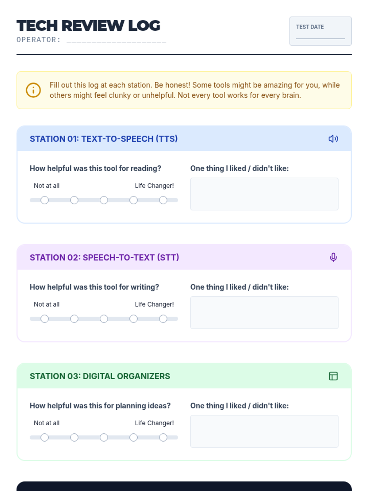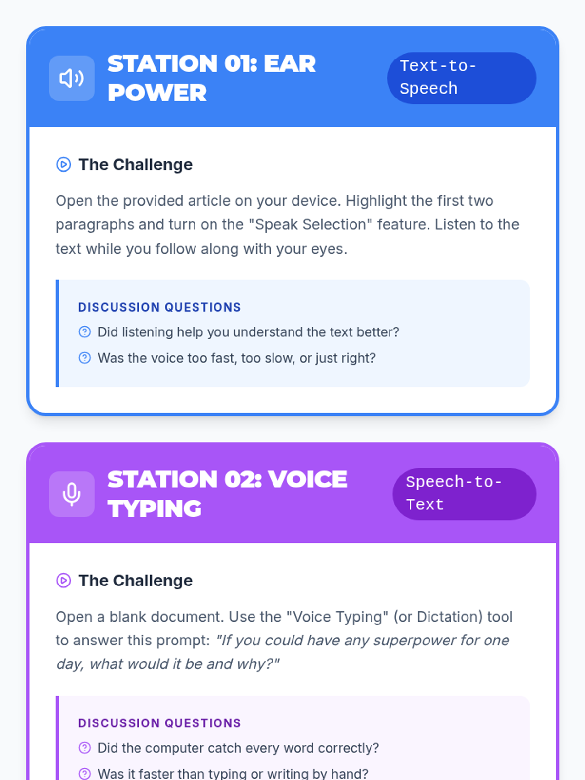 Students rotate through stations to test common assistive technologies and evaluate their effectiveness for different learning tasks.