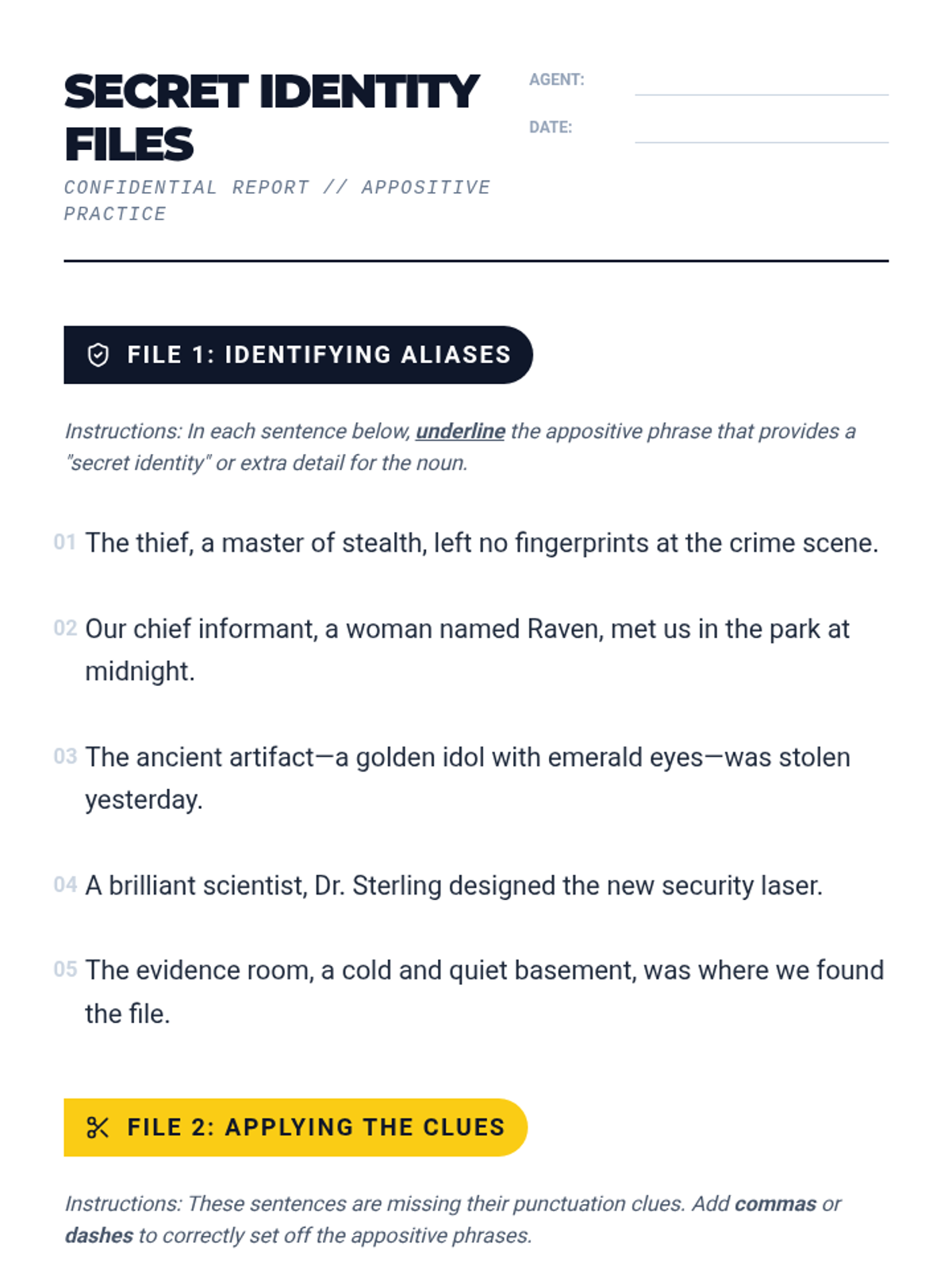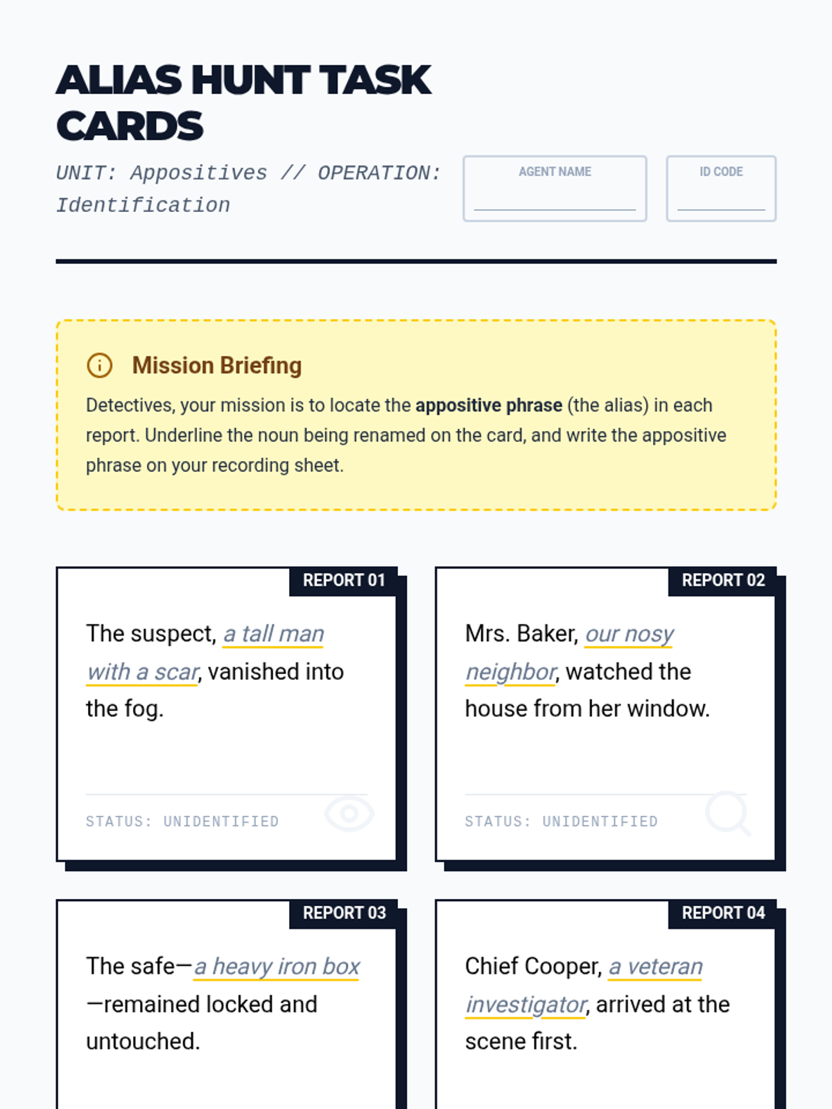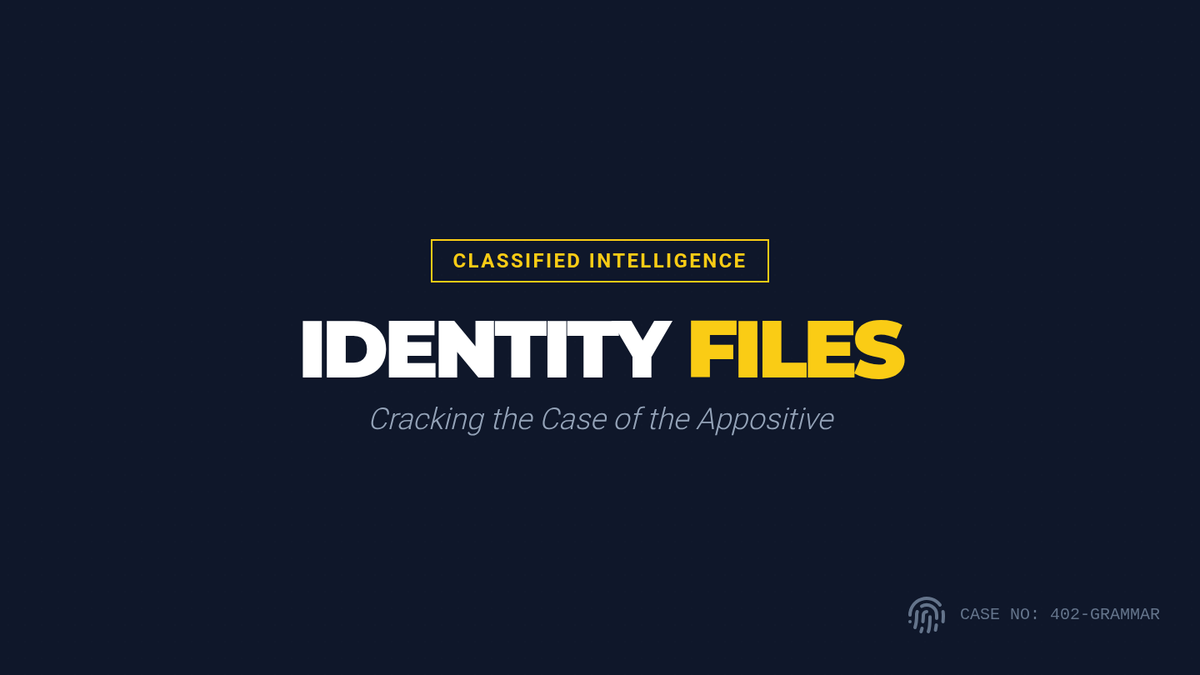 A lesson focused on identifying and using appositives to add detail and variety to sentences, using a detective-themed 'Identity Files' approach.