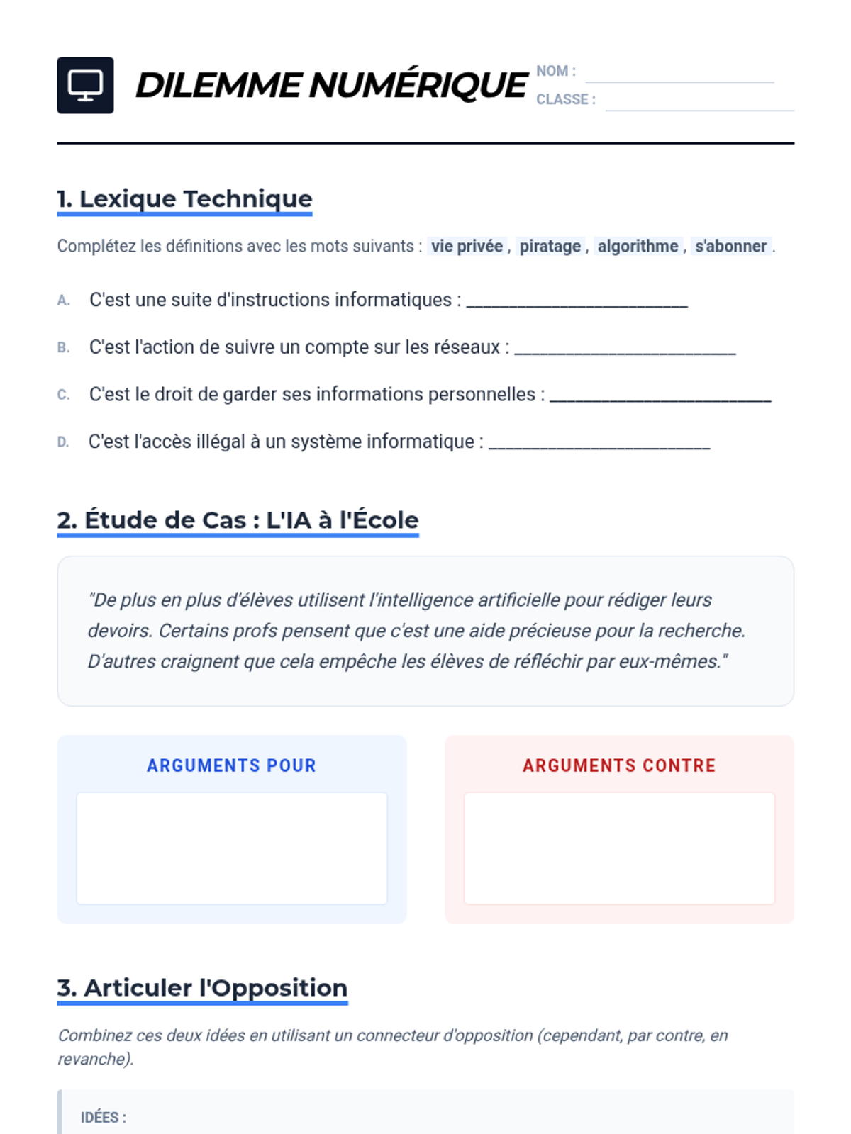 Focusing on the digital world, students acquire vocabulary for internet safety, social media, and innovation. They engage in a 'for and against' activity, using transition words to contrast ideas.