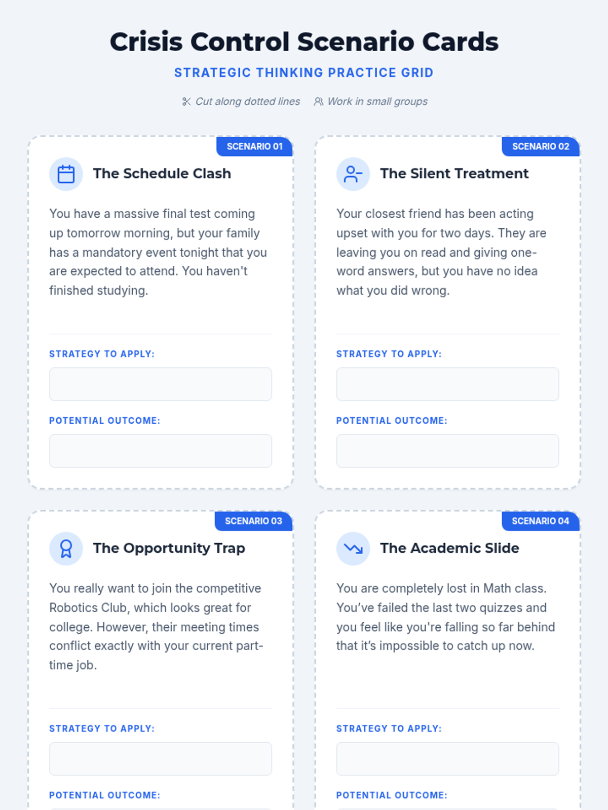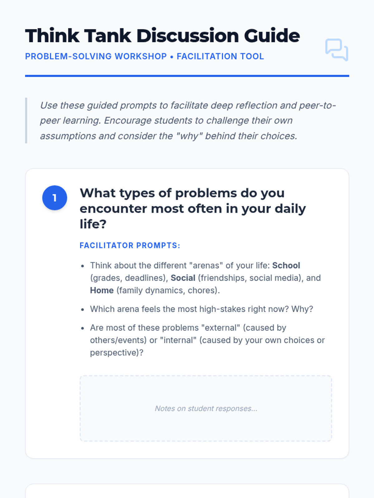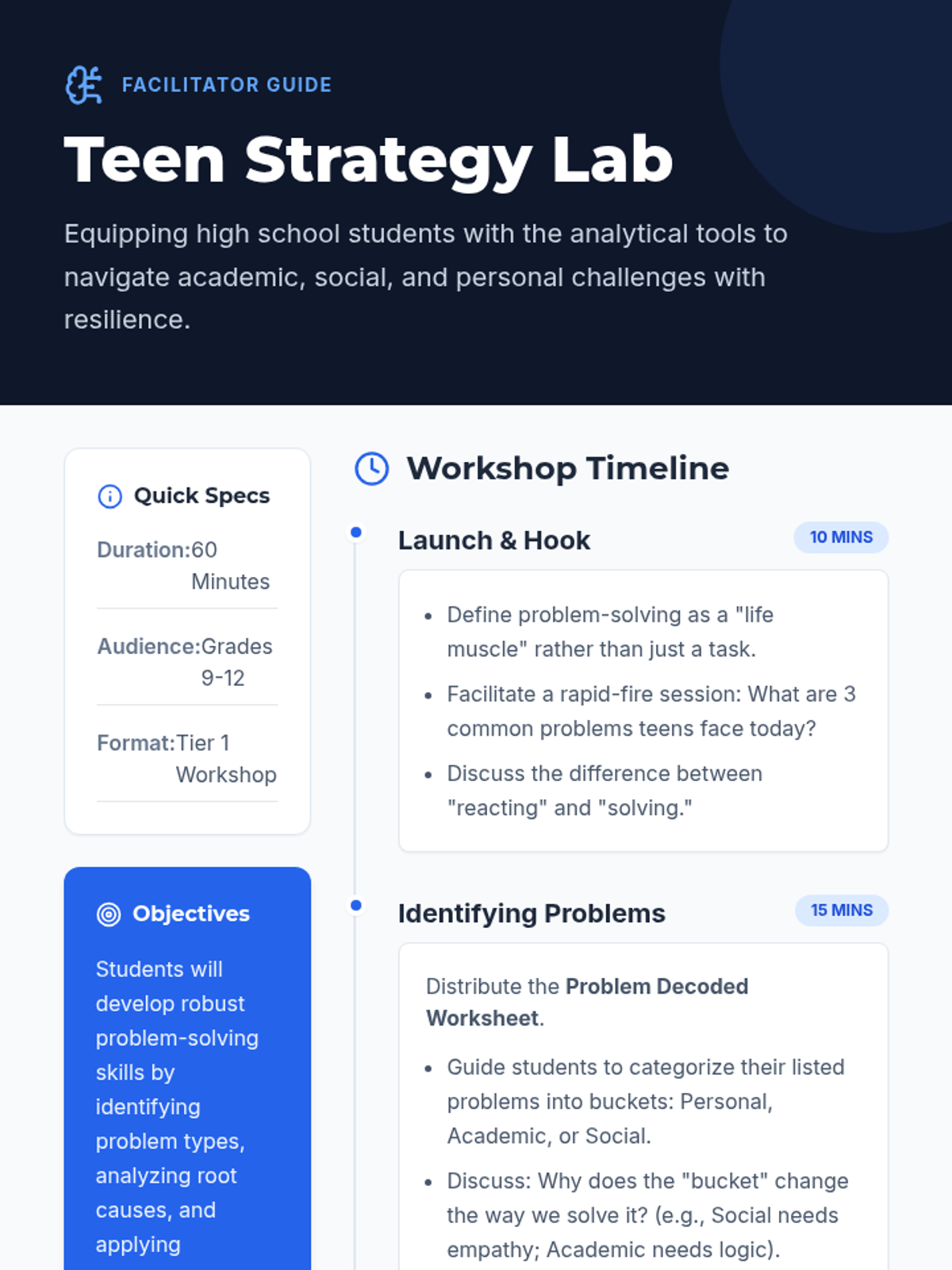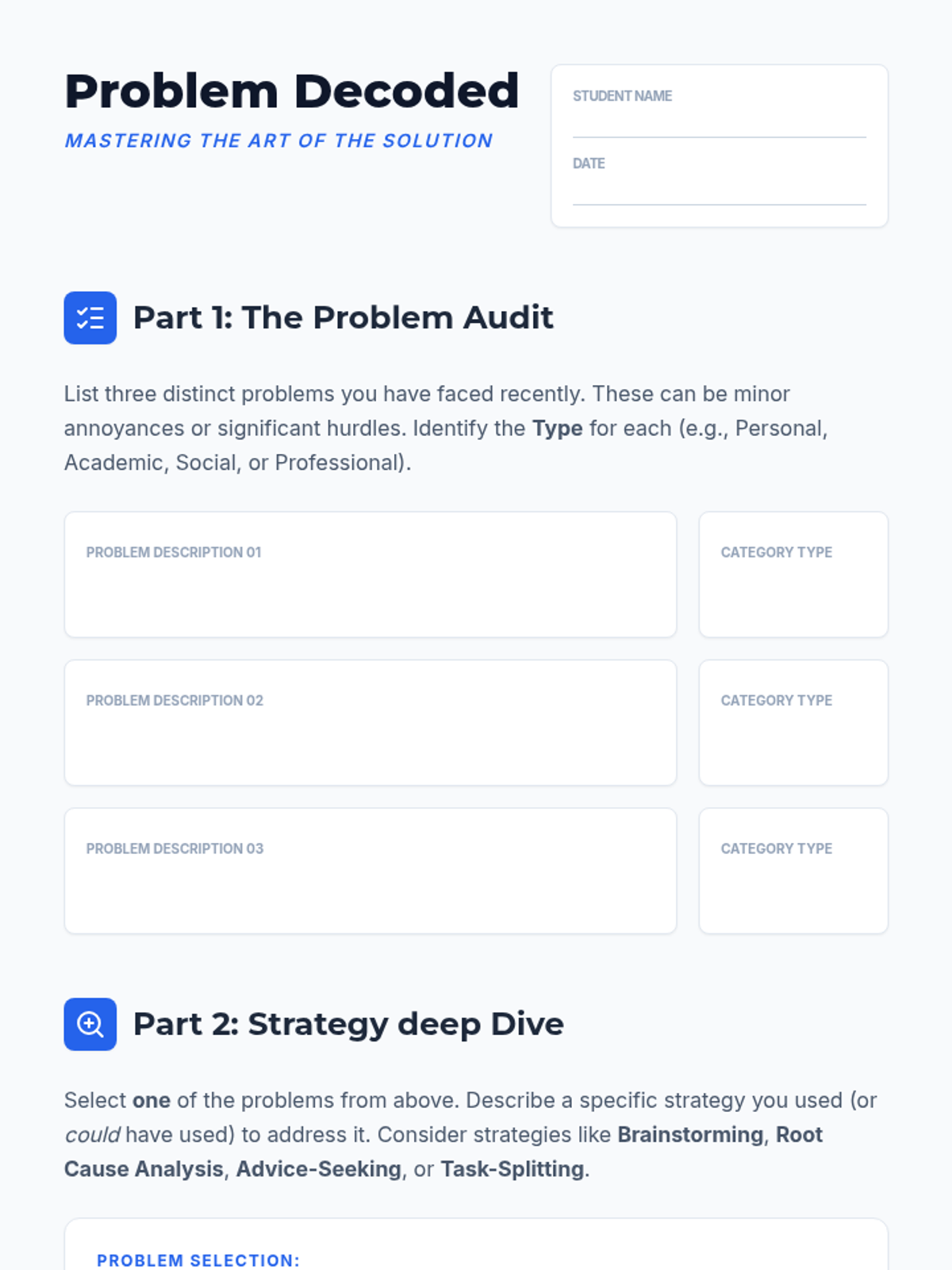 This lesson focuses on enhancing problem-solving skills among high school students by identifying different types of problems and exploring effective strategies to address them. Students will practice brainstorming and root cause analysis through scenario-based activities.