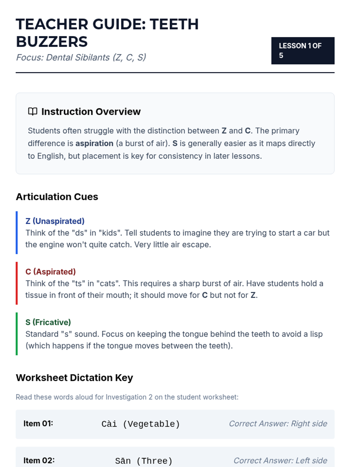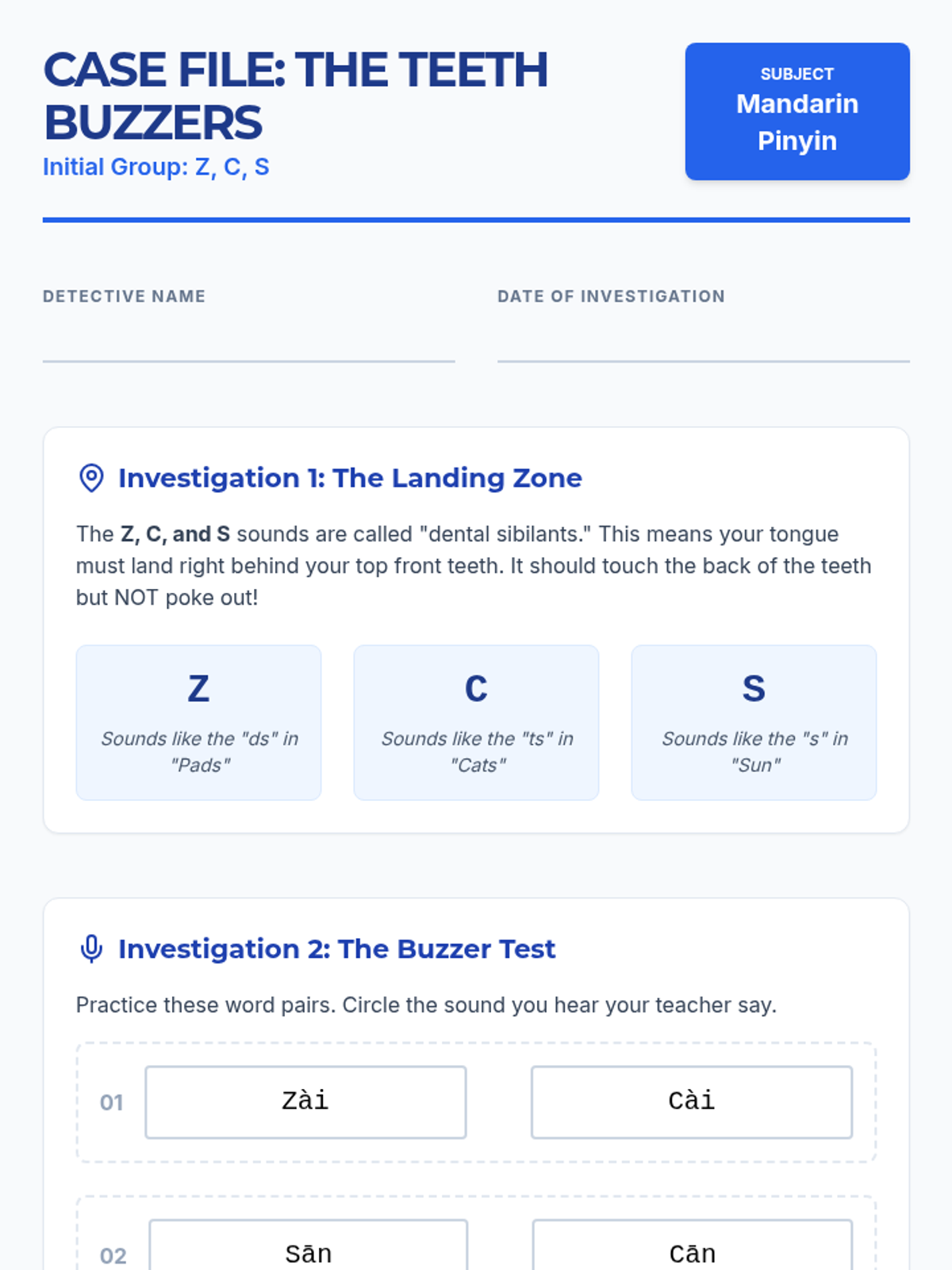 Students master the dental sibilant initials (z, c, s) by exploring tongue placement behind the teeth and practicing the distinct buzzing air-flow.