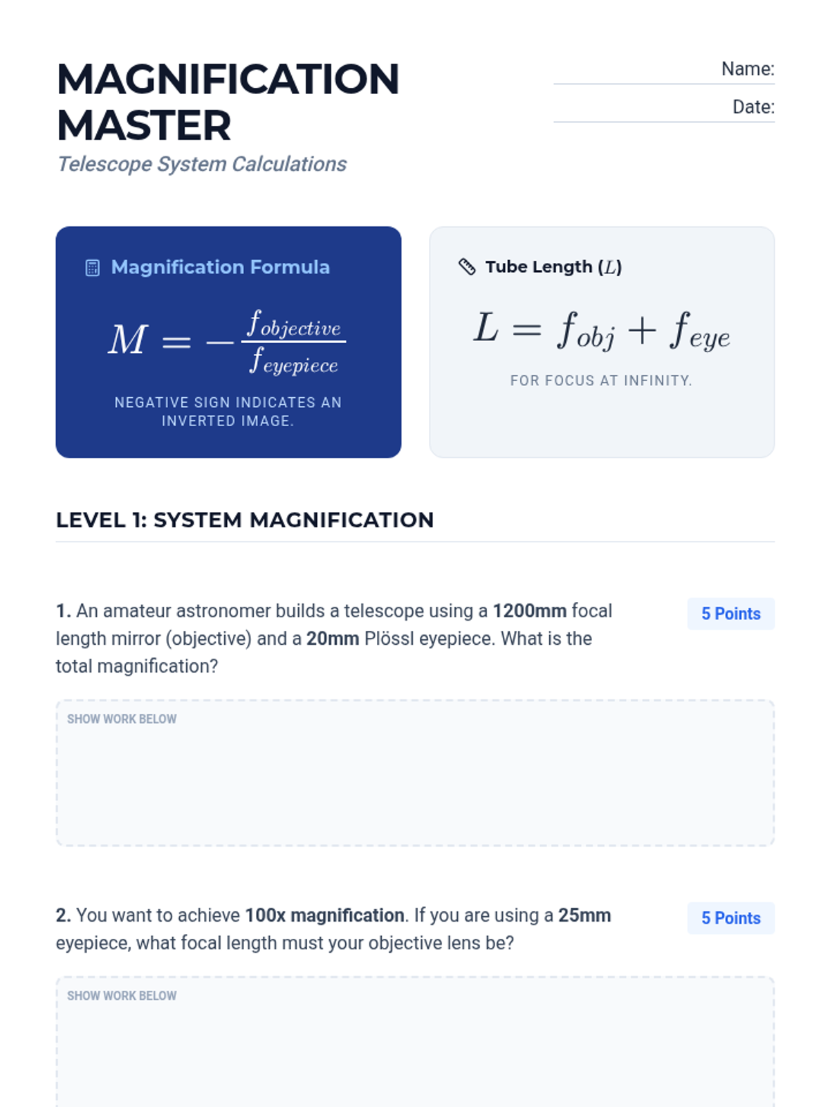 Focusing on the Keplerian telescope, students learn how an objective lens and an eyepiece function together and calculate system magnification.