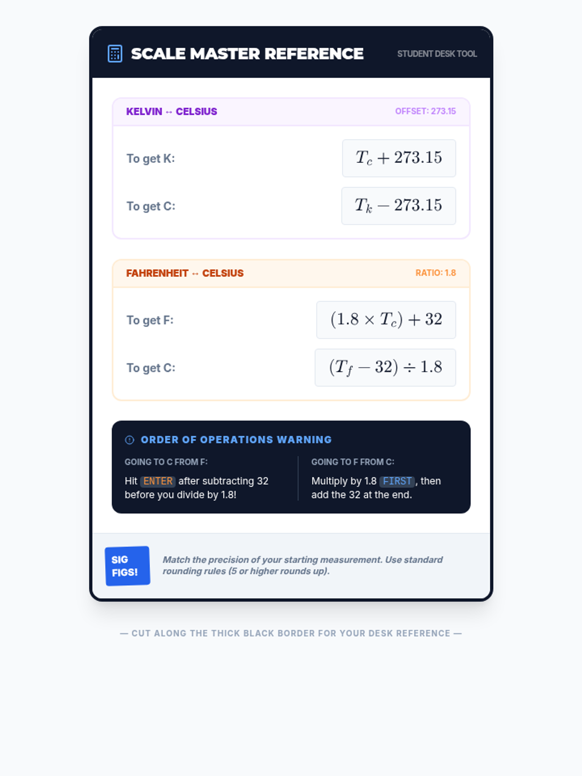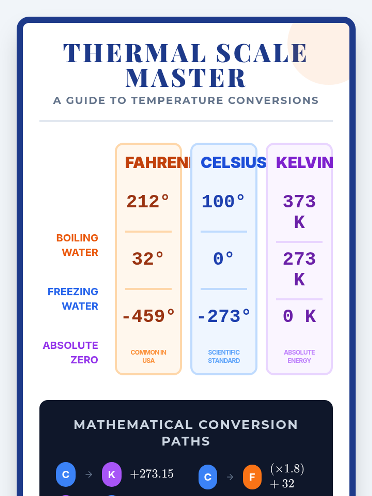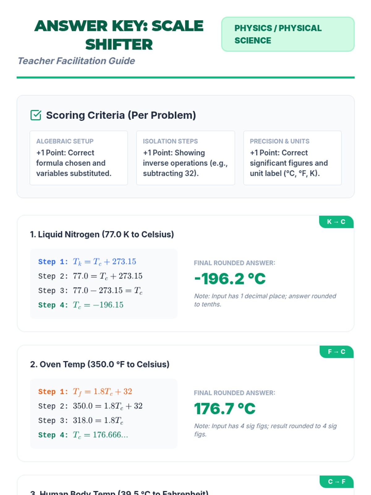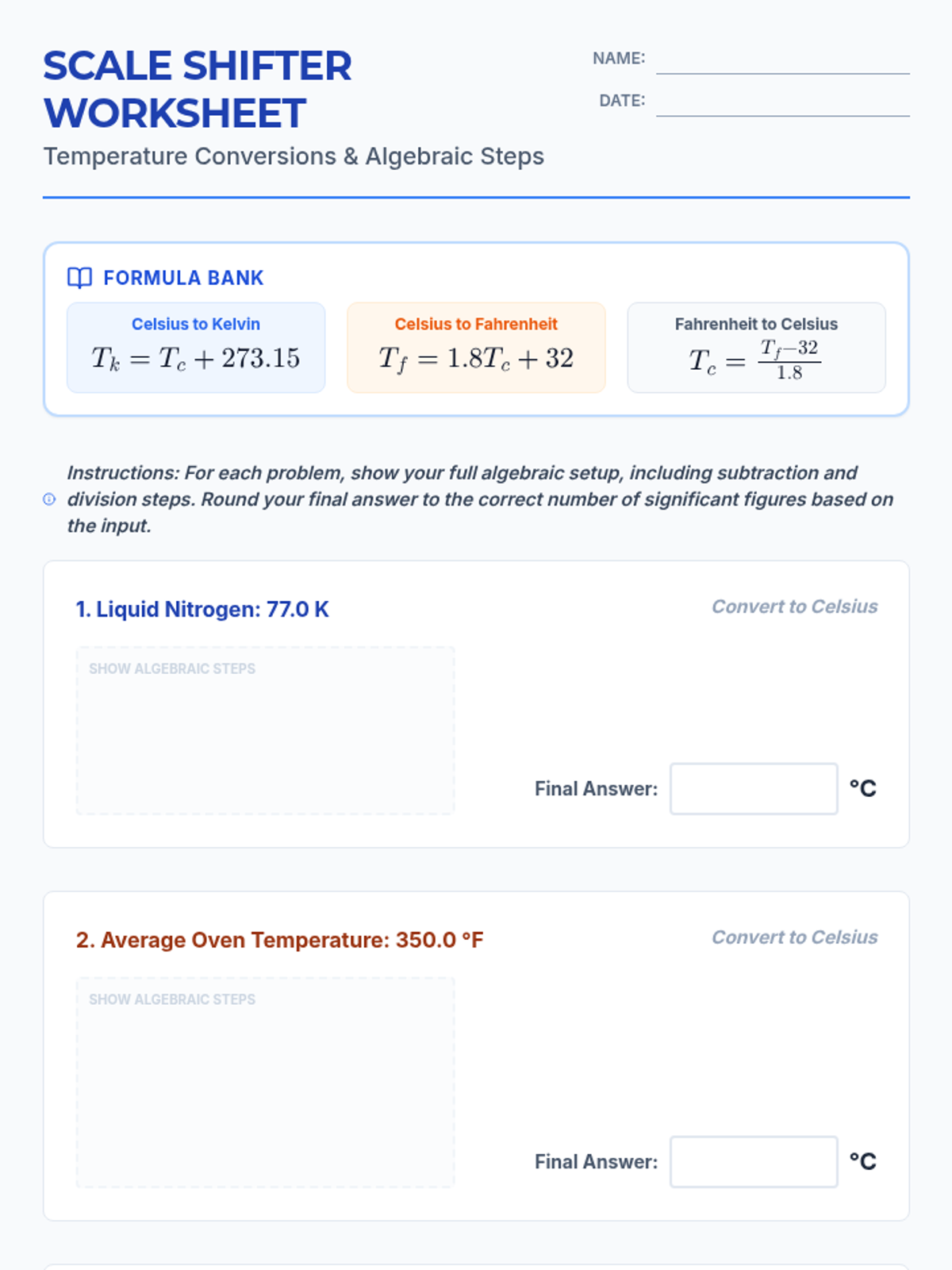 Students will master the algebraic conversion between Fahrenheit, Celsius, and Kelvin scales. This lesson uses a step-by-step video guide to teach the mathematical procedures, emphasizing significant figures and algebraic isolation of variables.