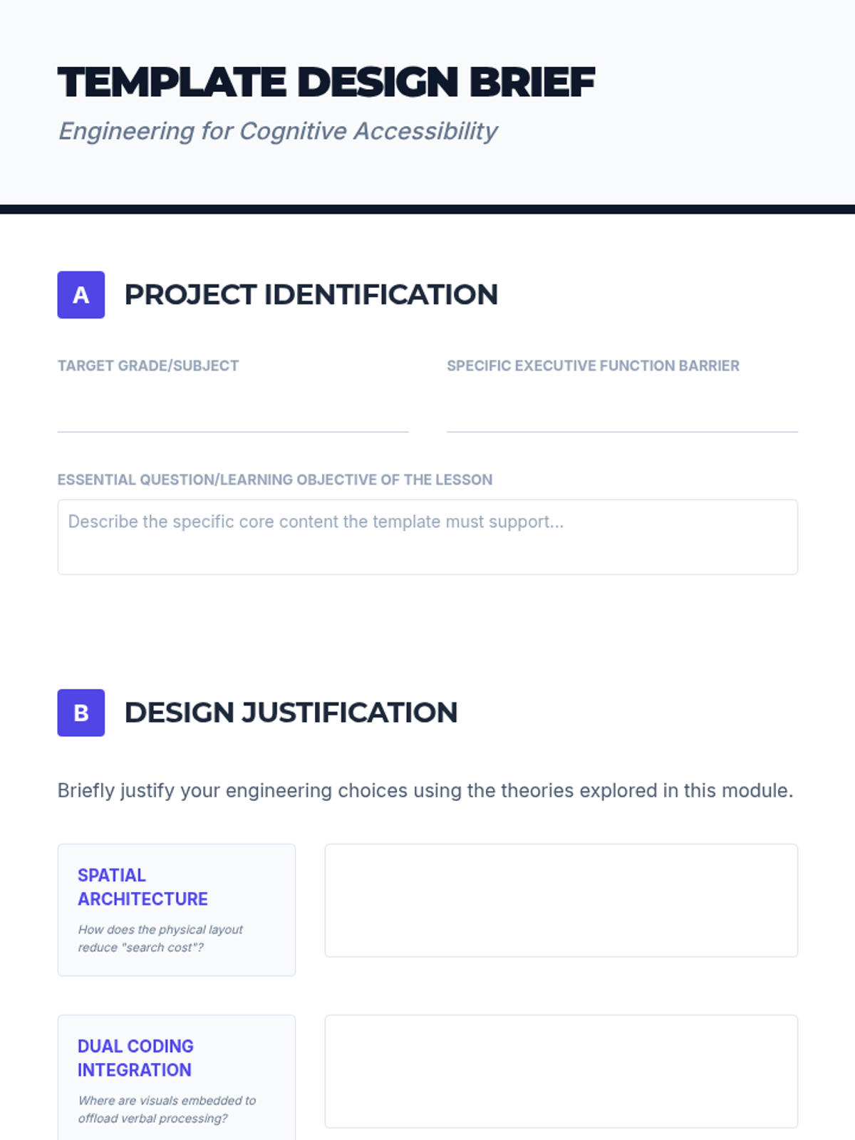 Students apply design principles to create specialized note-taking templates tailored for learners with executive function challenges, justifying choices with research.