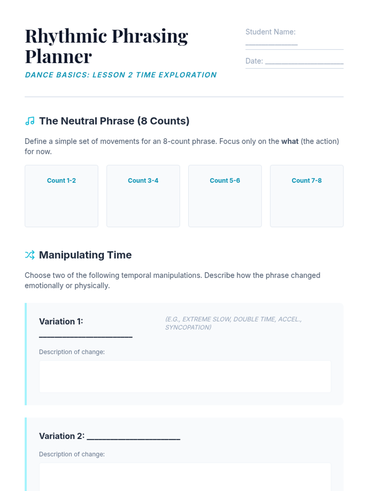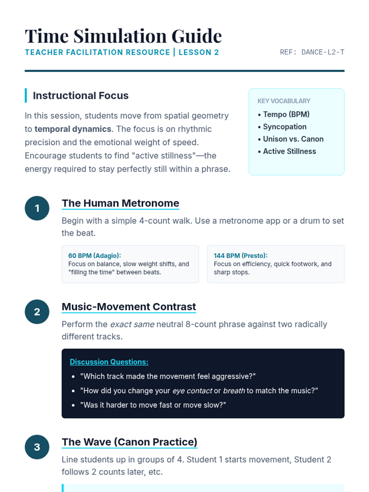 Focusing on Time, students explore how tempo, beat, and rhythmic patterns alter movement perception.
