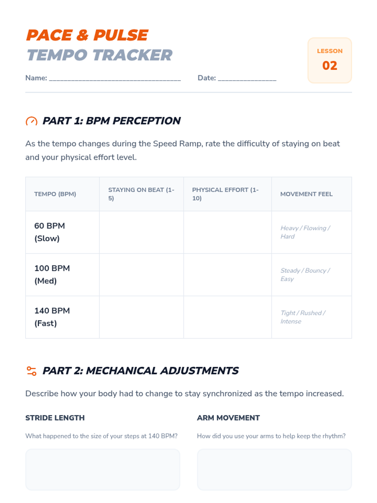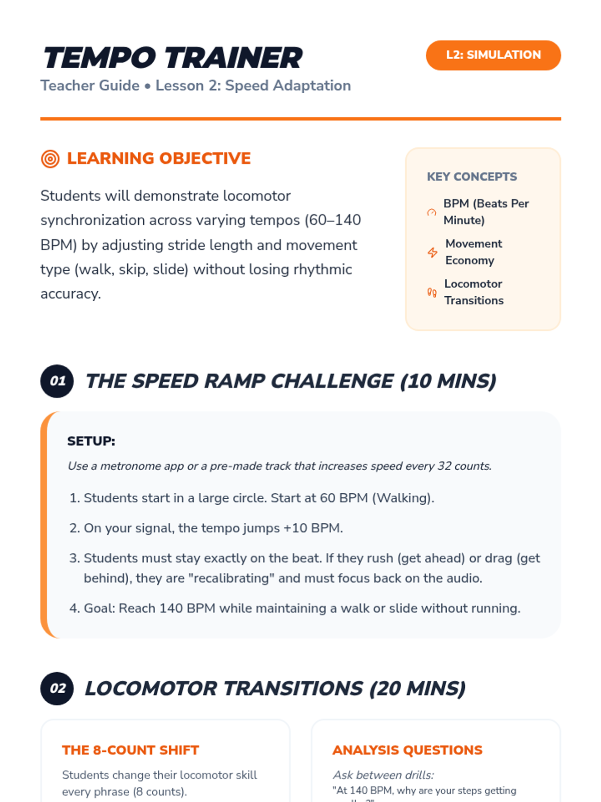 Exploration of how tempo changes affect locomotor movements like walking, skipping, and sliding, focusing on energy regulation.