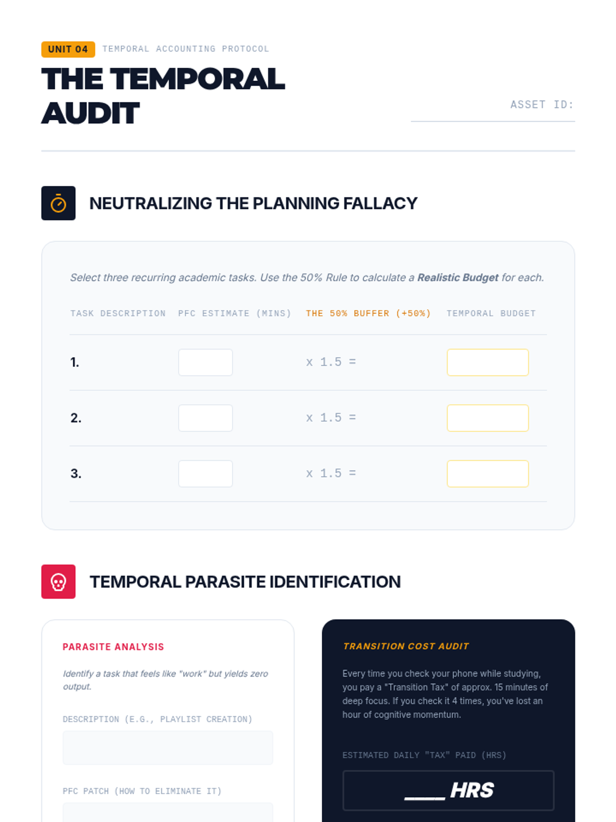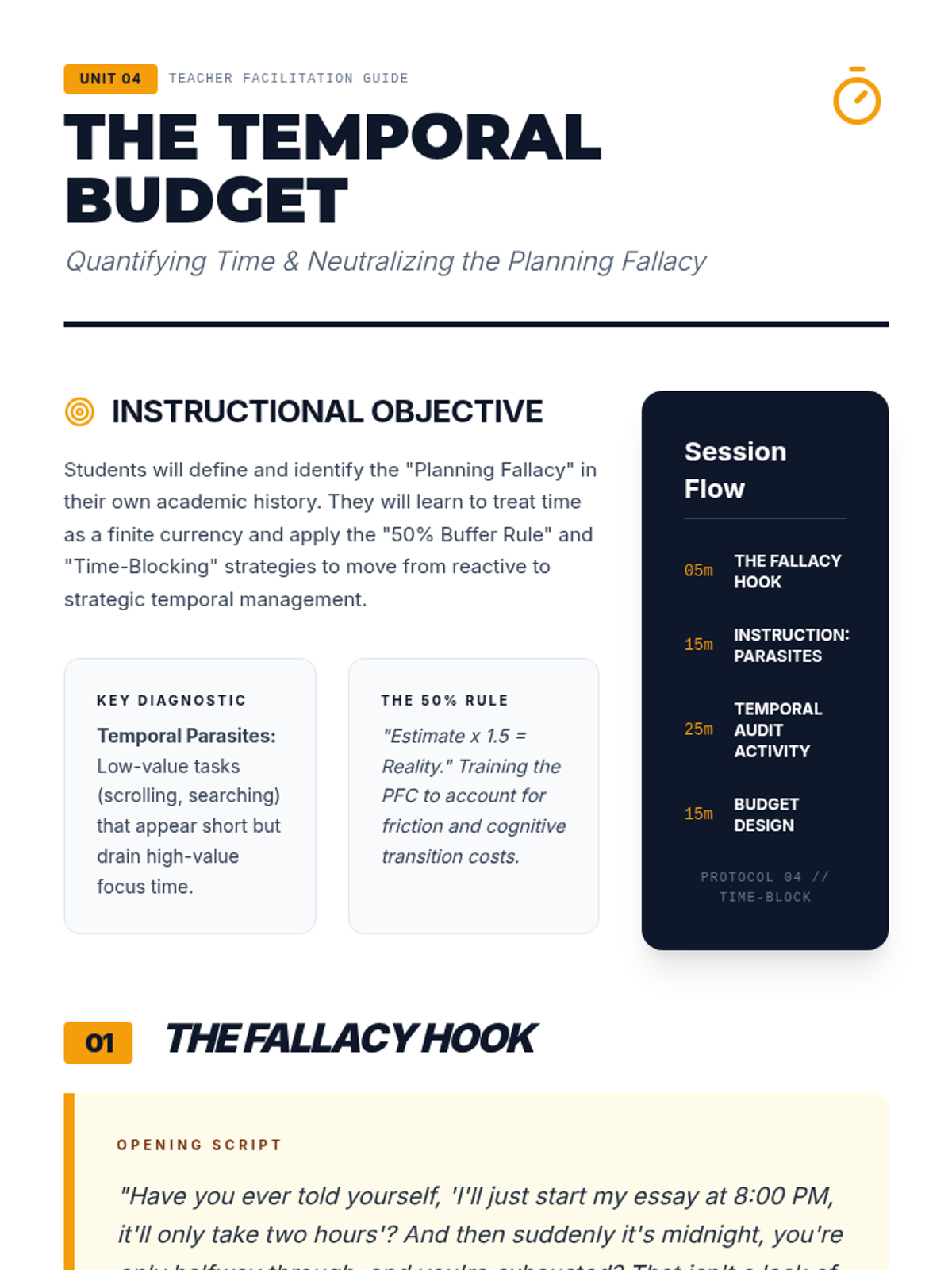 A deep dive into time estimation, the 'planning fallacy', and the 'Temporal Budgeting' strategy. Students learn to manage time as a finite cognitive resource.