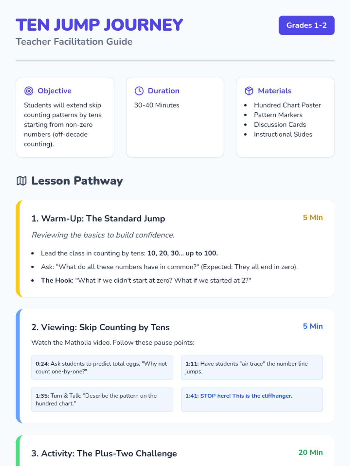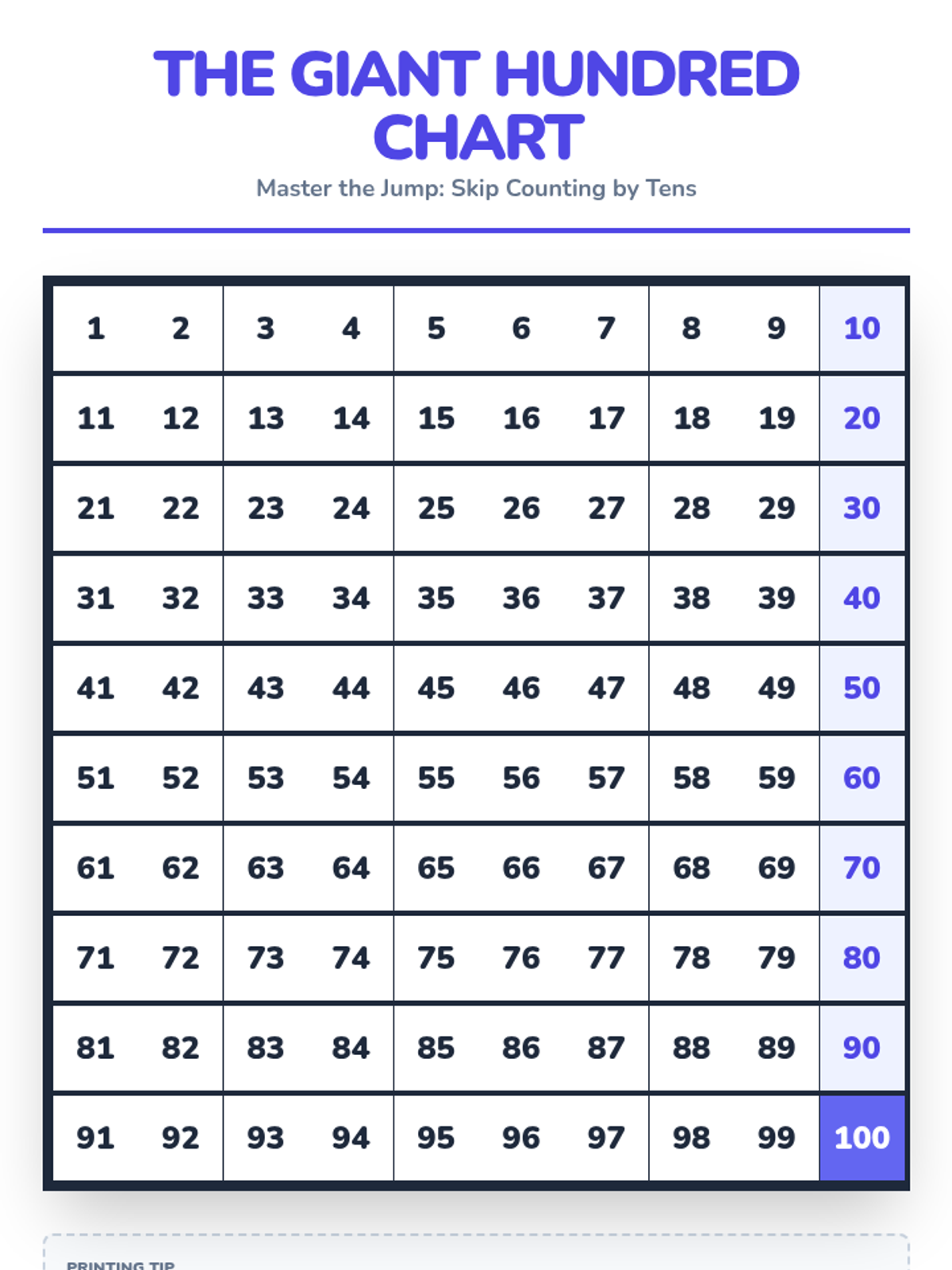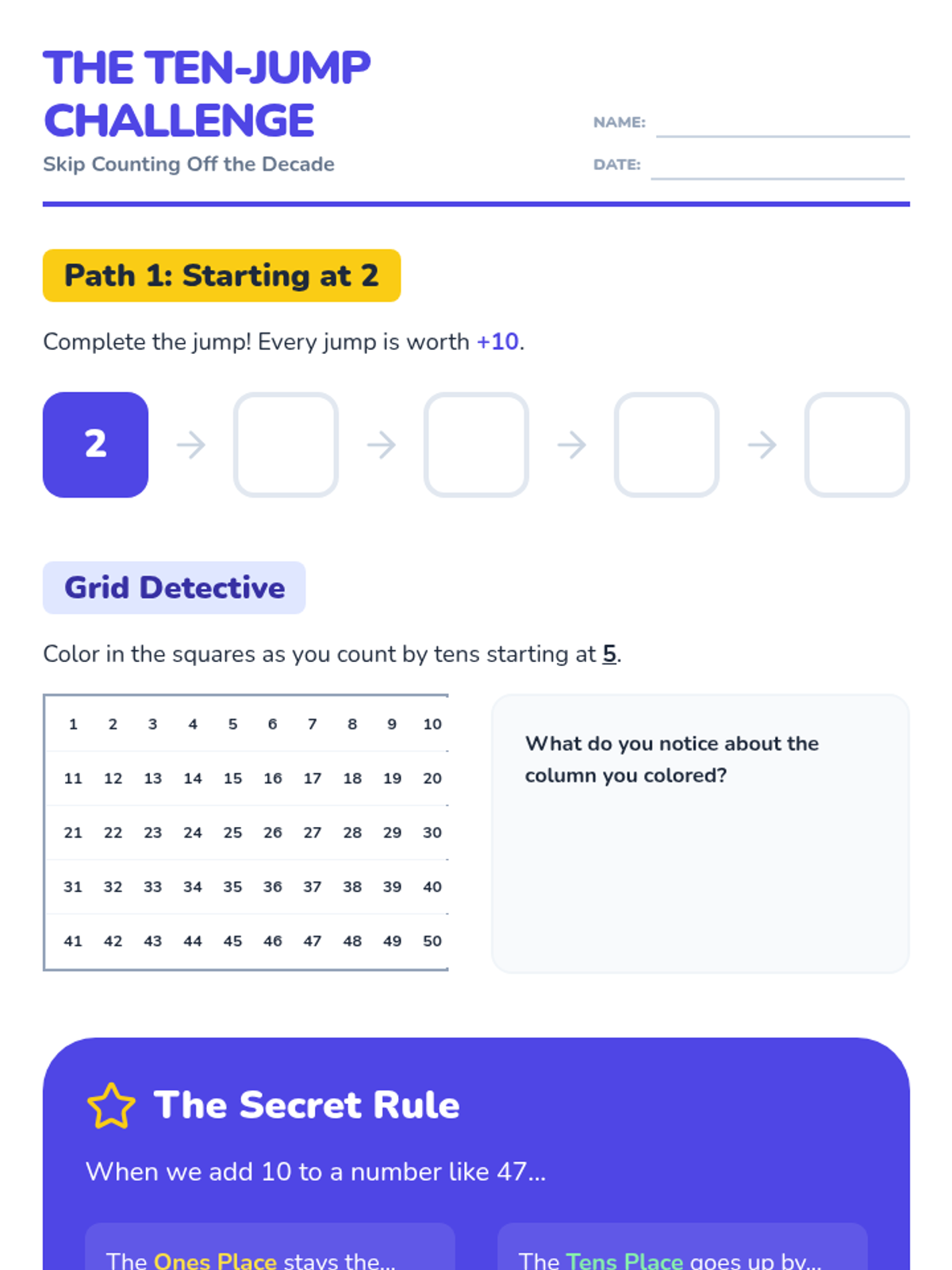A lesson for advanced 1st/early 2nd graders to master off-decade skip counting by tens, focusing on patterns within the hundred chart.