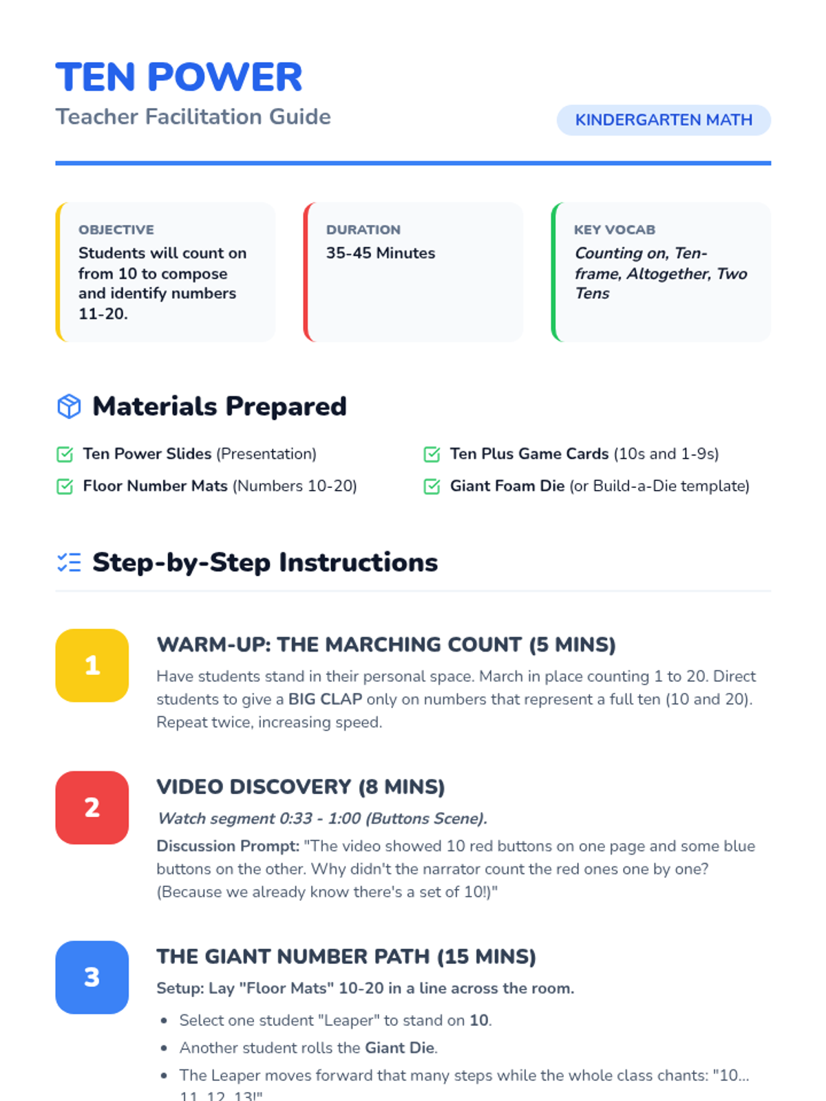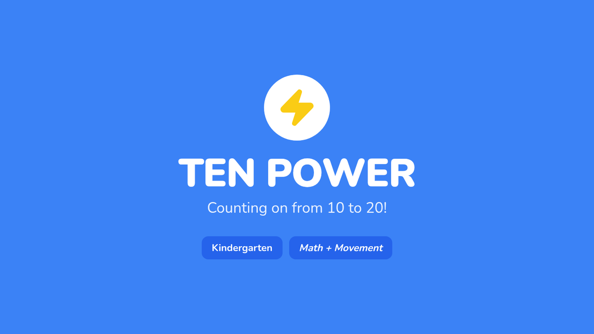 A movement-based Kindergarten lesson focusing on the '10 and...' concept to count and compose numbers from 11-20. Students use a floor number line, watch a guided video, and play partner games to reinforce counting on from ten.