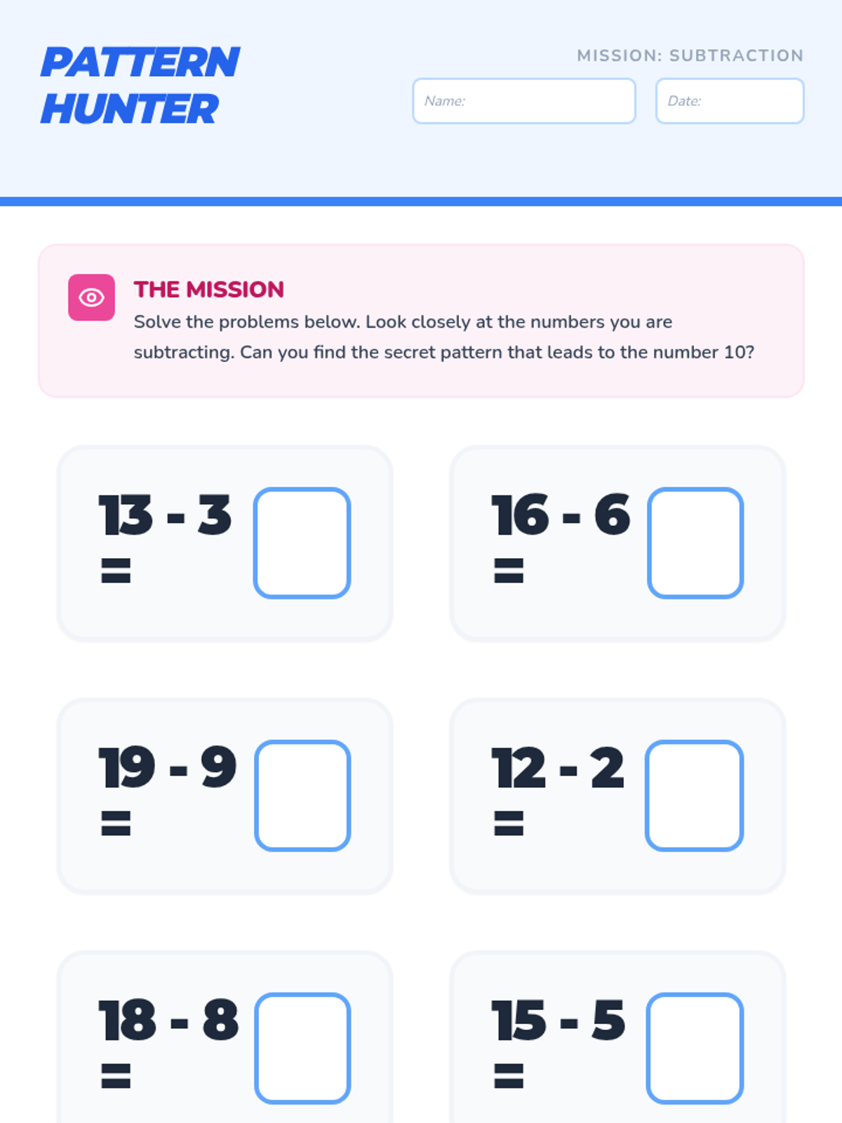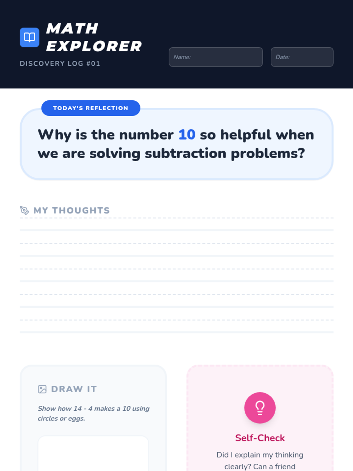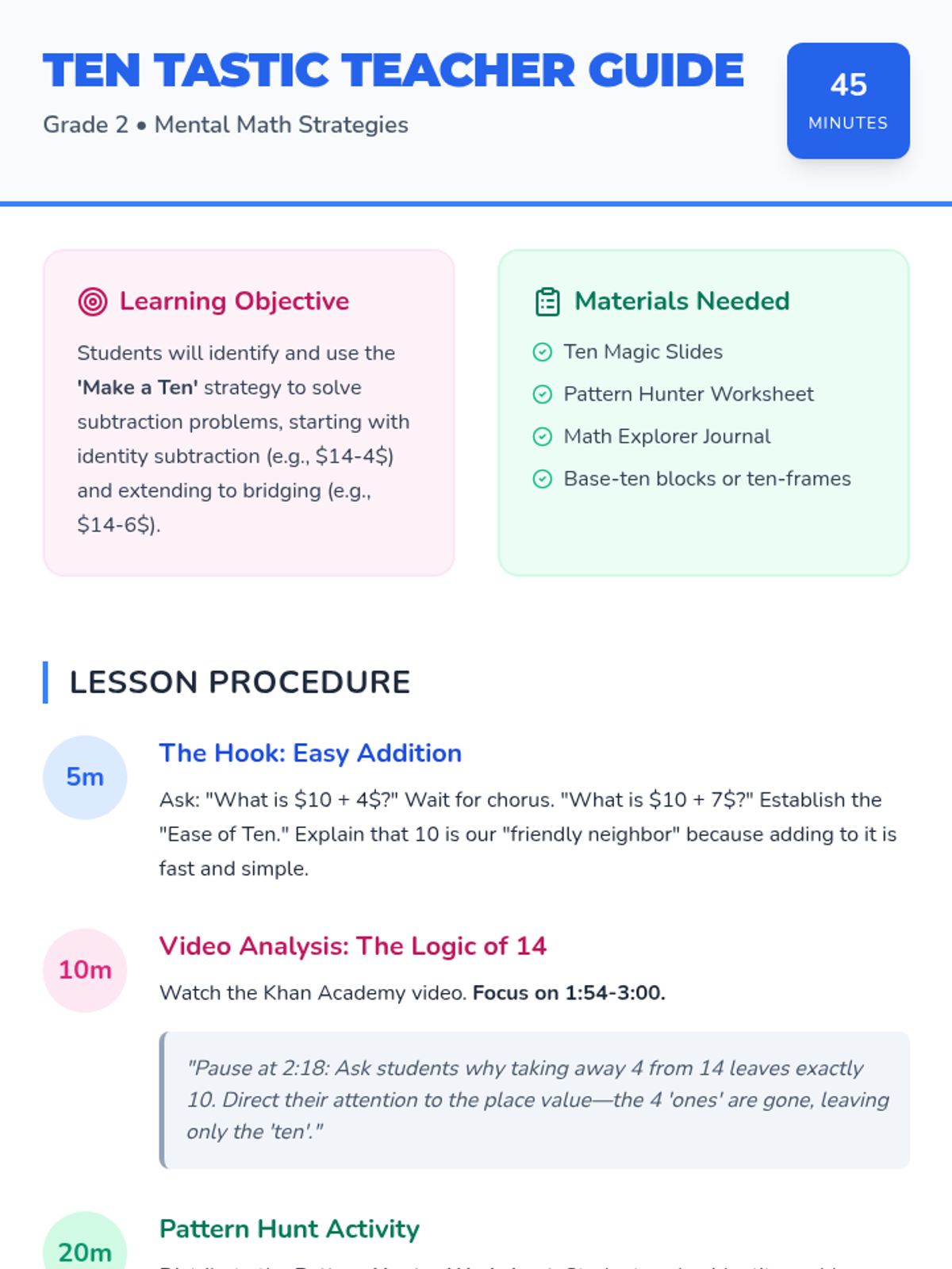 A 2nd-grade math lesson focused on the 'Make a Ten' subtraction strategy, moving from simple identity subtraction (14-4) to bridging through ten (14-6). Includes visual decomposition, pattern hunting, and journaling.